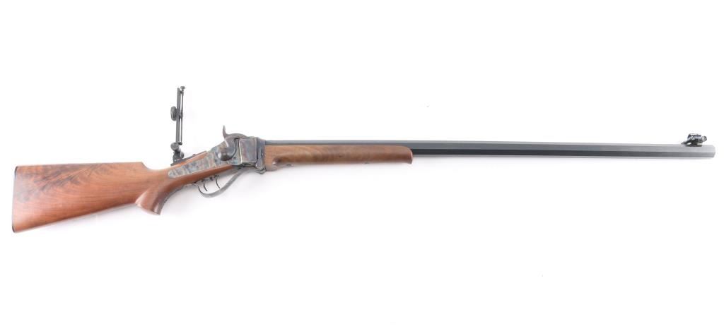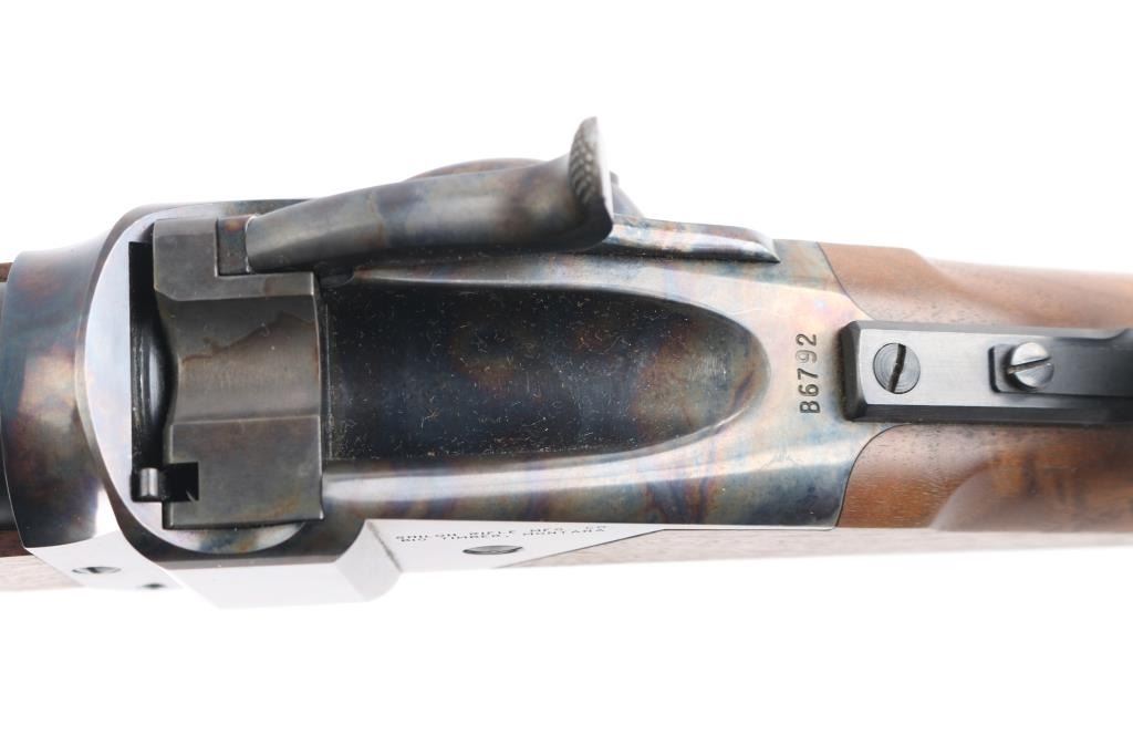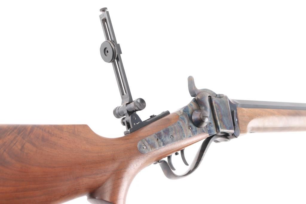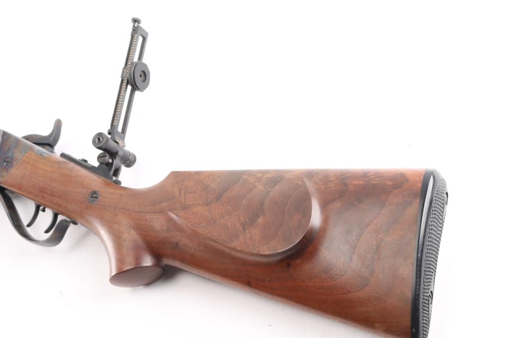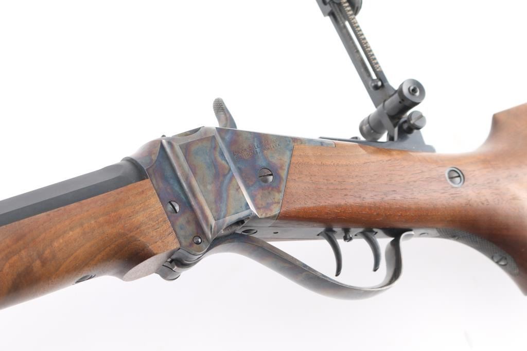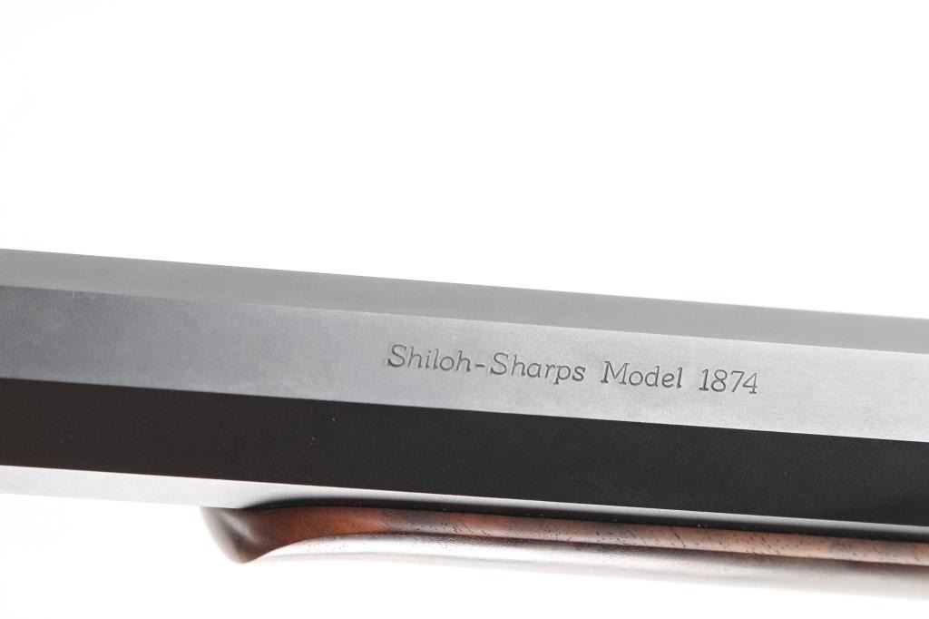 #B6792. High quality American made reproduction of the Sharps Rifle Company Model 1874 falling block single shot sporting rifle chambered in .45 2 1/10". B serial number prefix indicate rifles produced by the Bryan family after they purchased the company in 1991, specifically the first 9999 rifles made by them. Features a matte blued 34" heavy octagon barrel. Special order #112 fully adjustable front sight with aperture insert, sprit level, vernier long range tang sight with elevation adjustment, double set triggers, case hardened receiver, knurled hammer spur, smooth select walnut forend with schnabel tip and semi-pistol grip shoulder stock with right handed cheek rest & synthetic shotgun buttplate. Rifle is in like new, unfired condition, bore is pristine.Condition is NRA Perfect. Modern Firearm.