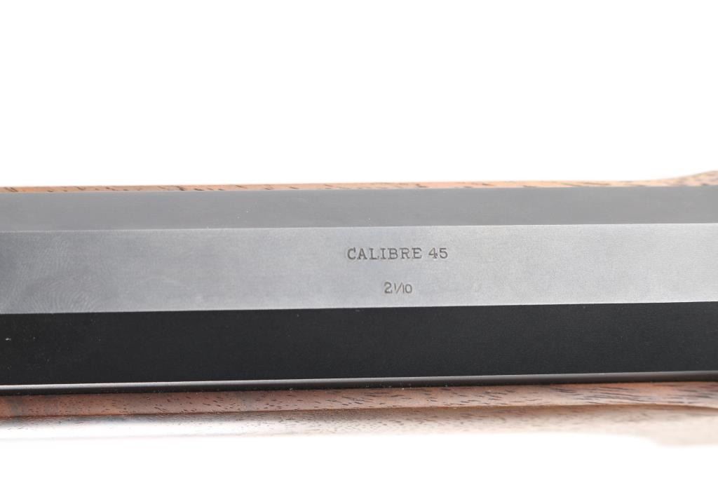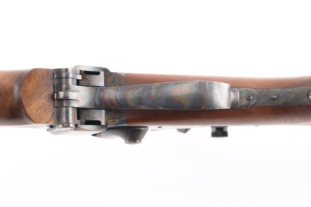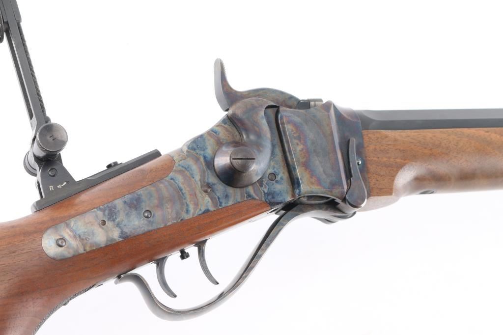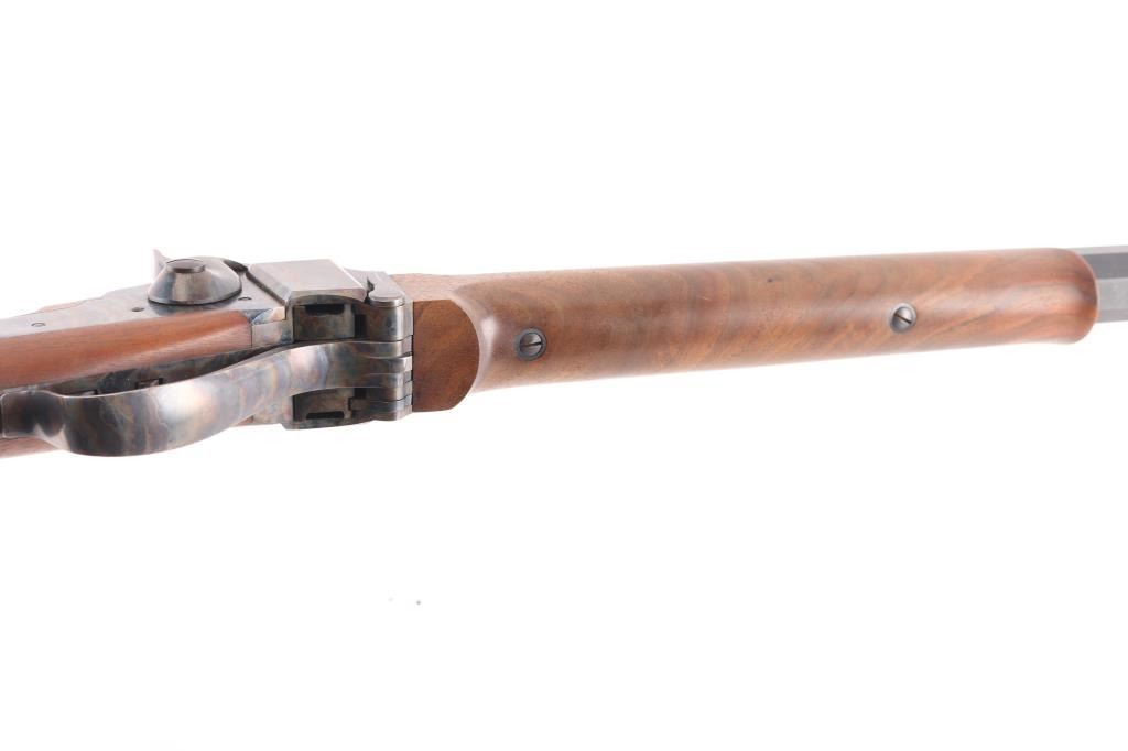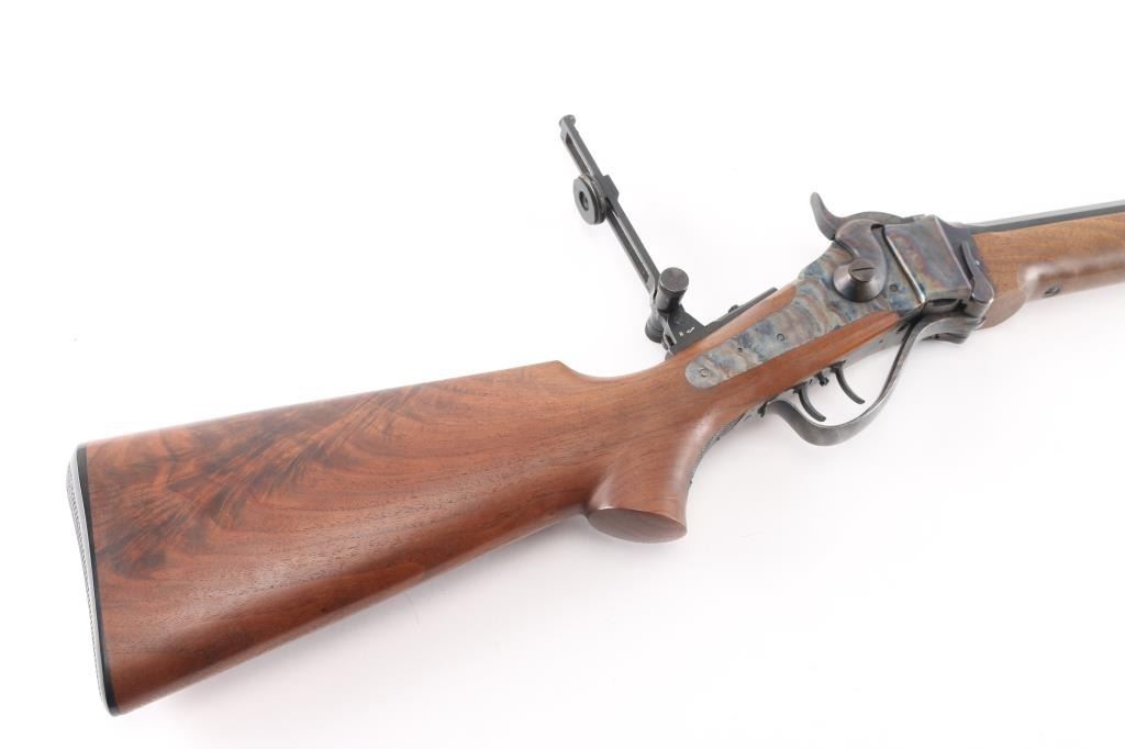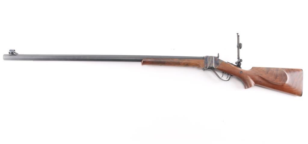 #B6792. High quality American made reproduction of the Sharps Rifle Company Model 1874 falling block single shot sporting rifle chambered in .45 2 1/10". B serial number prefix indicate rifles produced by the Bryan family after they purchased the company in 1991, specifically the first 9999 rifles made by them. Features a matte blued 34" heavy octagon barrel. Special order #112 fully adjustable front sight with aperture insert, sprit level, vernier long range tang sight with elevation adjustment, double set triggers, case hardened receiver, knurled hammer spur, smooth select walnut forend with schnabel tip and semi-pistol grip shoulder stock with right handed cheek rest & synthetic shotgun buttplate. Rifle is in like new, unfired condition, bore is pristine.Condition is NRA Perfect. Modern Firearm.