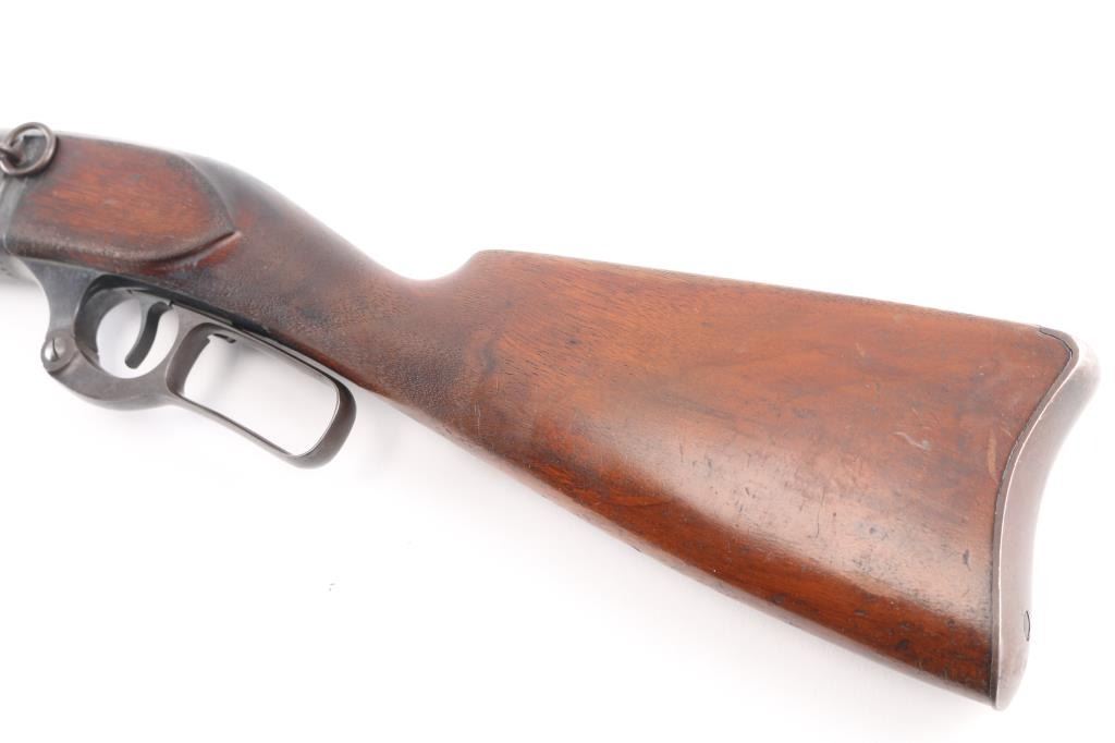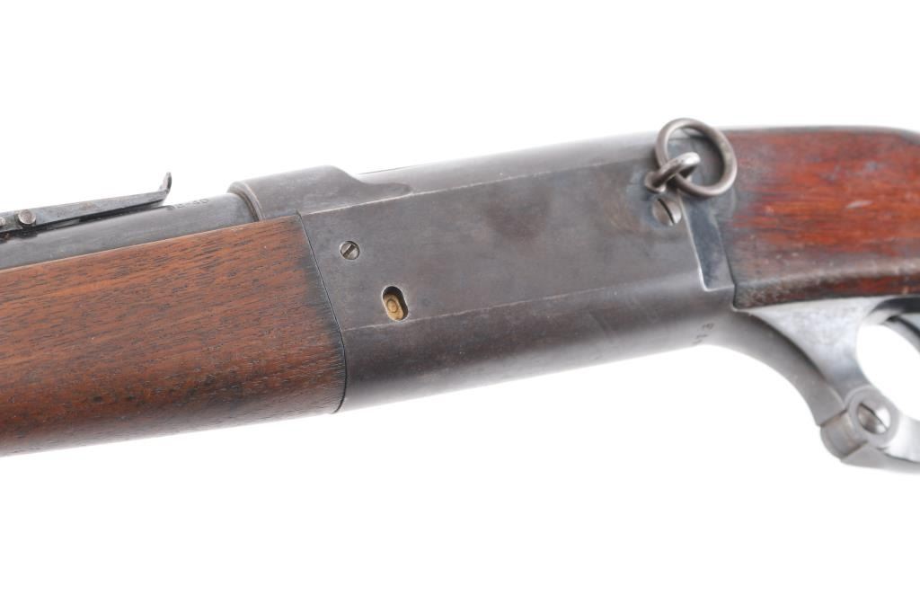 Rare Savage Model 1899 saddle ring carbine, also known as the 1899-F, was manufactured by Savage Arms Company from 1899 to 1922. This one in 1913. Also a rare caliber, production numbers in .32-40 were fairly low and it was dropped in 1917. 20" round barrel, original, dovetailed front blade/white bead , Savage marked adjustable rear sights. five shot rotary magazine with 0-5 brass cartridge counter with window on the left receiver, manual safety in triggerguard, cocking indicator. Bore is very good/bright, strong rifling, straight stock with crescent steel buttplate, schnabel tipped forearm, blue has dulled somewhat with some areas turning a brown patina, edge handling wear but mostly all there, wood is very good/sound with minor scratches/dings.NRA Condition-Good++. C&R Firearm.