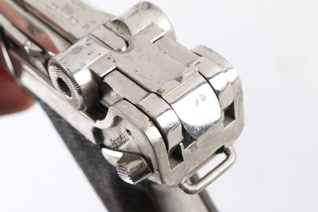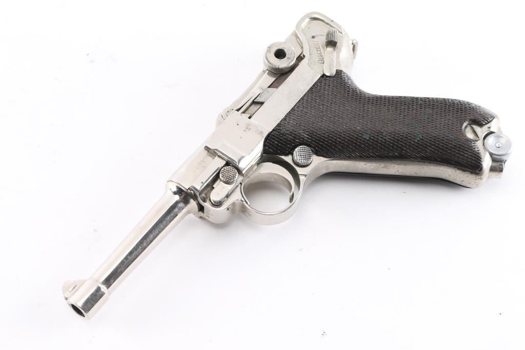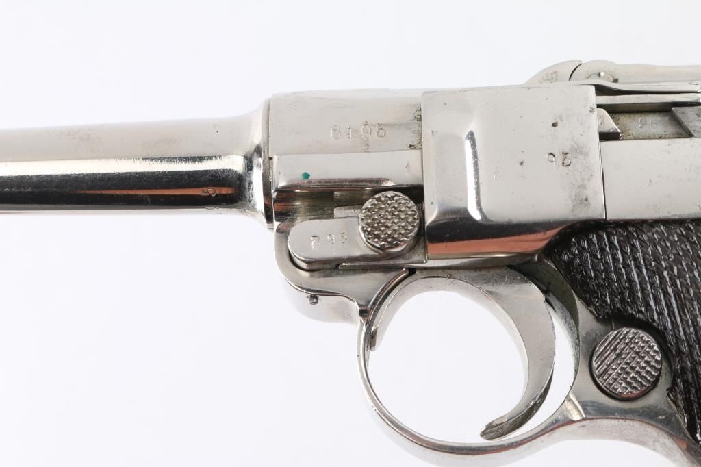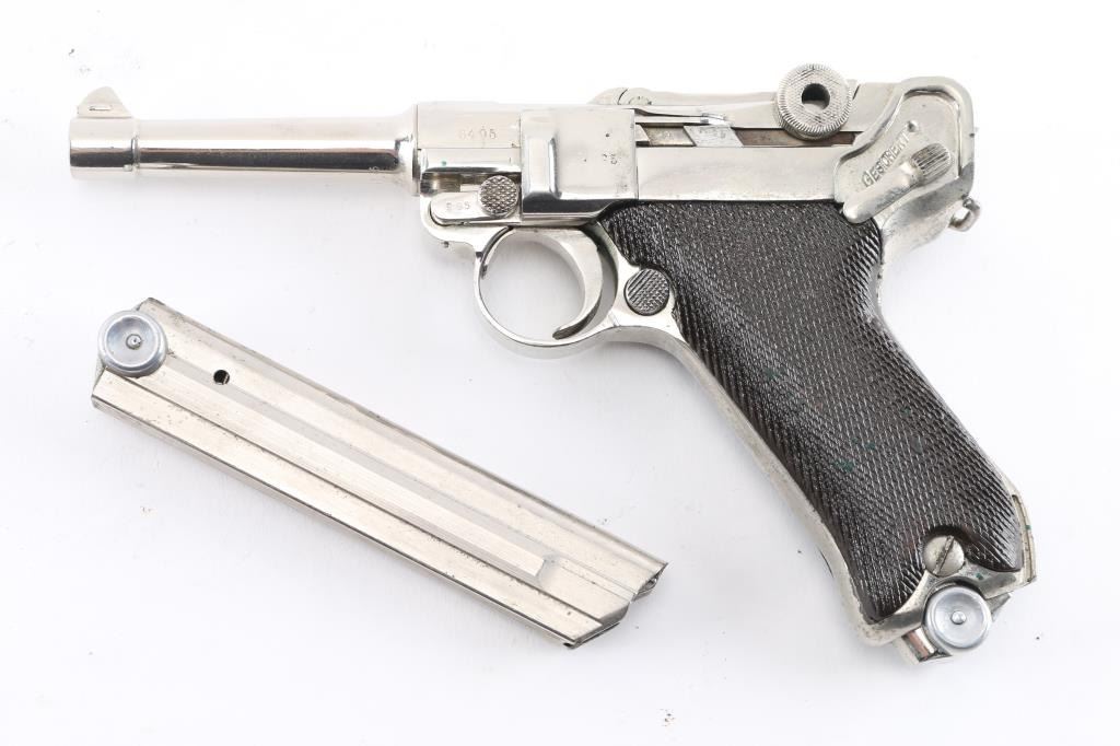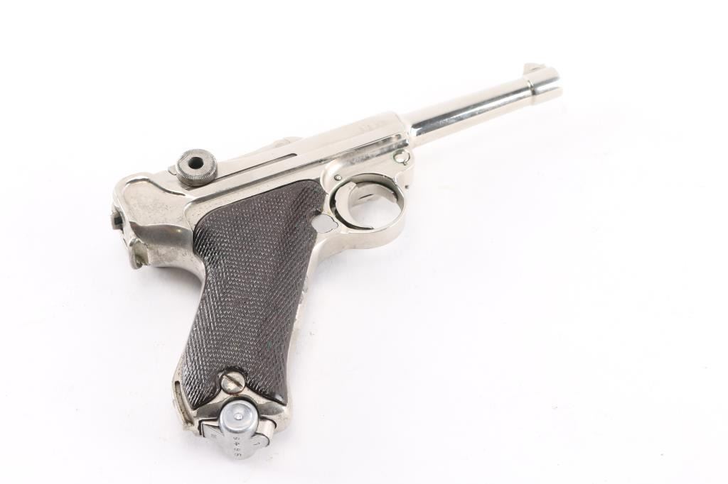SN: 6495g WWI 1917 production German Military Luger pistol, later property marked “1920” for the Weimar Era German military and eventually converted for Police use with added sear safety. Features a later nickel plated finish, 4" tapered barrel, dovetailed inverted V front sight, fixed v notch rear sight on the rear toggle link, smooth crescent trigger, knurled charging knobs on the rear toggle link, manual safety of the left side of the frame, sear safety, push button magazine release, Haenel 8 round magazine with aluminum base, steel frame with lanyard loop & stock lug, and brown painted checkered wood grips. All observed serial numbers are matching with the exception of the connecting pin (stamped “96”). Includes a spare Haenel magazine, both are marked “6495” & “[eagle]/c” and are also marked “1” & “2” respectively. Many parts also bear a “[crown]/RC” inspection mark and the front strap is unit marked but worn with what appears to be “P. 44”. Also includes a black leather flap holster marked “A.FISCHER/BERLIN C.2/1933” and “66506C5”. Pistol retains approximately 90% of its nickel plated finish with scattered losses and handling marks. The a is mechanically sound, the markings are good with some of the smaller proof marks washed out, the bore is bright with good rifling & scattered pin prick pitting and the wood grips are good with a brown painted finish & chip near the safety lever.Condition is NRA Good as Refinished.***C&R Firearm***