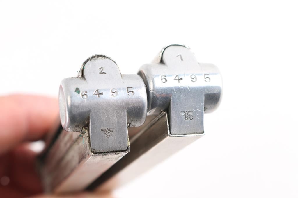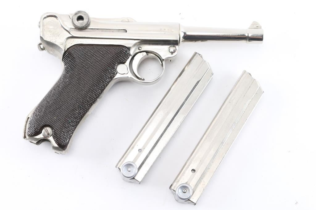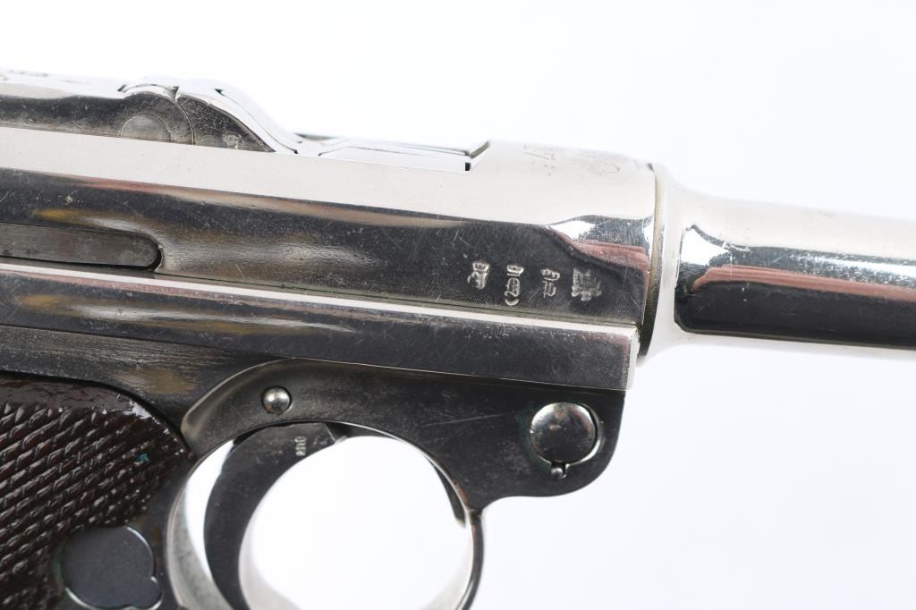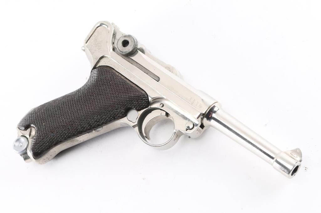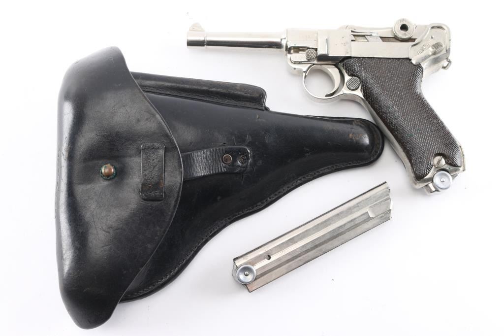SN: 6495g WWI 1917 production German Military Luger pistol, later property marked “1920” for the Weimar Era German military and eventually converted for Police use with added sear safety. Features a later nickel plated finish, 4" tapered barrel, dovetailed inverted V front sight, fixed v notch rear sight on the rear toggle link, smooth crescent trigger, knurled charging knobs on the rear toggle link, manual safety of the left side of the frame, sear safety, push button magazine release, Haenel 8 round magazine with aluminum base, steel frame with lanyard loop & stock lug, and brown painted checkered wood grips. All observed serial numbers are matching with the exception of the connecting pin (stamped “96”). Includes a spare Haenel magazine, both are marked “6495” & “[eagle]/c” and are also marked “1” & “2” respectively. Many parts also bear a “[crown]/RC” inspection mark and the front strap is unit marked but worn with what appears to be “P. 44”. Also includes a black leather flap holster marked “A.FISCHER/BERLIN C.2/1933” and “66506C5”. Pistol retains approximately 90% of its nickel plated finish with scattered losses and handling marks. The a is mechanically sound, the markings are good with some of the smaller proof marks washed out, the bore is bright with good rifling & scattered pin prick pitting and the wood grips are good with a brown painted finish & chip near the safety lever.Condition is NRA Good as Refinished.***C&R Firearm***