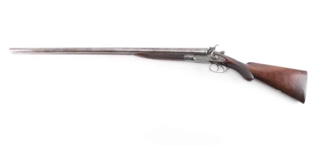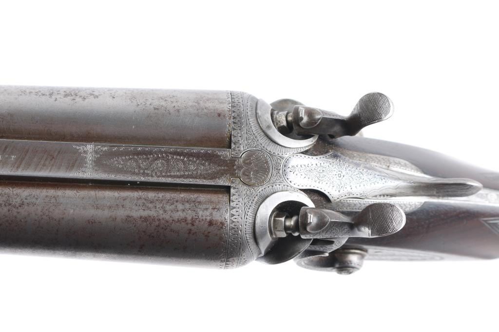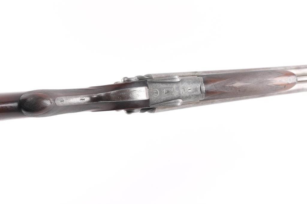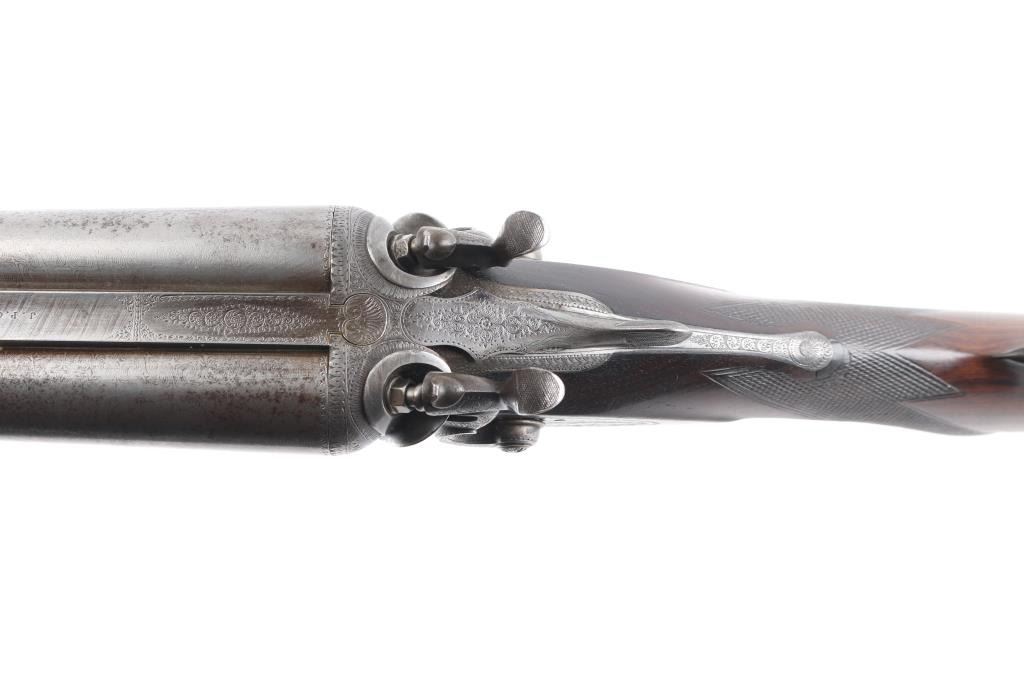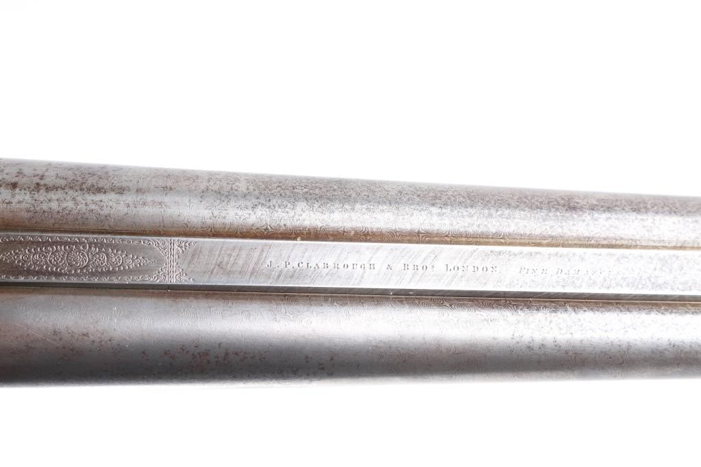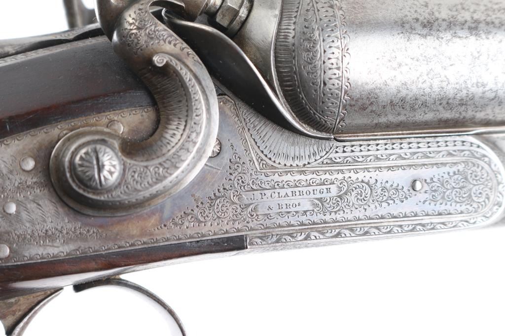 J.P. Clabrough London fine Damascus marked double barrel exposed hammer shotgun serial #3362, made about 1876. Consigned from the Estate of Larry Shelton author J. B. Claborough Birmingham gun maker, 10ga with 30" barrels, 46 7/8" overall, 14 1/2" pull, weight 9.55 lbs. Finely scroll engraved with dogs on locks. Generous amounts of original finish remaining with balance a smooth gray patina. Select checkered wood stocks in very good condition. Action tight and bores bright. A 7 1/2 to 8 on 1-10 scale.Condition is NRA Very Good***Antique Firearm***