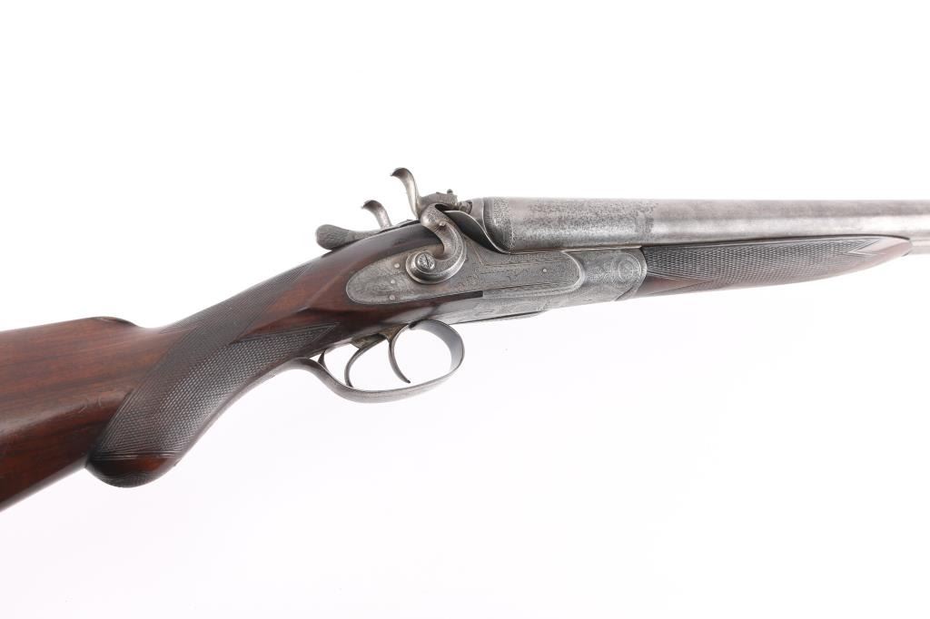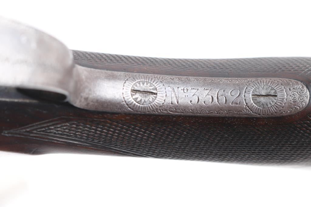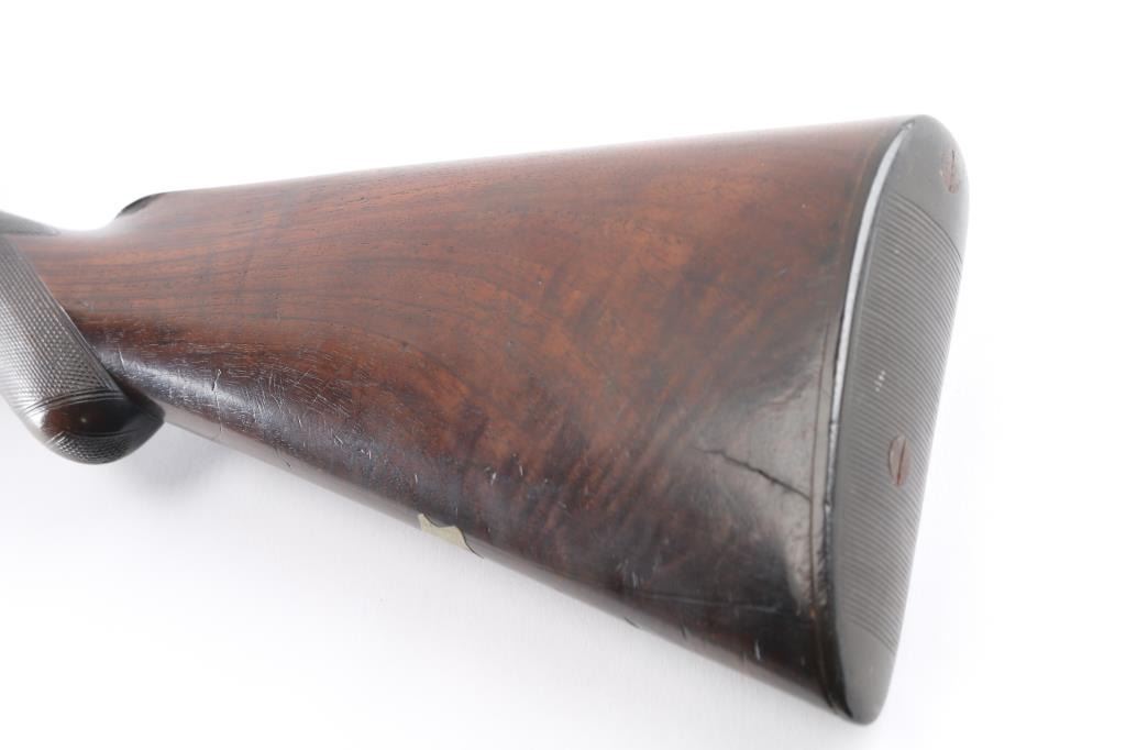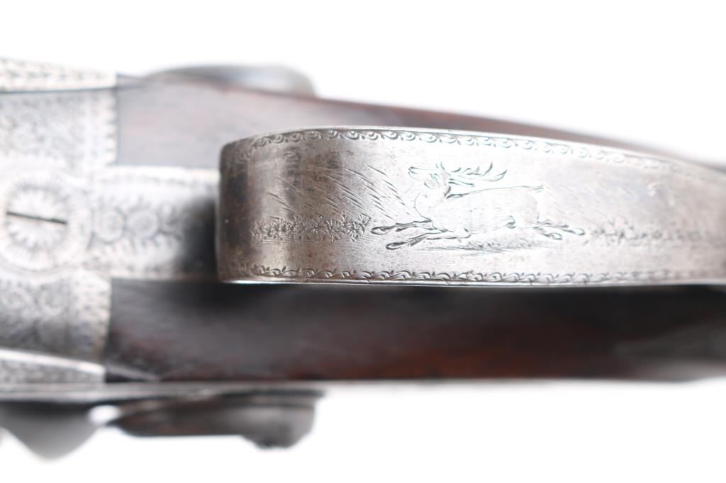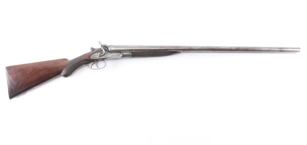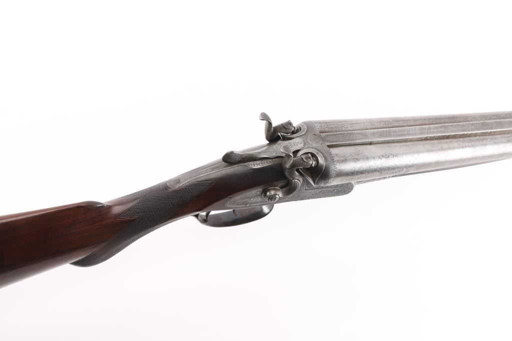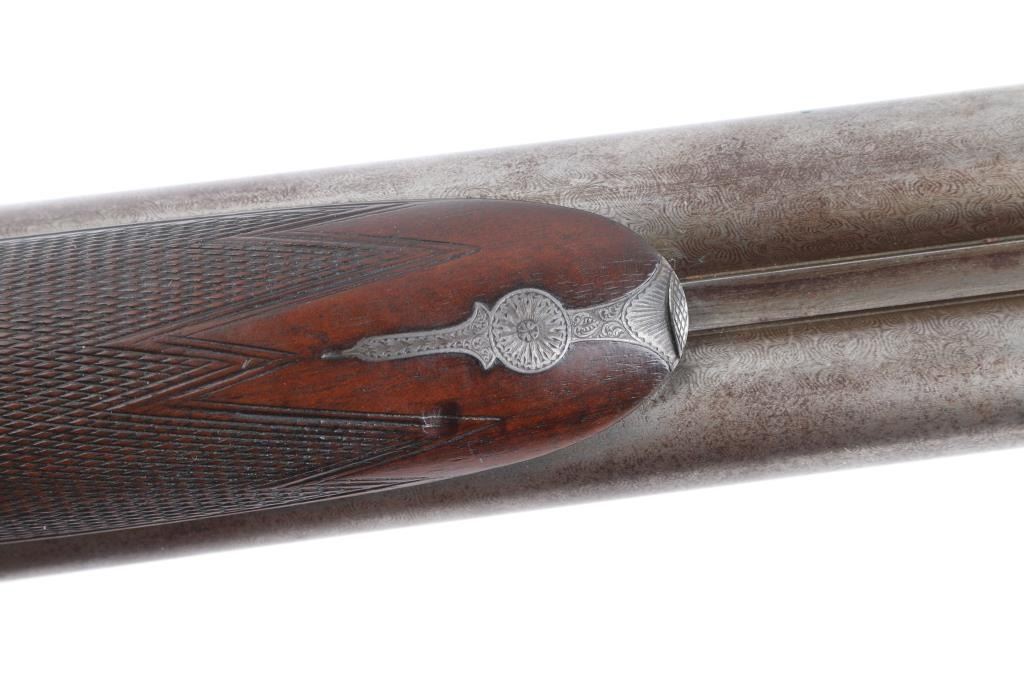 J.P. Clabrough London fine Damascus marked double barrel exposed hammer shotgun serial #3362, made about 1876. Consigned from the Estate of Larry Shelton author J. B. Claborough Birmingham gun maker, 10ga with 30" barrels, 46 7/8" overall, 14 1/2" pull, weight 9.55 lbs. Finely scroll engraved with dogs on locks. Generous amounts of original finish remaining with balance a smooth gray patina. Select checkered wood stocks in very good condition. Action tight and bores bright. A 7 1/2 to 8 on 1-10 scale.Condition is NRA Very Good***Antique Firearm***