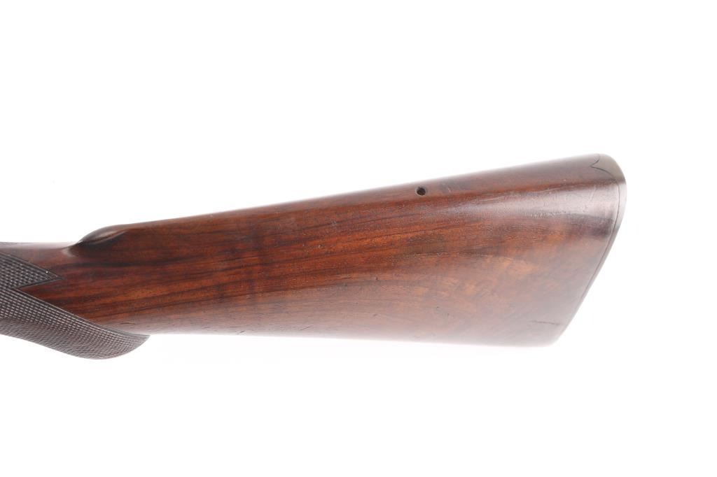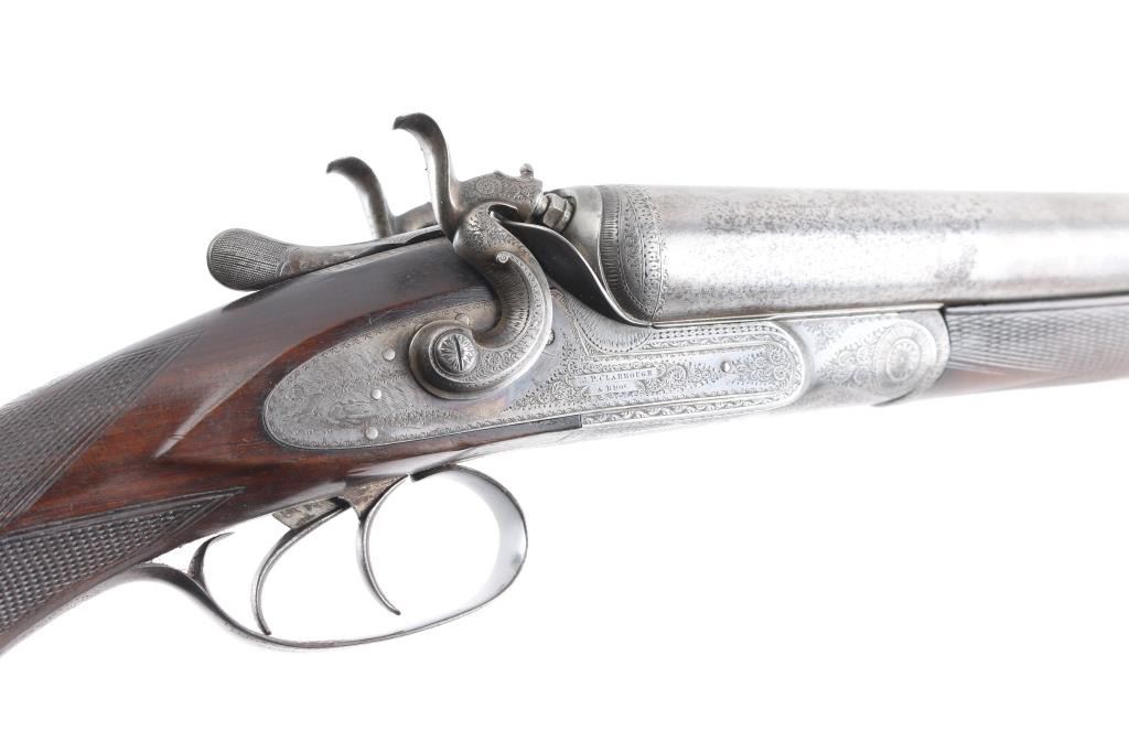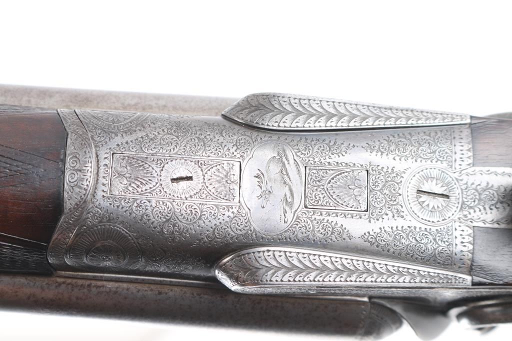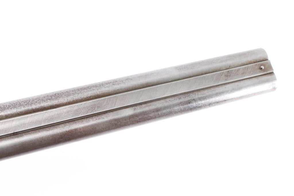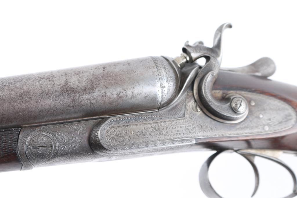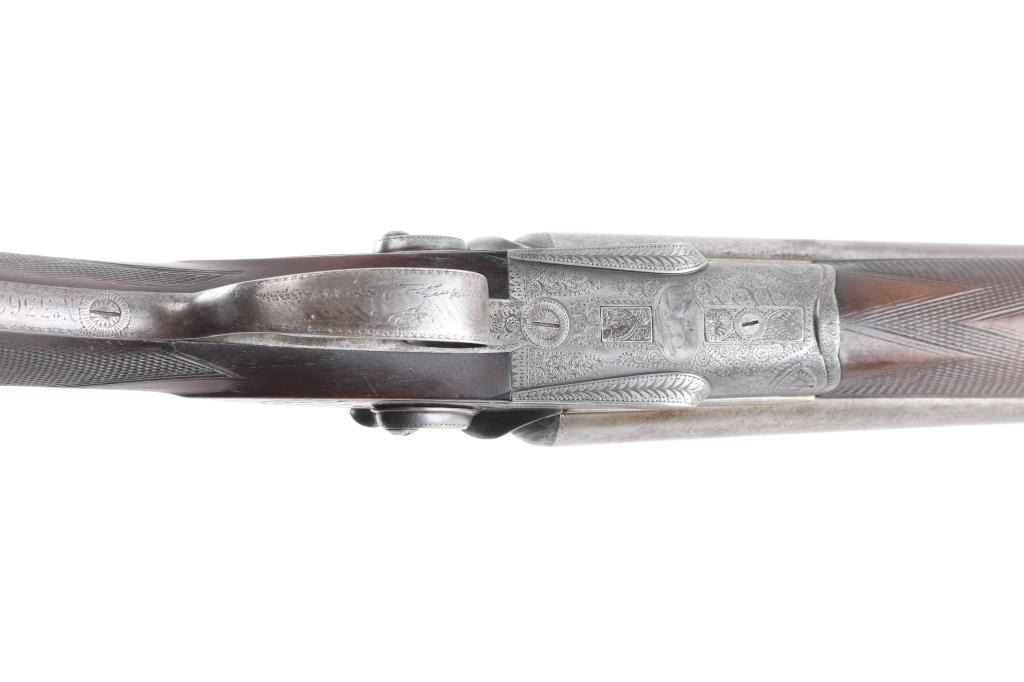 J.P. Clabrough London fine Damascus marked double barrel exposed hammer shotgun serial #3362, made about 1876. Consigned from the Estate of Larry Shelton author J. B. Claborough Birmingham gun maker, 10ga with 30" barrels, 46 7/8" overall, 14 1/2" pull, weight 9.55 lbs. Finely scroll engraved with dogs on locks. Generous amounts of original finish remaining with balance a smooth gray patina. Select checkered wood stocks in very good condition. Action tight and bores bright. A 7 1/2 to 8 on 1-10 scale.Condition is NRA Very Good***Antique Firearm***