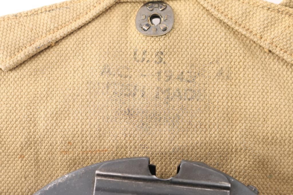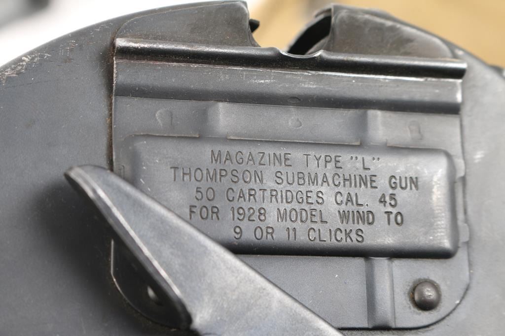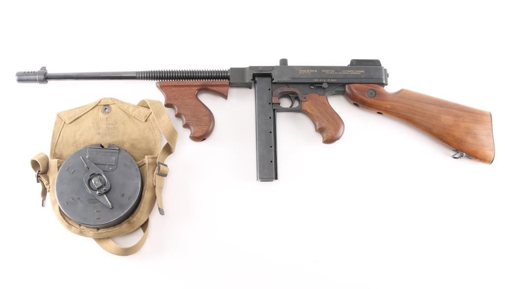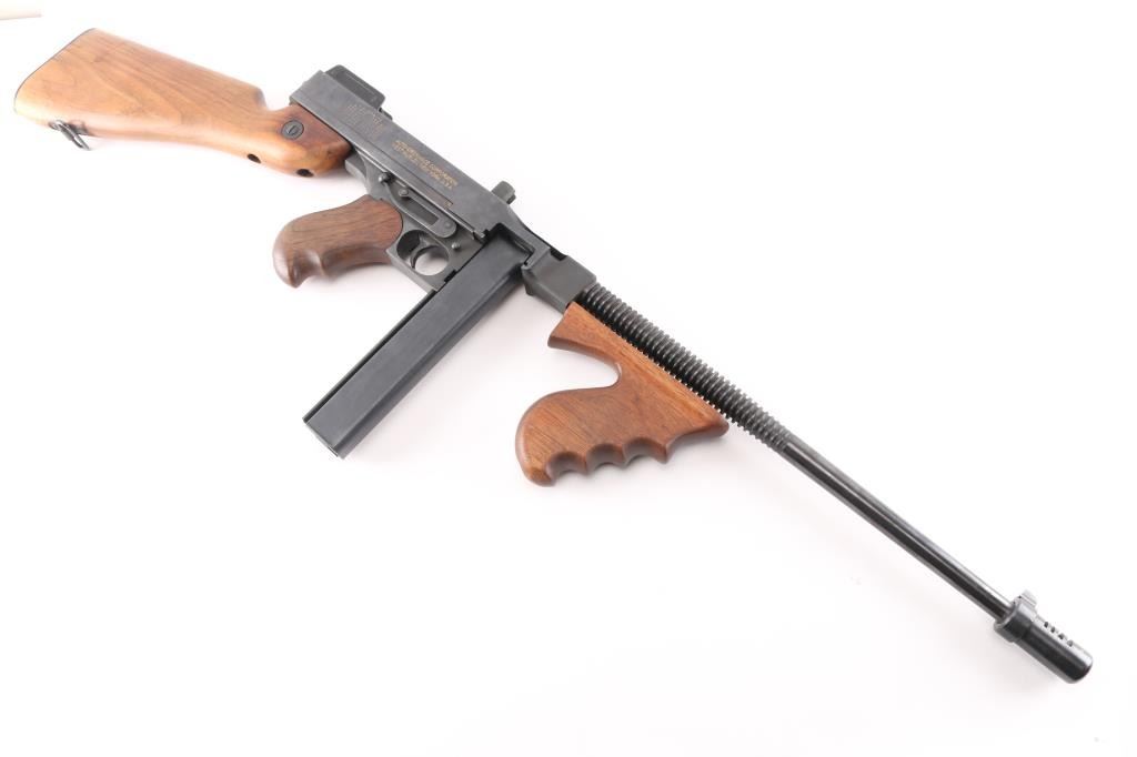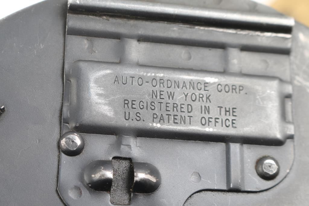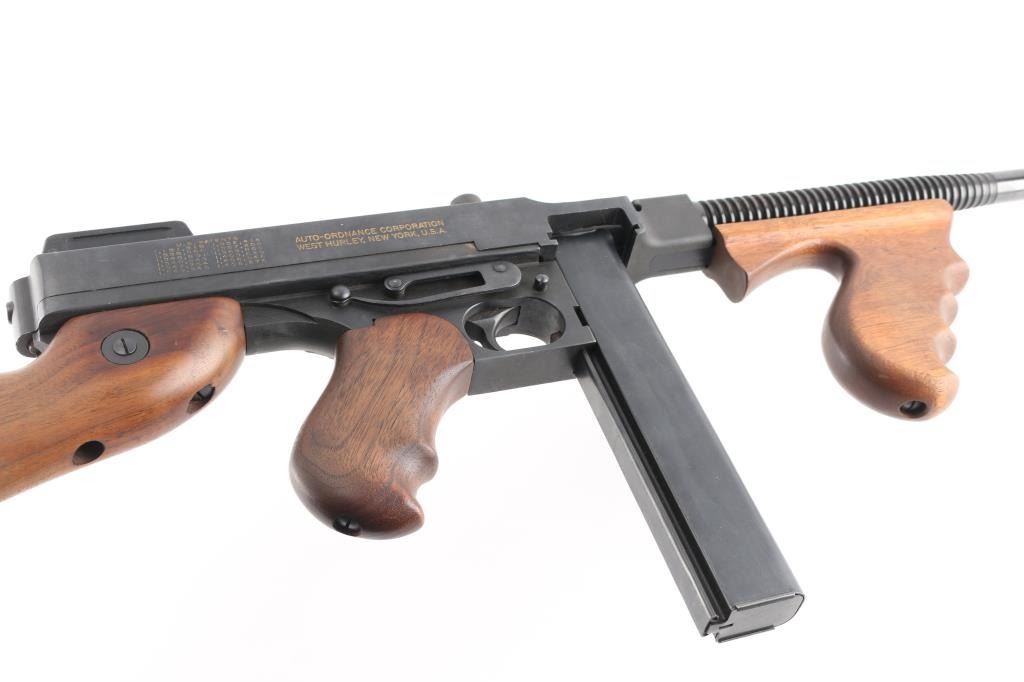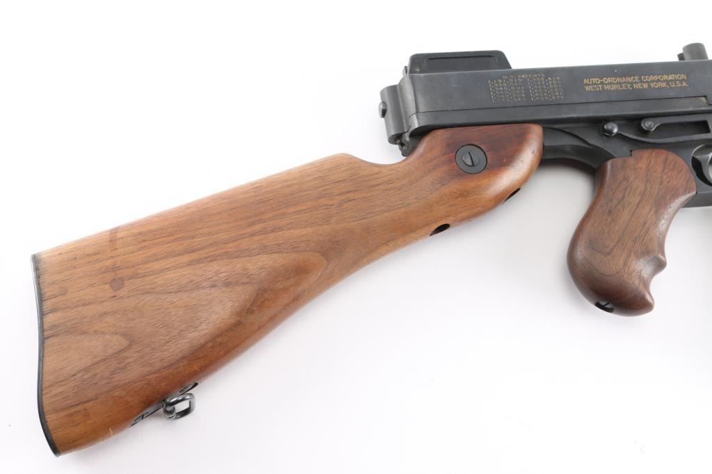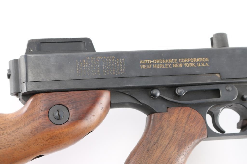 Semi-Automatic version of the Thompson Sub-Machine Gun. The "Chicago Typewriter". 18" finned barrel with pinned Cuts compensator. Blade front and flip ladder, adjustable rear sights. Blued finish with polished American Walnut fixed stock with trapdoor steel buttplate and vertical foregrip. All correct Auto-Ordnance markings , including the "Thompson Trade Mark" bullet on the top receiver, and compensator. Sling swivel attached. Bore appears excellent/bright. Action is crisp/tight. Blue is about 98% with very minor edge wear. Wood is excellent. Comes with one unmarked 30 rd stick magazine. and a Auto-ordnance 50 rd drum magazine in USGI pouch marked "U.S. 1943 British made The drum magazine Shipment Prohibited by state laws in CA, CO, CT, Washington DC, HI, MA, MD, NJ, NY, VT, NYC, Chicago IL, Aurora IL, Franklin park IL, Oak Park IL, Riverdale IL.NRA Condition-Excellent. Modern Firearm.