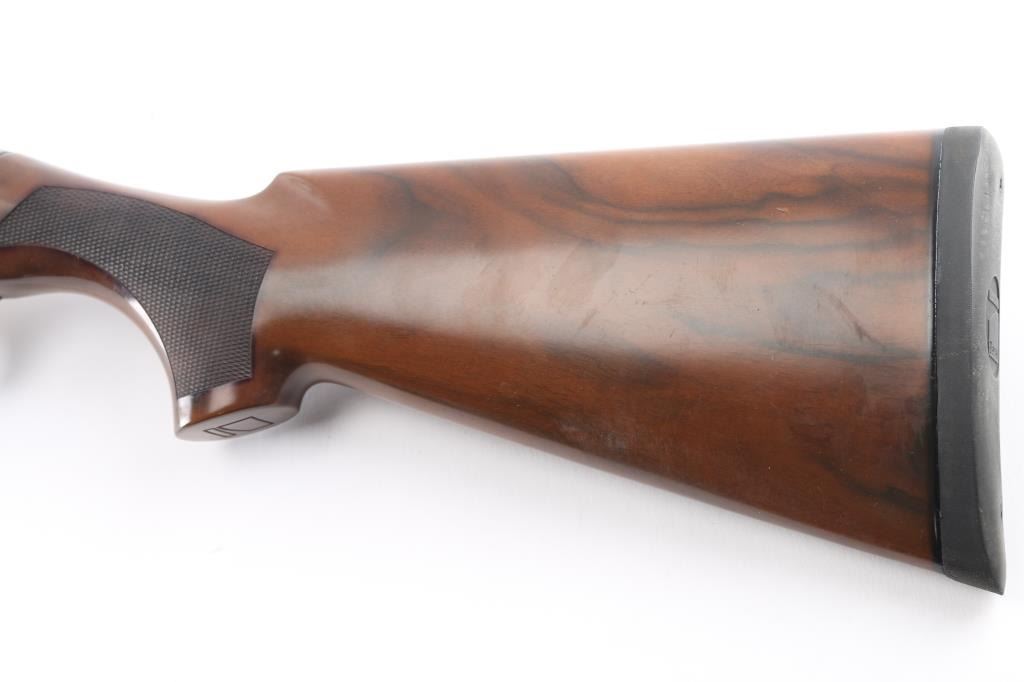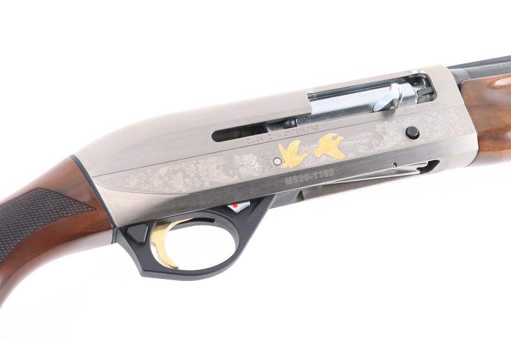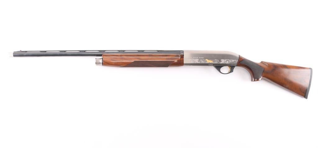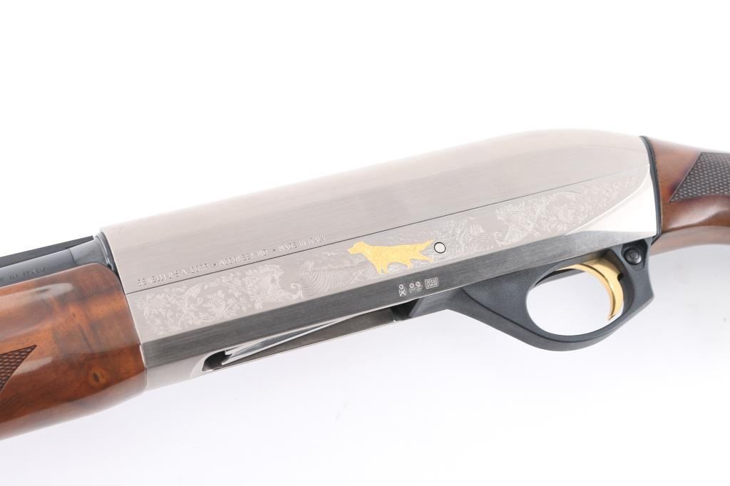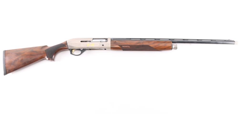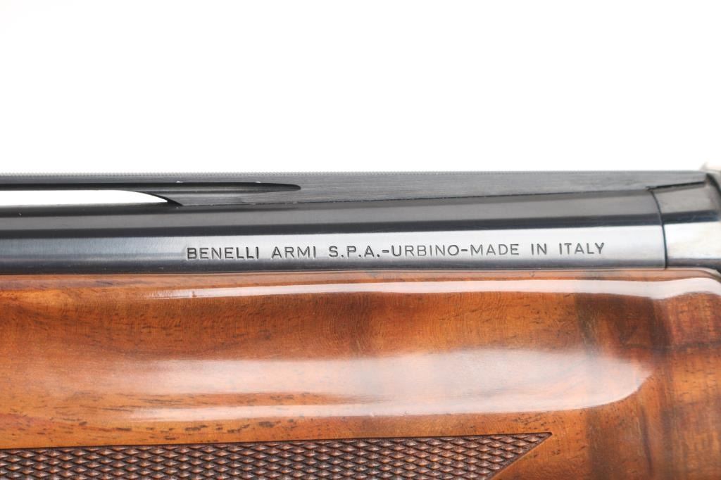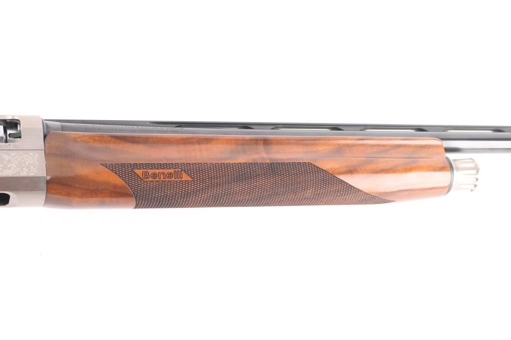 Italian light weight semiautomatic shotgun imported by Benelli U.S.A.. Features a beautifully figured, AA-grade, oil finished walnut stock, and an floral engraved nickel-plated alloy receiver with gold toned grouse on on side and pointer on the other. Checkered wood forend, semi-pistol grip stock with checkered wrist panels, factory solid rubber recoil pad, 26" vent rib barrel, front sight holds red fiber optic insert, steel mid bead, accepts choke tubes (SK installed), manual safety. Accepts 2-3/4" or 3" shells. Bore is pristine, metal finish, & wood are excellent, like new condition.Condition is NRA Excellent. Modern Firearm.