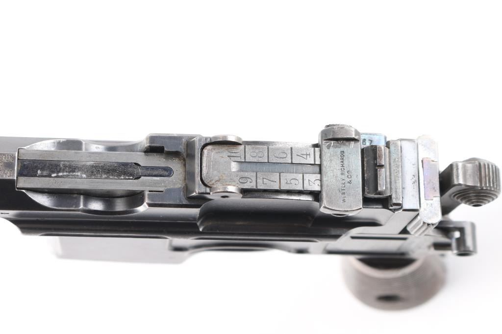 c.1896 Semi-auto pistol marked Westley Richards on sight bar #5667. Fine condition retaining 80% plus original blue with very good wood grips. Minor scratches, mars and loss of finish on sides of BBL from holster or wooden stock. Good and sharp markings with correct small parts and screws. Good mechanically with very good bore showing minor pitting. Dovetailed bead top blade front sight (no bead) Note, similar to one purchased in London by Winston Churchill that was lost in South America. (Westley Richards may have information on this number.) Condition is NRA Fine.*** Antique Firearm ***