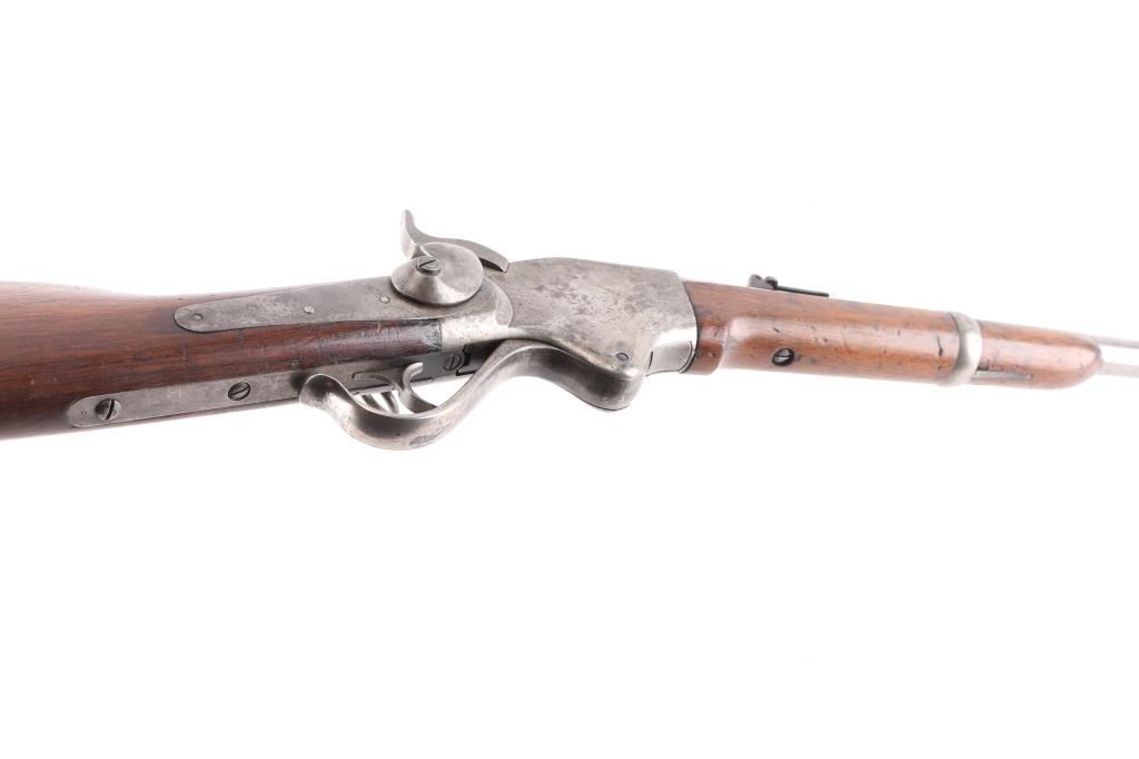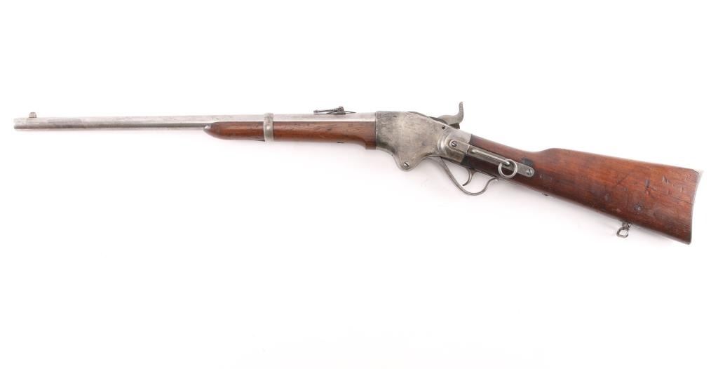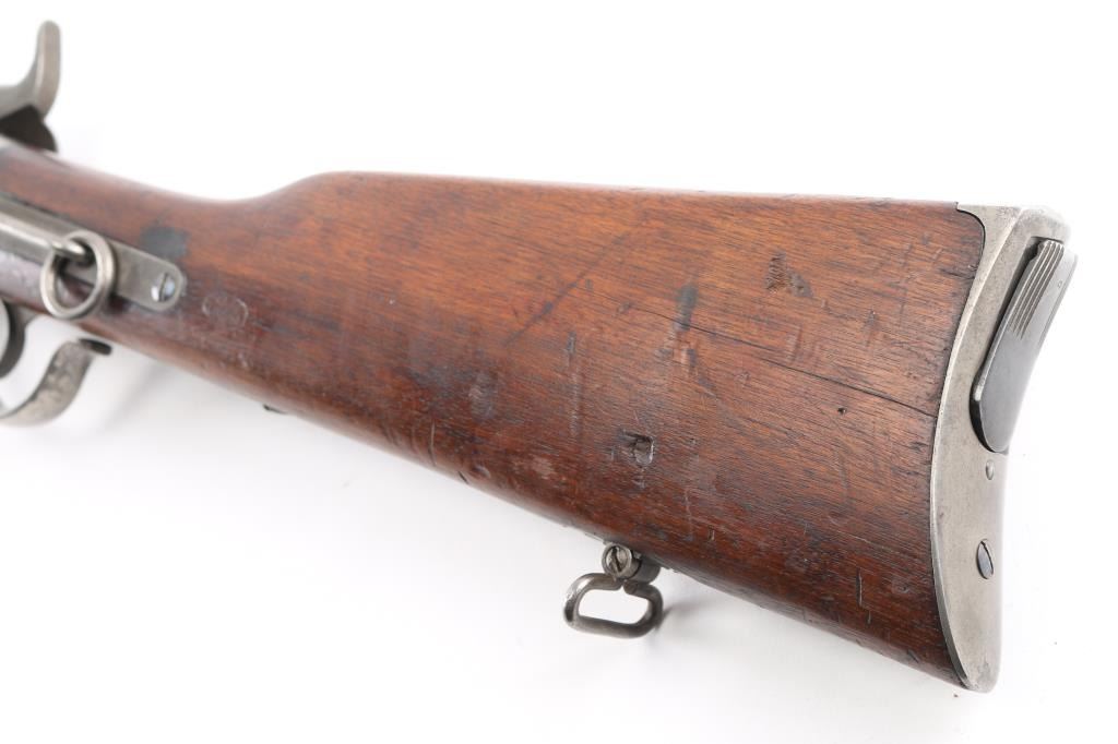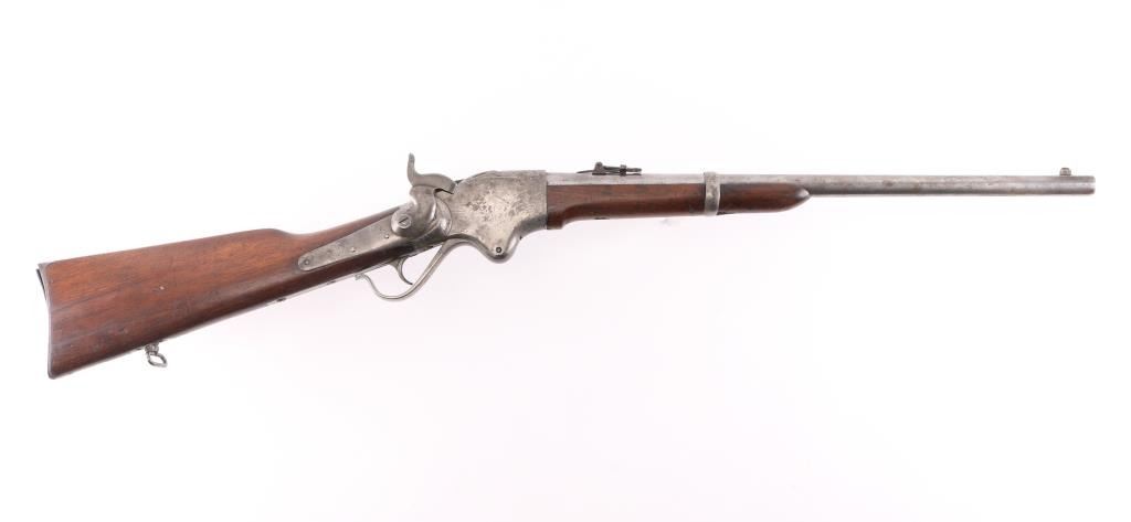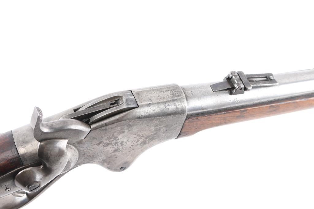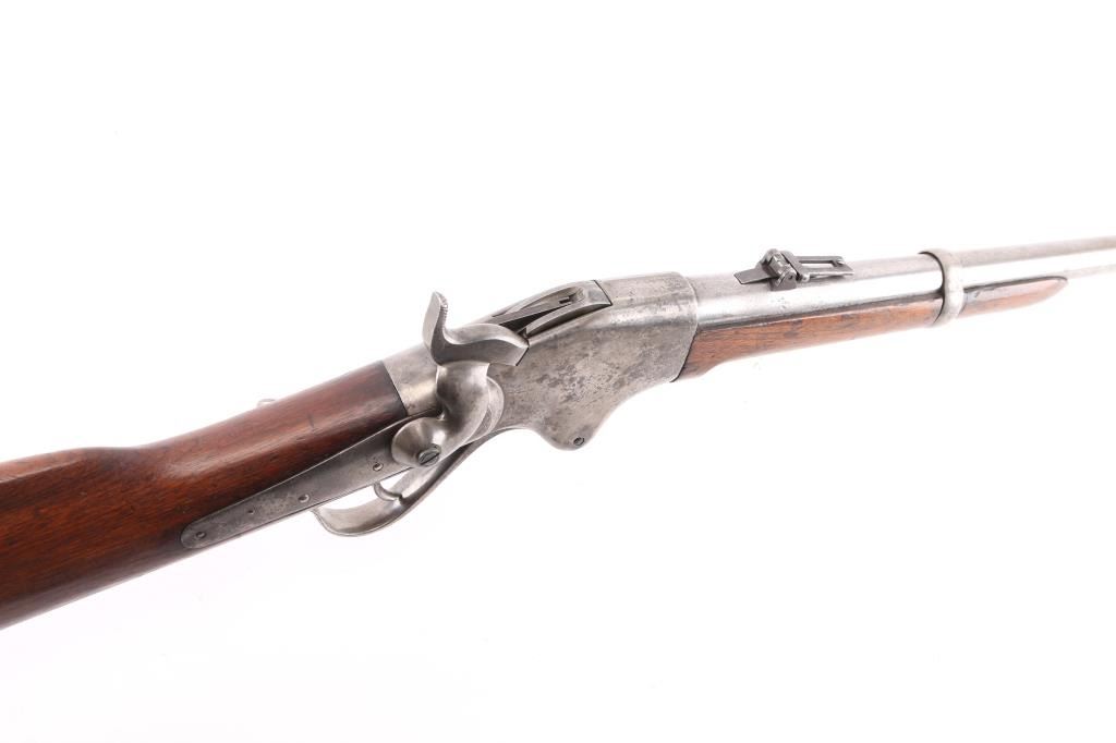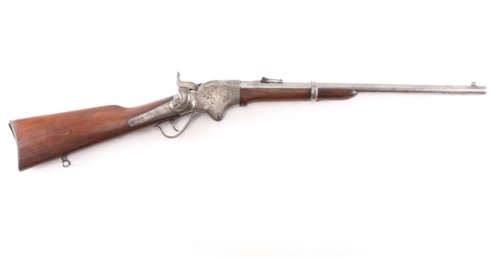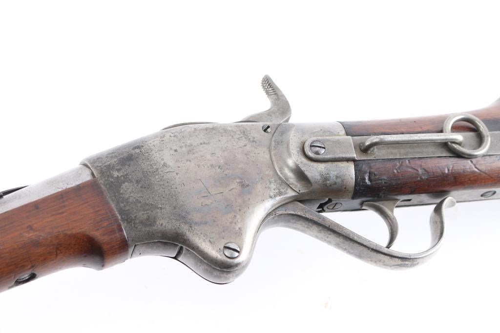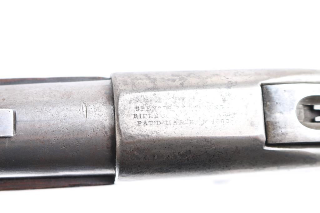Civil War Model w/ Post-War Alteration Altered by Springfield Armory 1867-74 for use in the Indian Wars., 3 grooved bore instead of 6. , no stabler cut-off, correct "ESA" cartouche on left wrist. U.S. military contact breech-loading lever action repeating rifle chambered in .50 Rimfire, manufactured by the Spencer Repeating/Rifle Co. Boston, Mass, circa 1863-1865. Features a 22" barrel, raised blade front sight, flip-up ladder rear sight graduated to 800 yards, rounded trigger, knurled hammer spur, 7 round tube magazine located in the buttstock, sling bar with saddle ring, J shaped finger lever, smooth walnut forend with single barrel band, and straight grip shoulder stock with metal carbine buttplate, and sling swivel. Rifle retains minor traces of finish with the vast majority of the metal surfaces in the white with scattered areas of light pitting. Drop block/hammer action is sound, the bore is excellent/bright. address, patent dates on the chamber flat are partially eroded from handling and the wood stocks are good, sound with digs/dents.NRA Condition-Very Good as Antique Firearm.