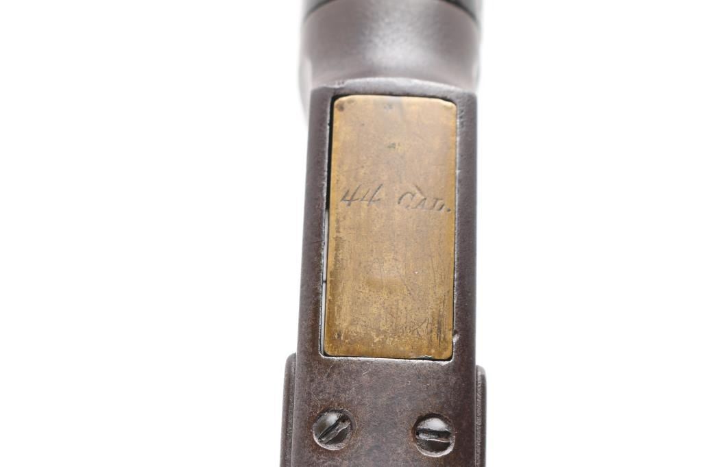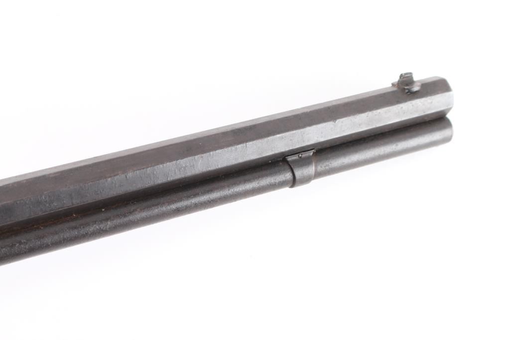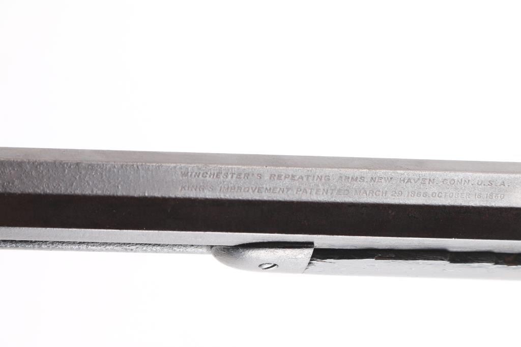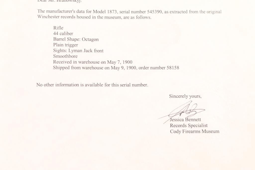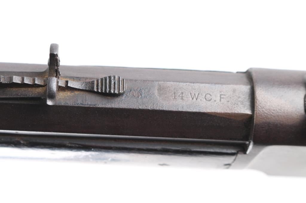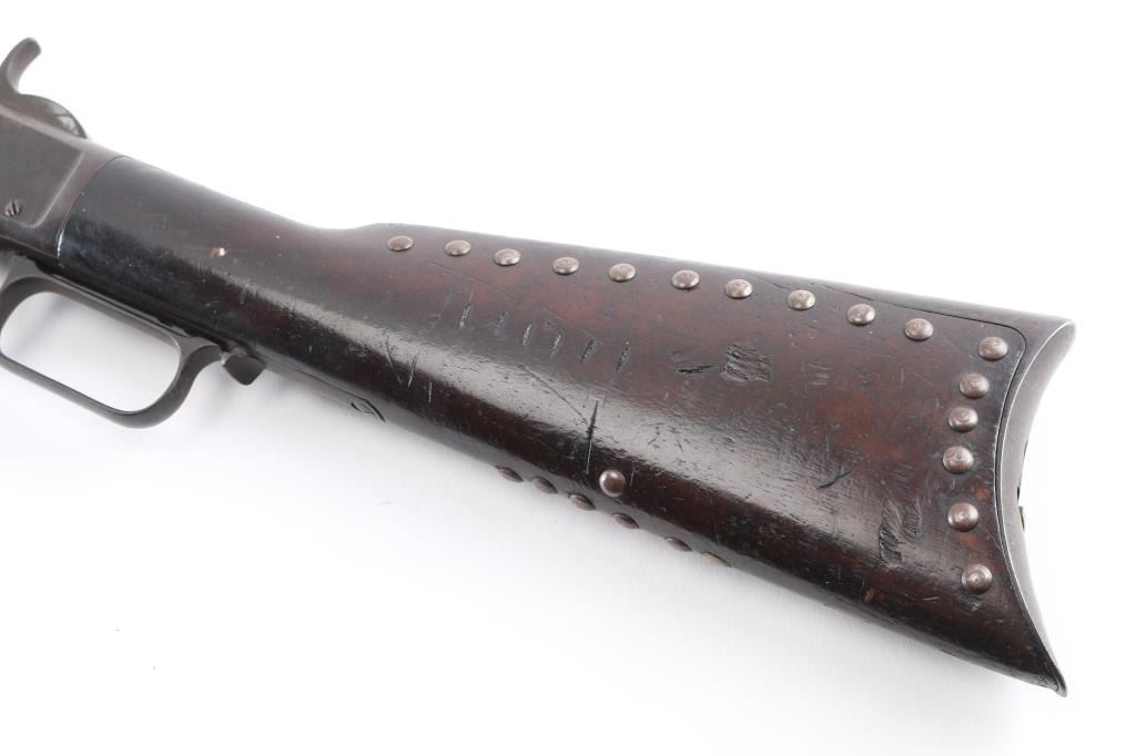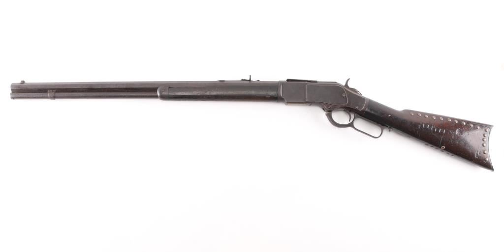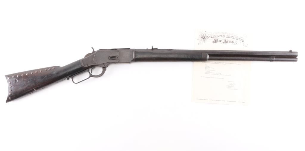 Factory letter confirms 44 caliber, octagon barrel, plain trigger, Lyman Jack front sight, smoothbore, received May 7, 1900, shipped May 9, 1900, to order number 58158. Buffalo Bill copy and a host of other wild west performers and shows were at the height of popularity at the turn of the century when this rare gun was made. A popular show trick was shooting glass balls full of feathers cast into the air and creating a dramatic effect upon breaking. Very few factory smooth bores were made (estimated about 50 or less) and this is the only example viewed by this cataloger with an octagon barrel as they are normally round barrels, in my experience. This 73 shows decorative brass tacks in the buttstock and is in good condition, showing a brown patina finish with light to moderate surface erosion and minor pitting. The address and markings are good and legible. The dust cover and small parts match in patina and age and the metal has an uncleaned "as found" authentic appearance. The stocks are fair to good with losses on both sides of the forend, dings, mars, scratches and imperfections of this type associated with show use. Six notches are purposely carved in left center of buttstock for an unknown commemoration. 44 caliber on lifter clearly visible and tacks show a natural patina matching overall appearance, mechanics tight with good shiny bore. An important rarity that may be identifiable to original owner with photos because of the tack pattern in the stock or correlation of the Winchester order number with another gun.NRA Good to Very Good Condition. Modern Firearm.