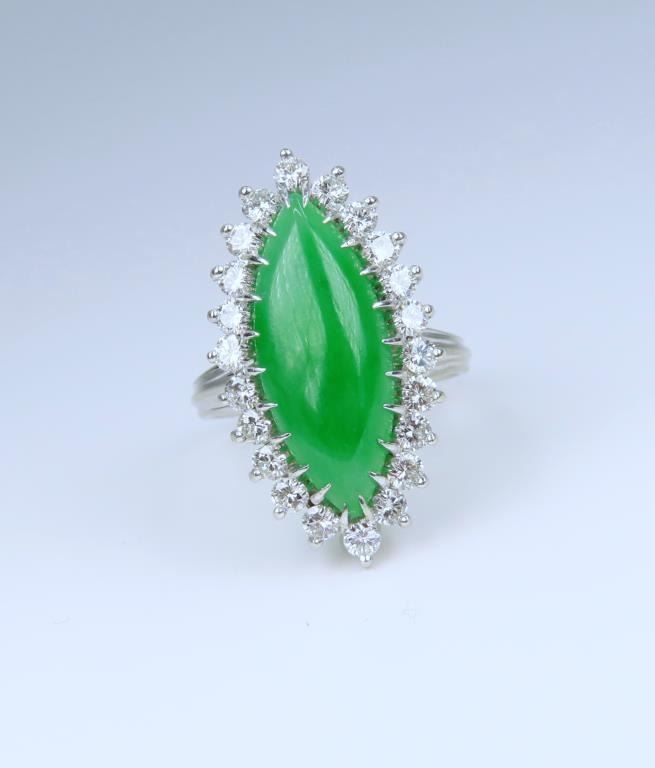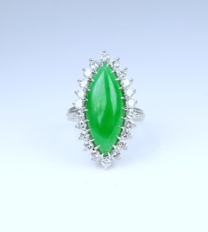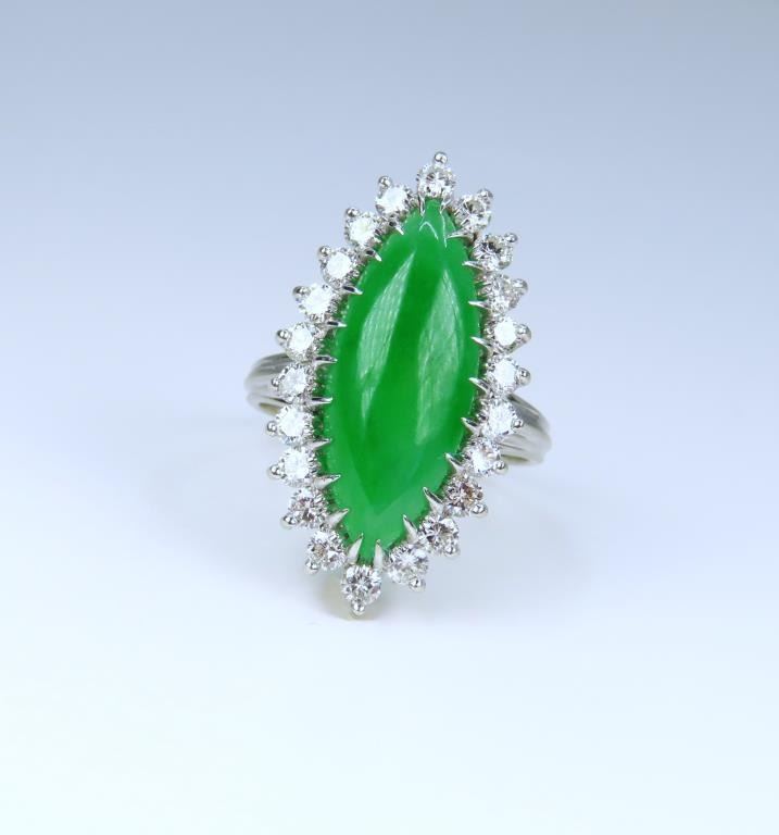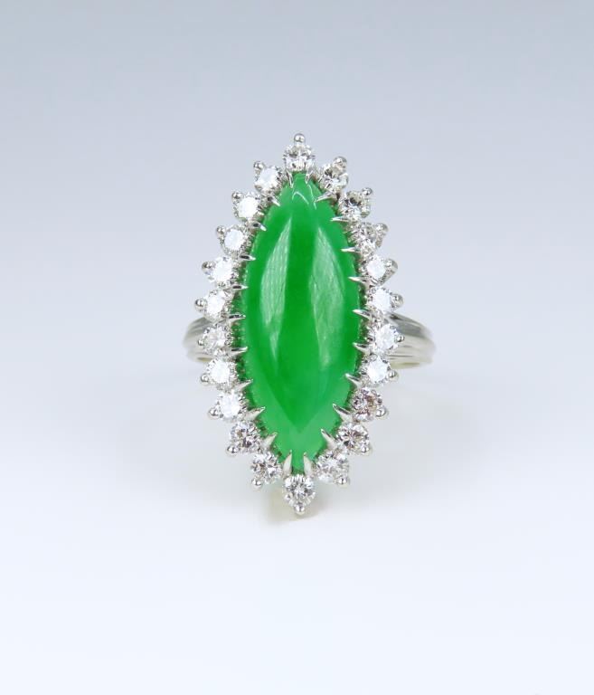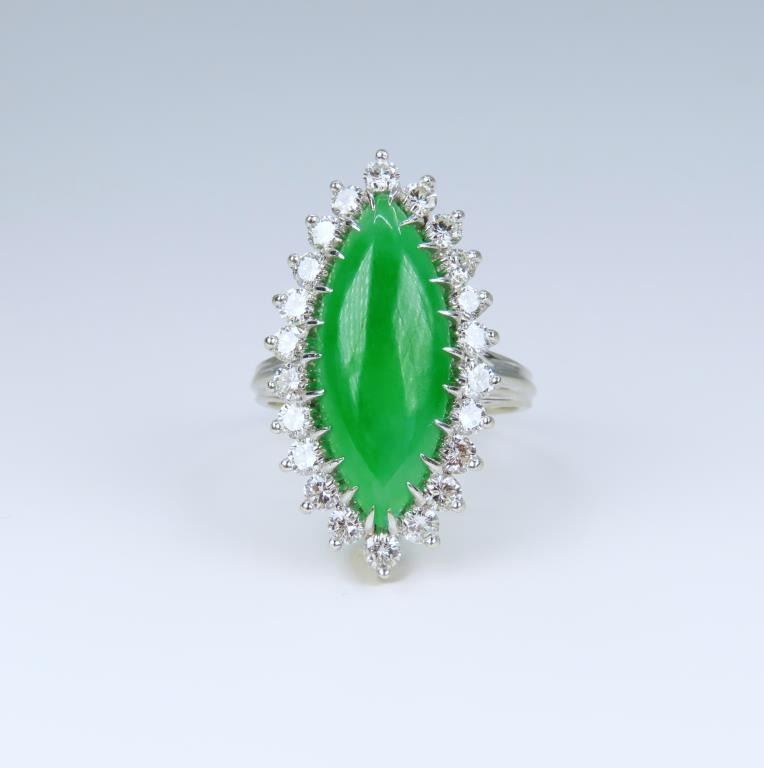 and Diamond Ring featuring a marquise shape, intense Apple Green Jade piece weighing approx. 8.00-10.00 carats, measuring approx. 22.00 mm x 10.00 mm in diameter, framed by 22 ‘IDEAL’ cut Diamonds weighing approx. 1.50-1.80 carats with F-G colors and VVS/ VS clarity set in a 14 karat white gold custom made setting, ring size 7. Retail $15,000-$20,000.