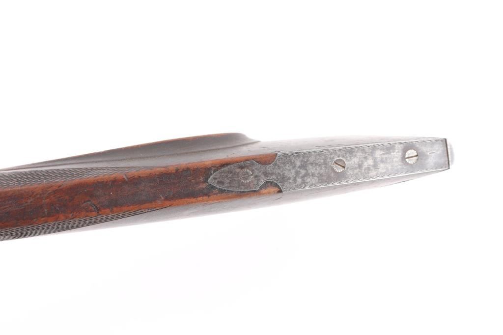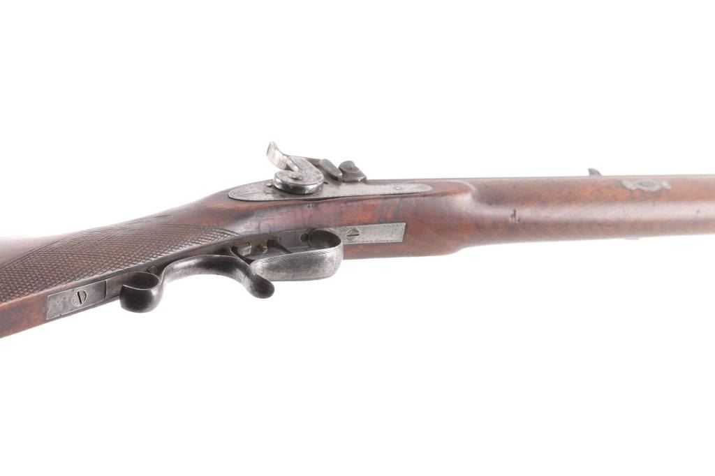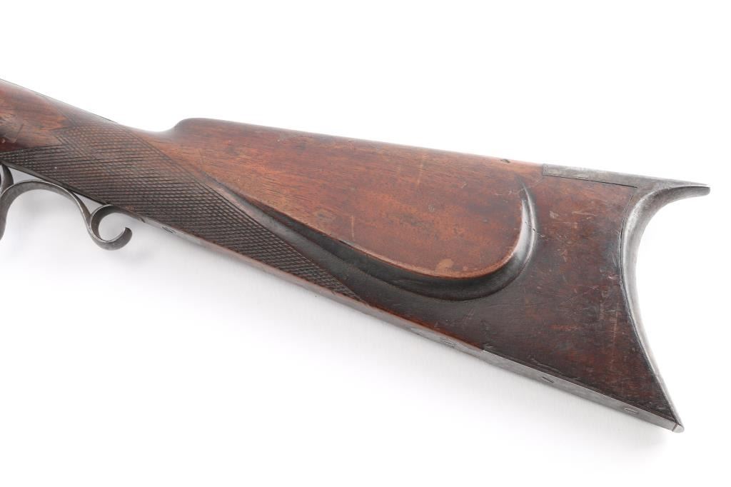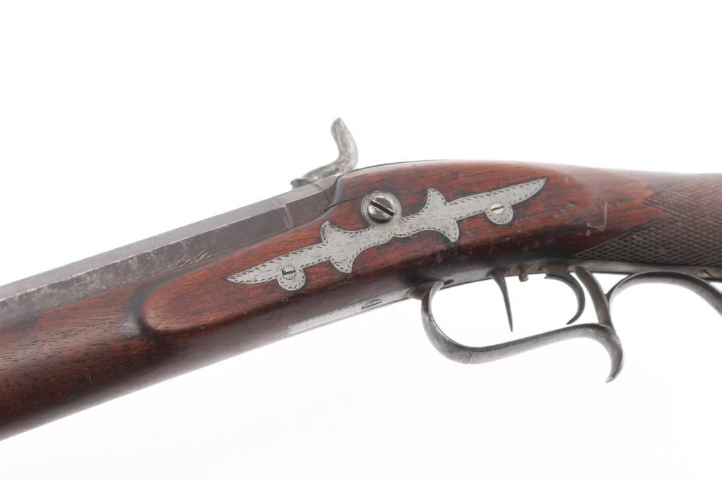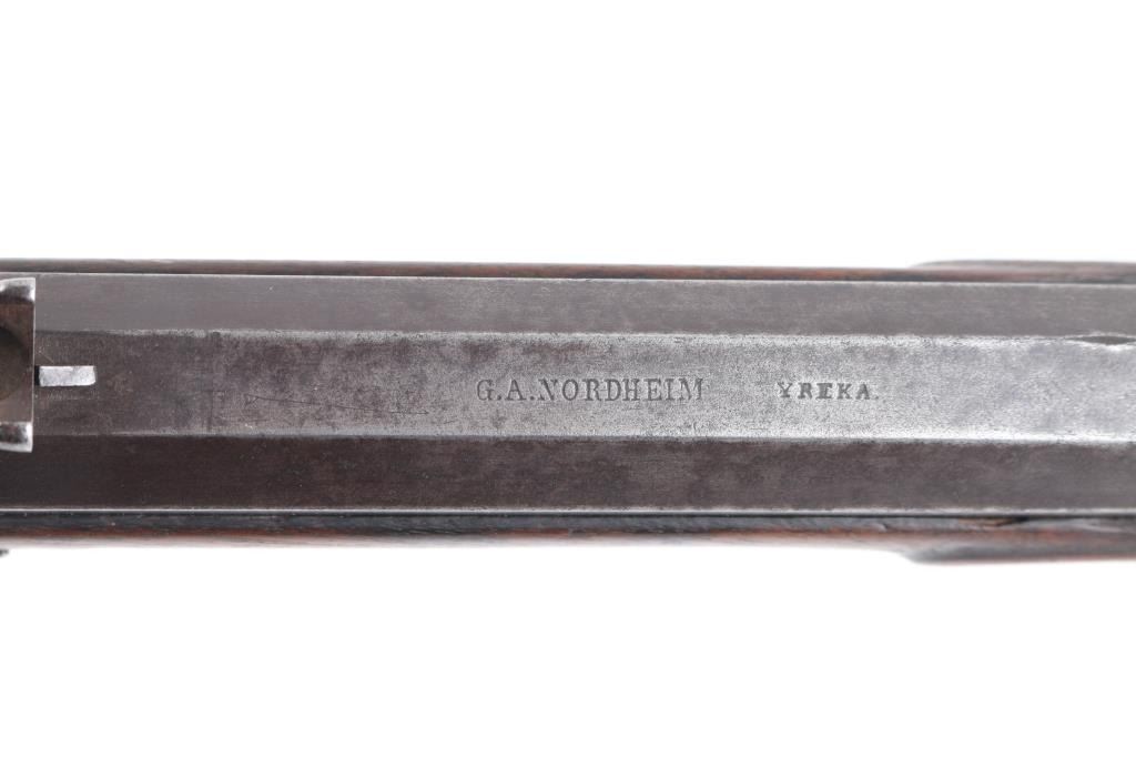 G. A. Nordheim, Yreka (California) marked percussion hunting rifle illustrated page 173 of California Gunsmiths by Larry Shelton, consigned by his estate. Thirty-two inch barrel measuring over 1" across flats and approximately 11 lbs. Half stocked, iron mounted with semi false muzzle. Unique to this maker, iron sideplate secured by 1 large and 2 small screws. Double-triggers, buckhorn rear sight. Nicely engraved iron mounts. Good overall condition with working triggers and good action. Minor wear and normal aging circa 1860s to early 70s. Yreka is in Northern California populated with bear and elk for which this 44 caliber rifle was intended. Condition is NRA Good***Antique Firearm***