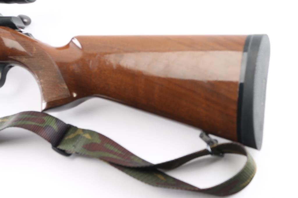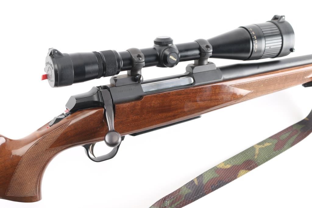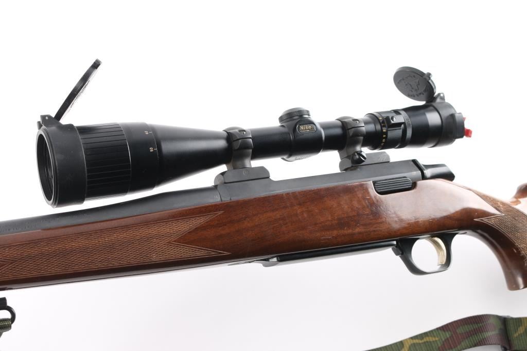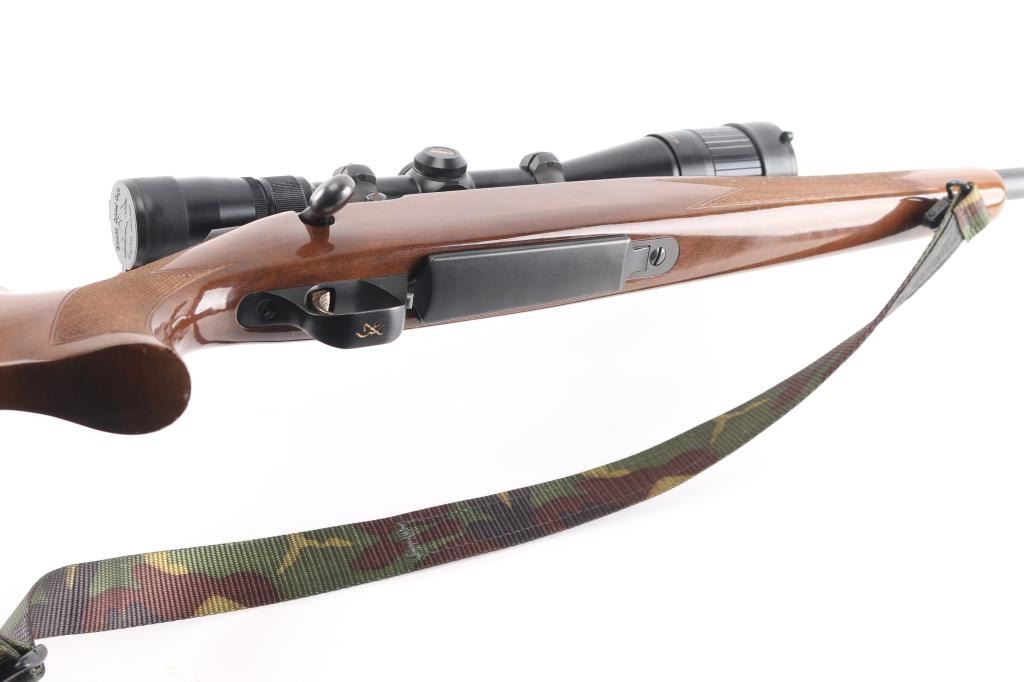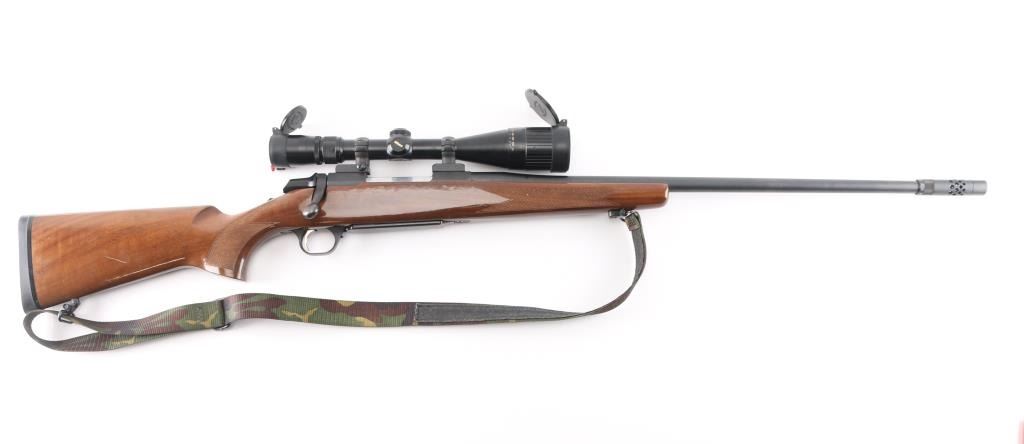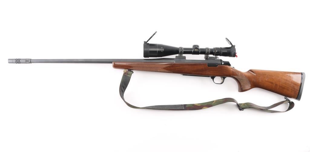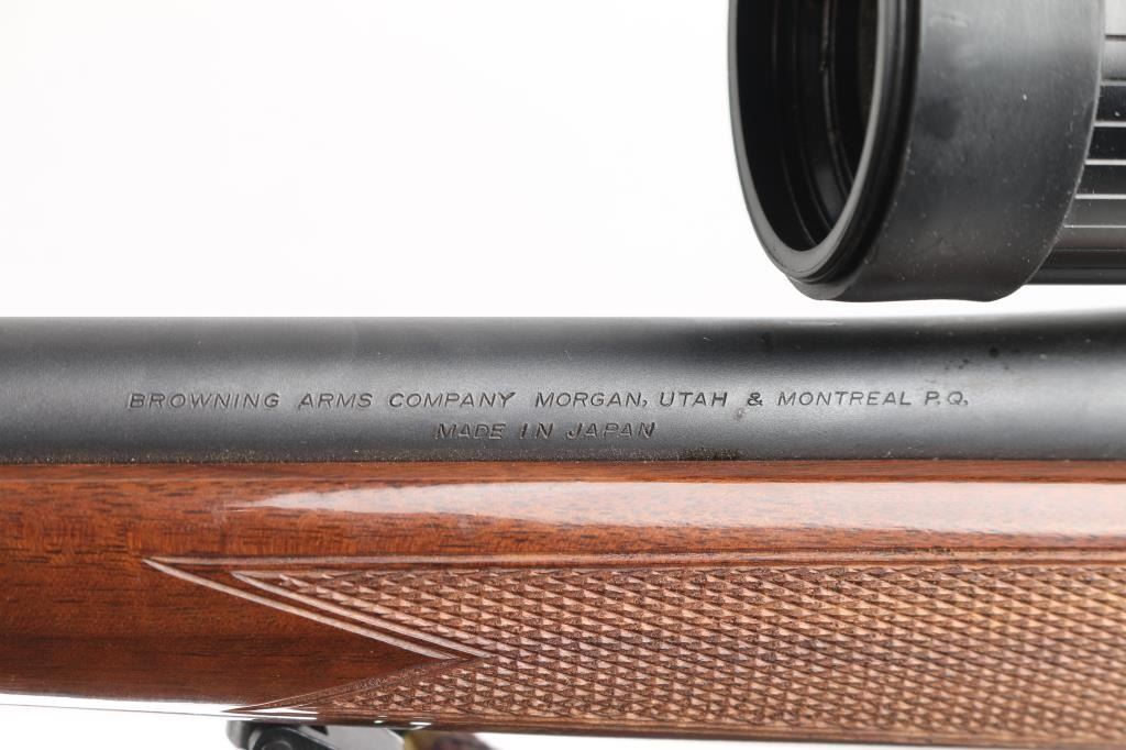 Hunter bolt action center fire rifle manufactured in Japan by Miroku for Browning circa 1994. Features a matte blue finish, urethane finished walnut stock , curved wrist, gold toned serrated trigger, checkering at wrist & forend, black rubber recoil pad, 60° throw bolt, detachable double-stack magazine and strong bolt round out, 26" barrel including BOSS (Ballistic Optimizing Shooting System) muzzle brake system, no provisions for sights, tilted bolt handle with flattened knob, stainless bolt, hinged floorplate, sliding tang safety, grooved dovetail along receiver top, bolt release on left receiver, cocking indicator. Mounted with a Nikon4-12X40 scope with fine crosshair reticle, clear optics. Bore is excellent/bright. Wood is very good with minor scratches and some dings on the left wrist, action is smooth, finish is about 98% with a couple of minor scratches on the receiver. Camo nylon sling attached.NRA condition-Excellent. Modern Firearm.