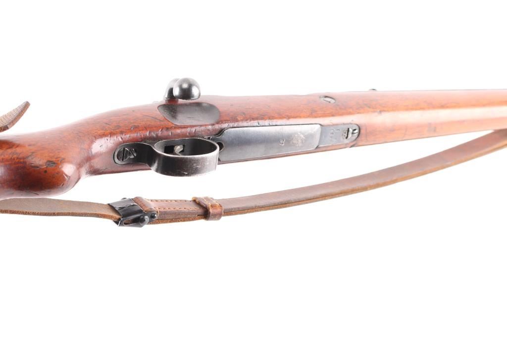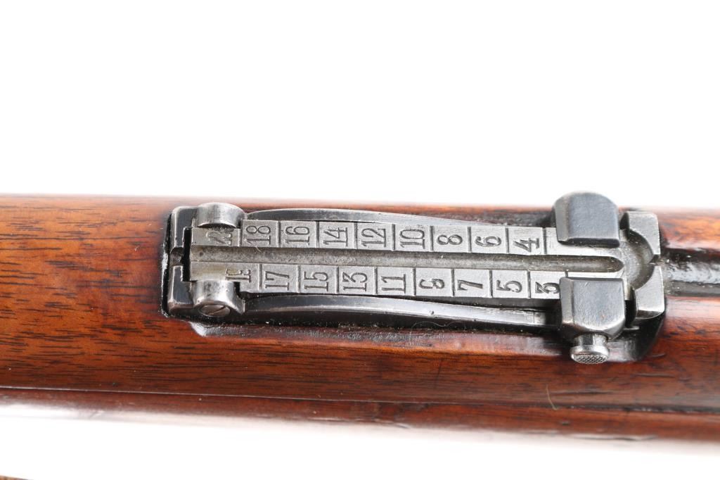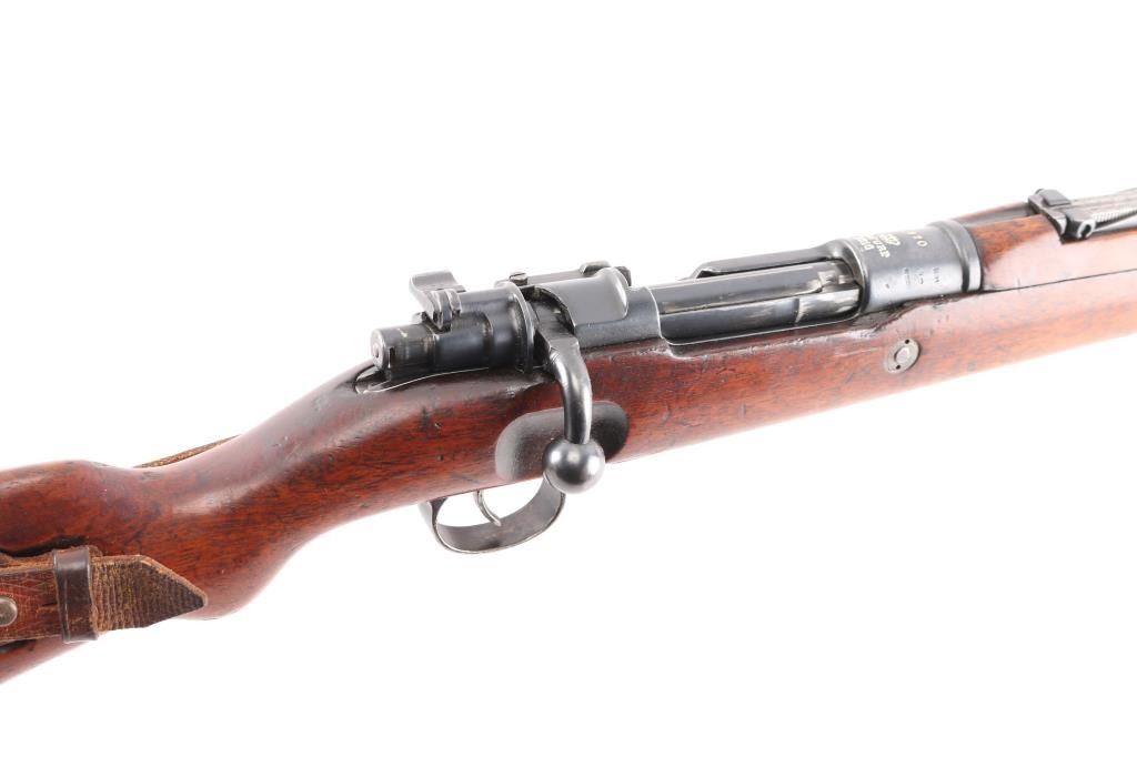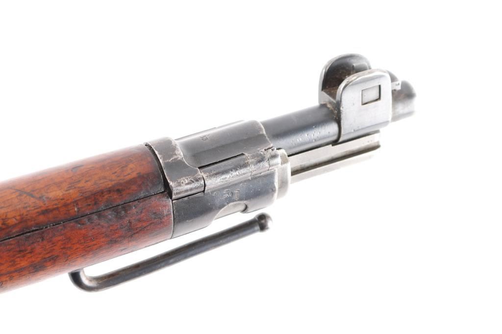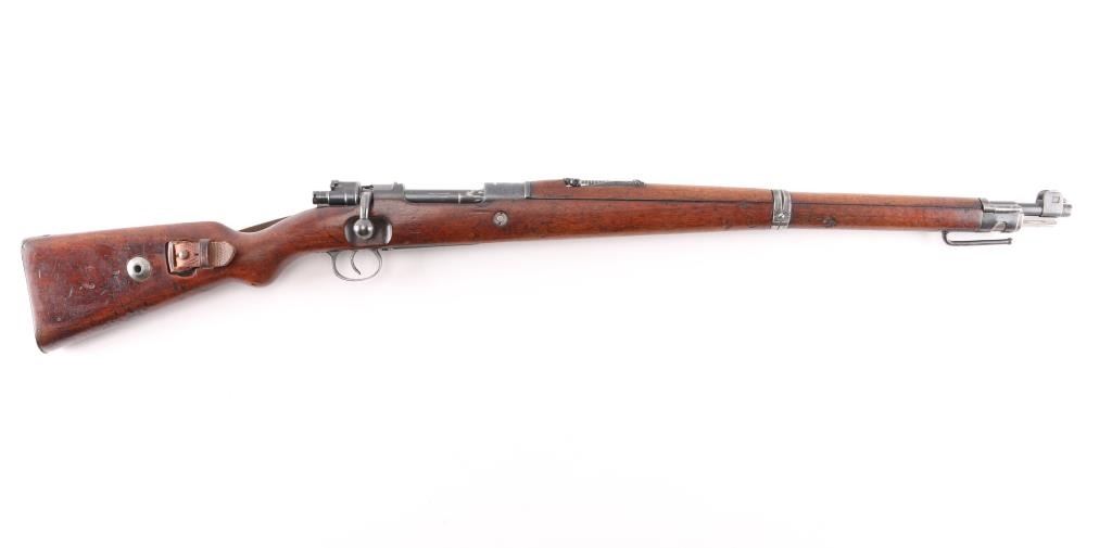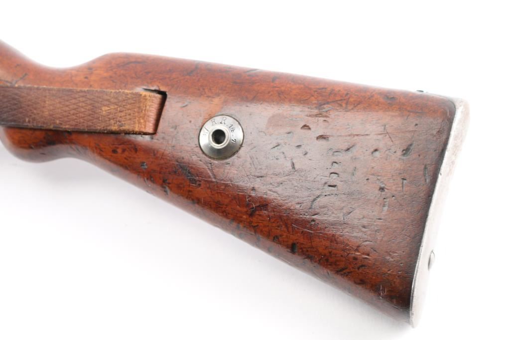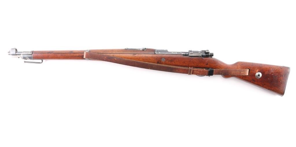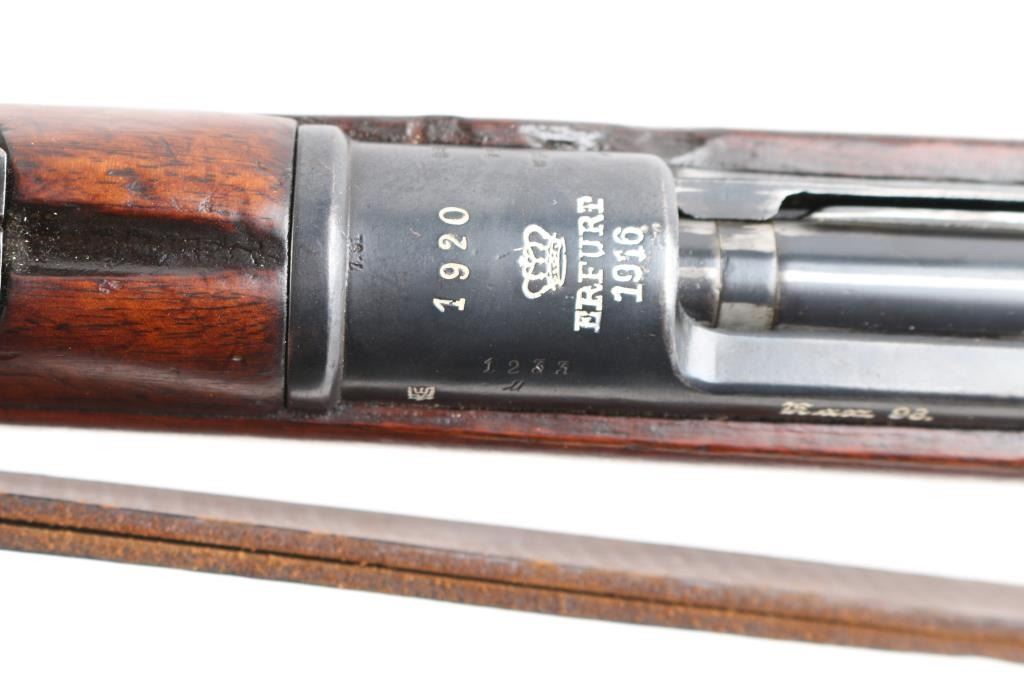 98AZ Carbine. Later designated as the Model 98a. Also known as a Kar 98 (Karabiner 98). here is no visible import mark. All matching serial number. The top of the receiver is marked “7,9”, with a “1920” German Military property mark, and “crown / ERFURT / 1916”. The left side of the receiver is marked with the serial number, with a German “eagle” and “Kar 98” in German script. The right side of the receiver is marked with 3 “crowned letter” stampings. The bottom metal, including the screws are marked with the serial number, the last 2 digits of the serial number, and with 2 crowned letters. The nosecap has full serial number, front sight and barrel band are marked with the last 2 digits of the serial number. The bottom of the stock and rear of the buttplate are marked with the serial number. The bolt handle is marked with the serial number. The left side of the buttstock is marked “1920". The stock disc is stamped "3/R.R. 14.7 which stands for 3rd squadron, Reiter regiment no 14. weapon no 7. The cavalry regiments of the Reichswehr were established on the basis of the Treaty of Versailles. Eighteen cavalry regiments were subordinate to three cavalry divisions. The front sight is an inverted “V” post set between two protective ears. The rear sight is a “V” notched blade attached to a sliding escalator assembly marked with the last two digits of the serial number. Approximately 24" barrel, nose cap has stacking rod. Receiver markings highlighted in white. Action is smooth, bore is good, strong rifling, light frosting in the grooves. Wood is good/sound with many minor scratches/dings. Finish is very good. Correct leather sling attached. NRA Condition-Very Good. C&R Firearm.