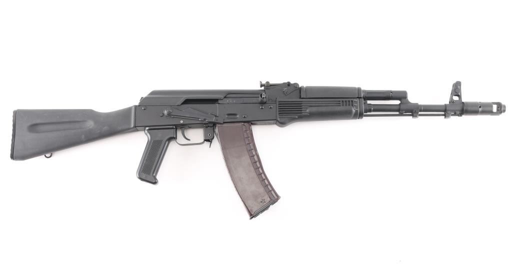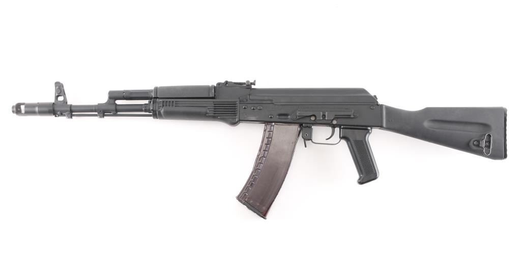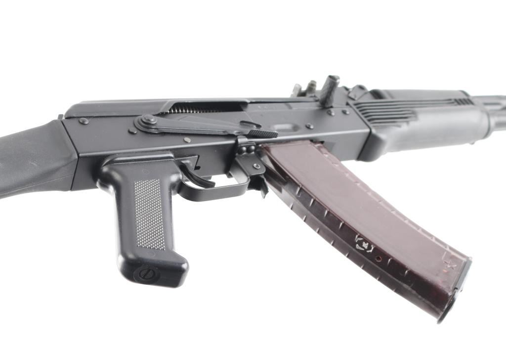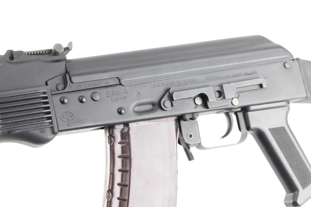 Sn: L09889746 ak-74M. Izhevsk Russia made semiautomatic rifle imported by Arsenal of Las Vegas NV. Left side of the receiver displays SAIGA / 5,45x39 and LEGION IZHEVSK RUSSIA ARSENAL LAS VEGAS NV USA. AK47/AKM Kalashnikov operating system, with standard trigger & trigger guard, pistol grip. Features matte black finish, black polymer furniture, 16" hard chrome lined barrel, threaded muzzle brake held by detent, cleaning rod, bayonet lug, fully adjustable protected post front sight, tangent rear sight, manual safety, buttstock with rubber butt pad. Left side of receiver has optic dovetail rail & mount. Bore is pristine. Overall condition is like new with few handling marks. Includes one 30-round bakelite Tula plum magazine, marked with the Tula star.NRA condition-Excellent. Modern Firearm.