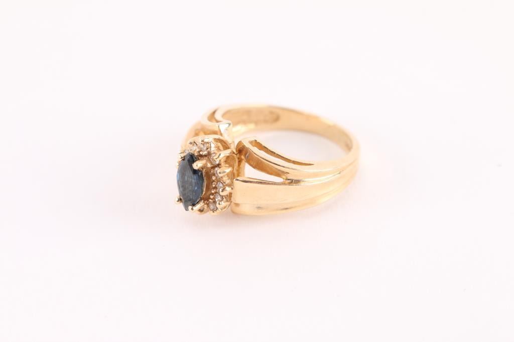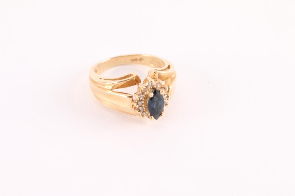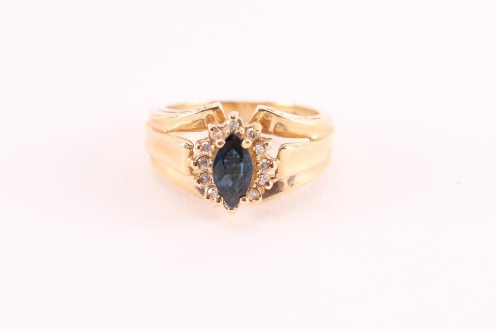 Marquise cut sapphire surrounded by diamonds set in 14kt yellow gold size 6