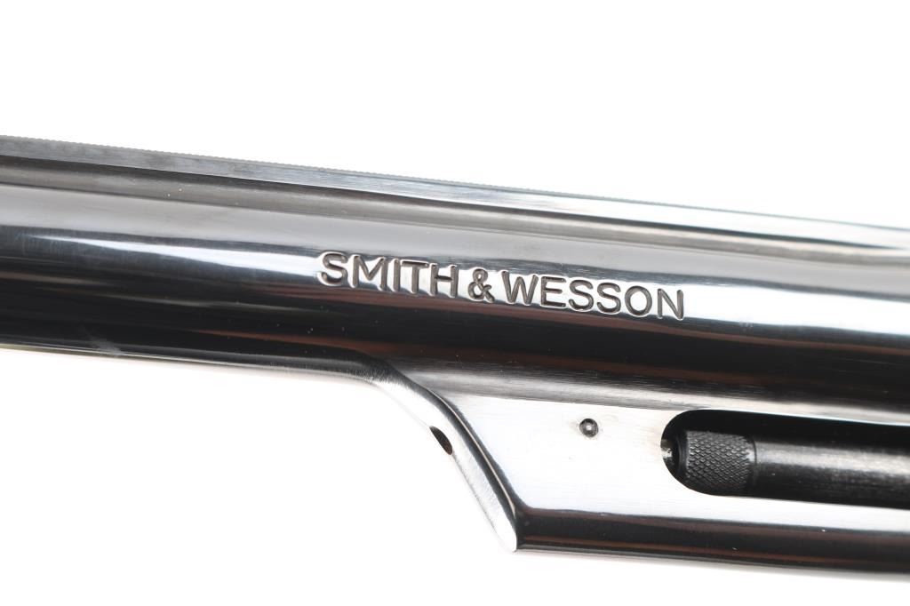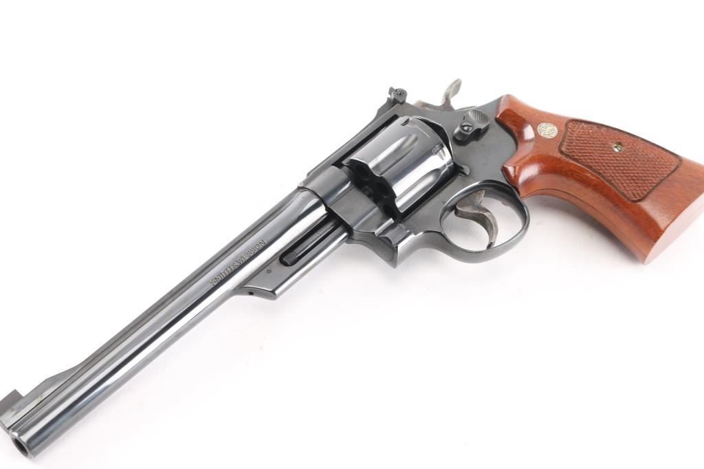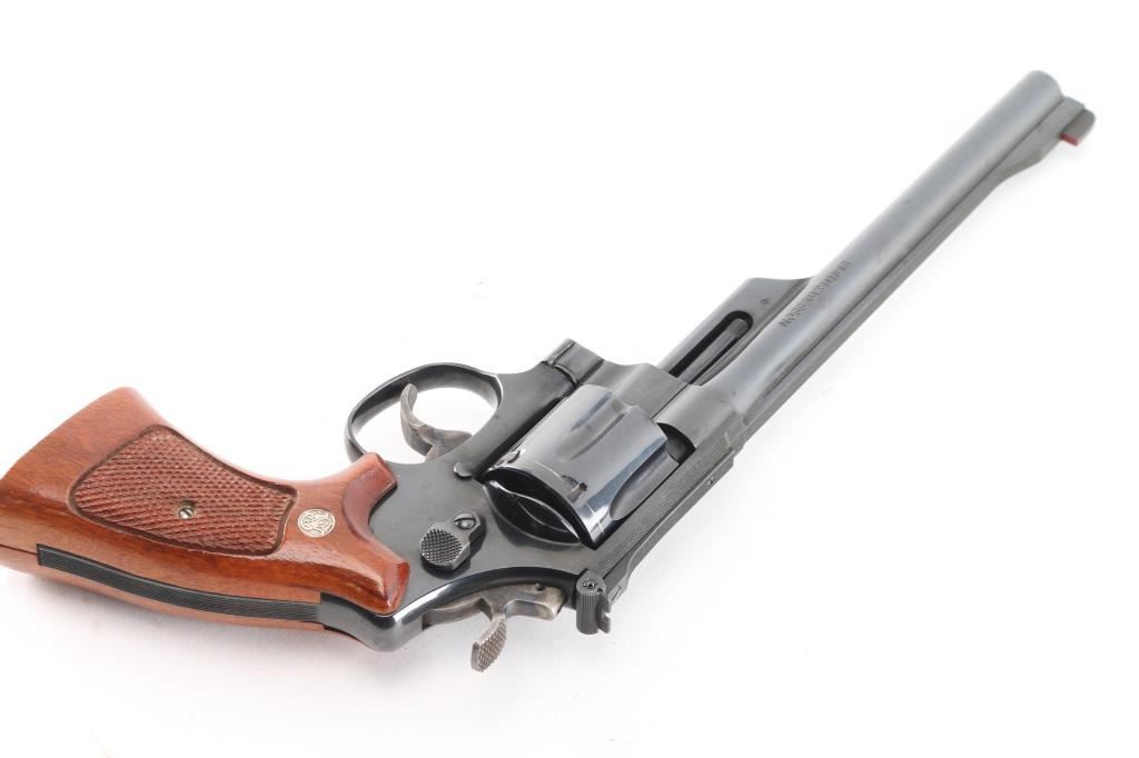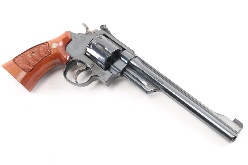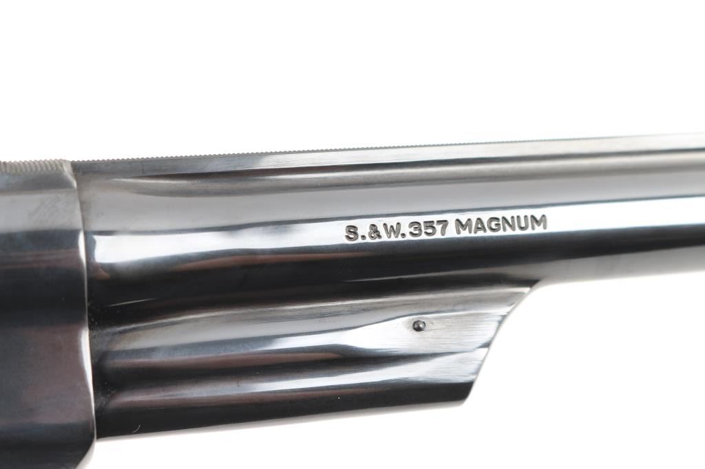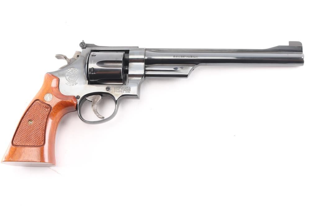 Large frame double-action revolver chambered in .357 Magnum, circa 1988. Features a blued finish, 8 3/8" barrel with a full length checkered sighting rib, pinned and raised Patridge front sight with a red painted rectangle and an adjustable white square notch rear sight, case colored serrated .400" target trigger and case colored checkered .500" hammer spur. Checkered wood target grips with extractor relief cuts and S&W medallions. Bore is pristine with strong rifling. Retains approx. 98% finish with little to no losses. Action is smooth with tight lockup. Condition is NRA Excellent.*** Modern Firearm ***