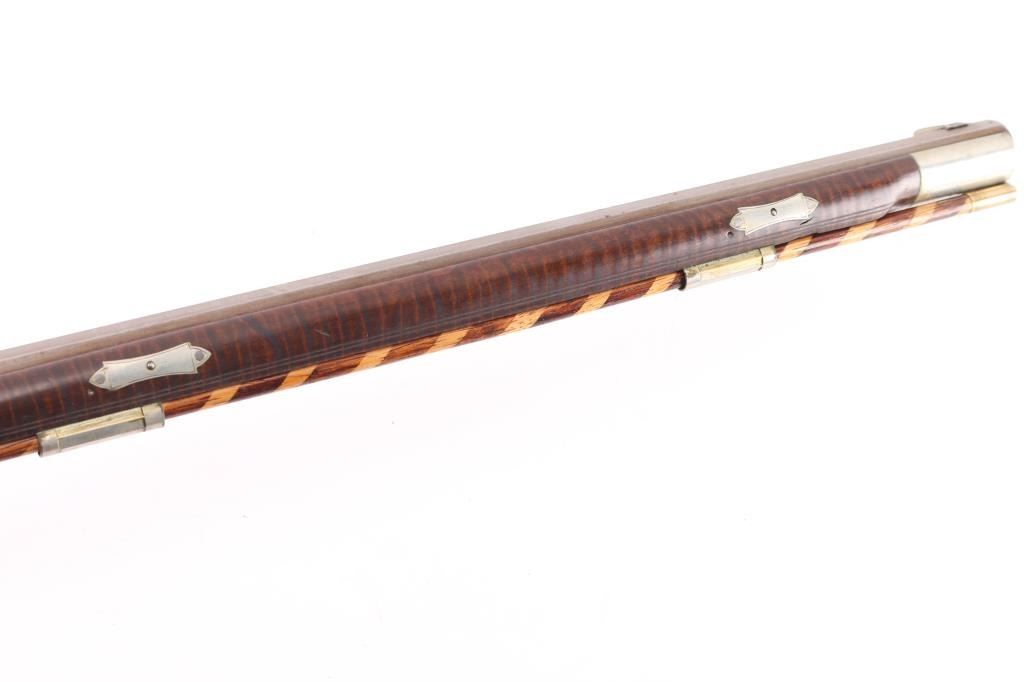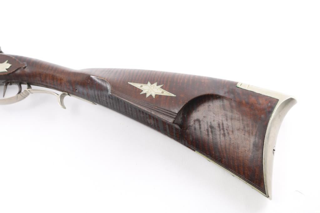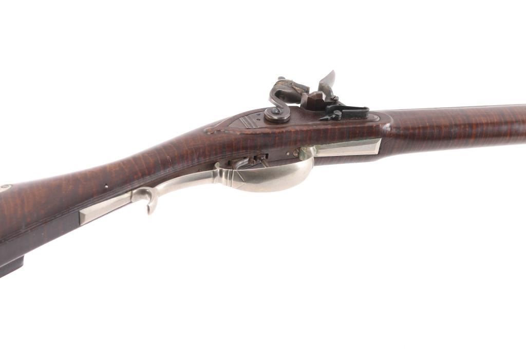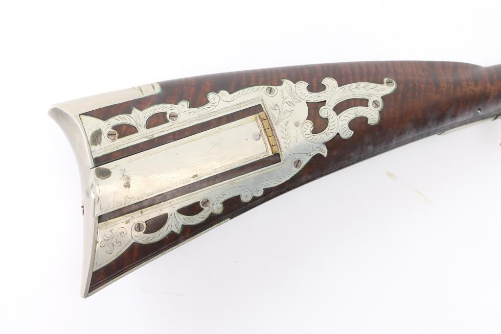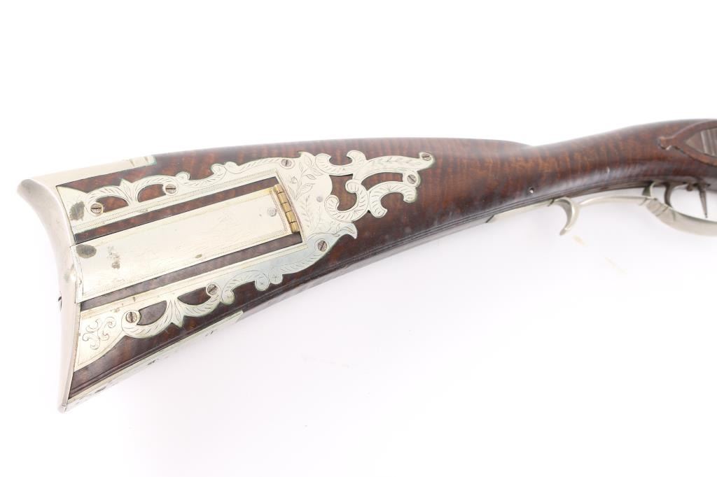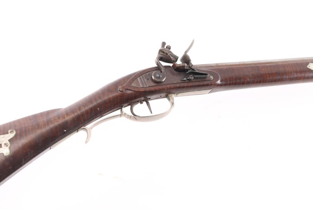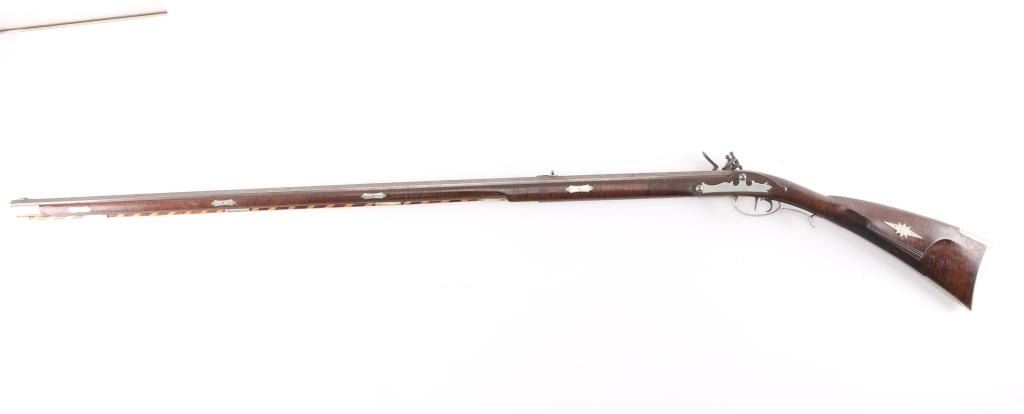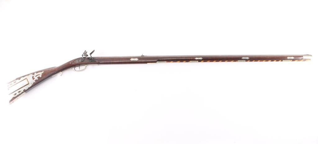 Fancy handmade contemporary Kentucky style flintlock rifle. 43 3/4" octagonal barrel, German silver front sight blade, dovetailed rear peep sight, stripped maple one-piece stock with cheek rest, stripped wooden ramrod with brass tip. Lock signed "DeWalt", Kentucky style double set triggers, fittings and escutcheons are silver toned, scroll work with engraved floral design patchbox. Overall length is 60", Lop is 13 3/4" Hammer does not stay cocked, needs new spring, wood is sound/very good, barrel is a dull gray with scatter patches of brown patina and the bore is very good, strong rifling, dusty.NRA Condition-Fair/Hammer. Antique Firearm.