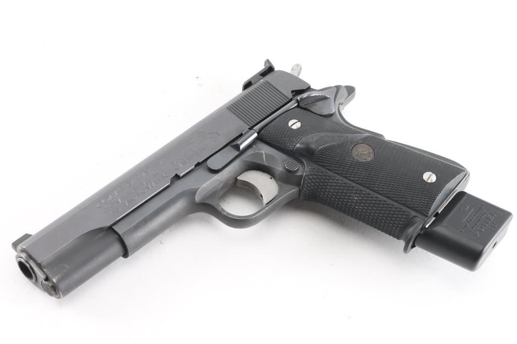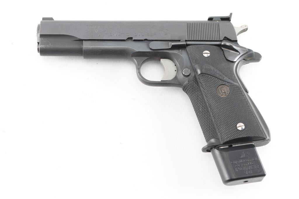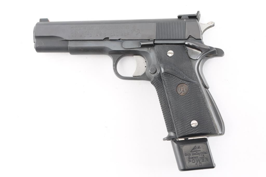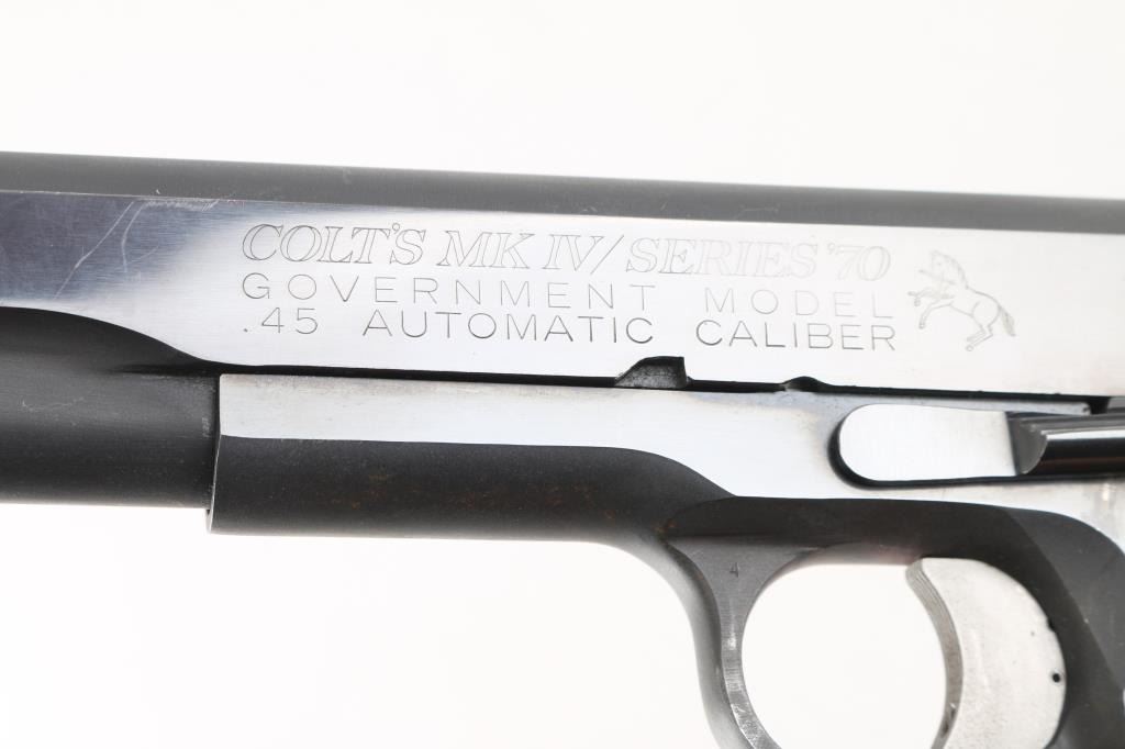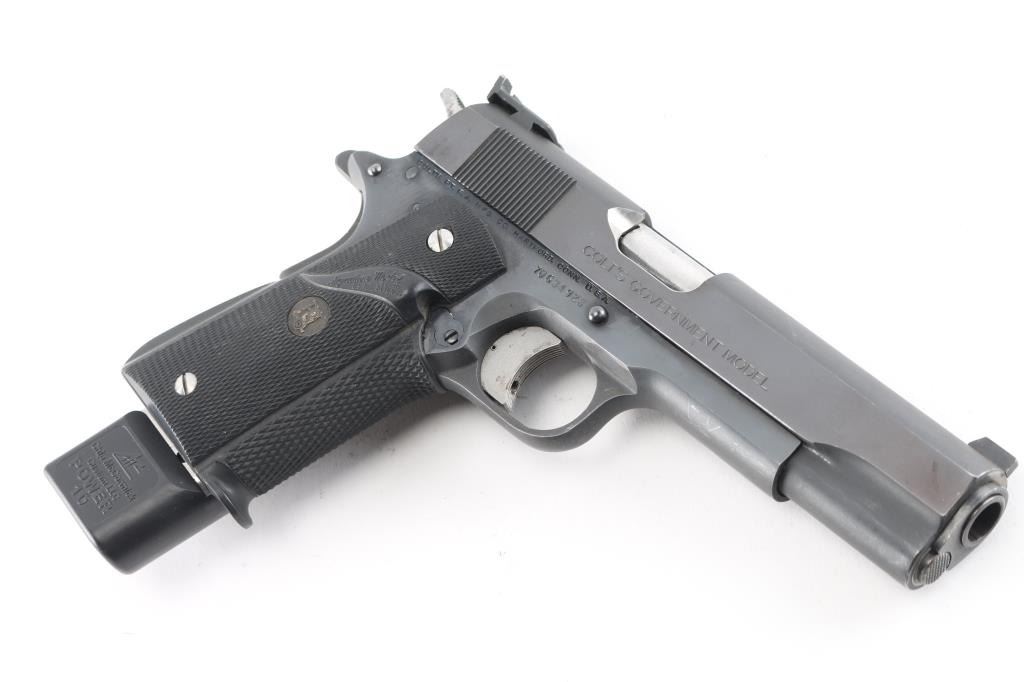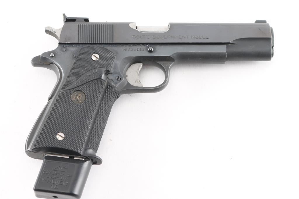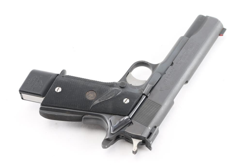MK IV/Series 70 1911A1 pattern single-action semi-automatic pistol manufactured circa 1973. Features matte blued finish with bright polished sides, 5" barrel, ramp front sight with orange painted center groove, square notch rear sight extended just past rear of slide (similar to Millet sights), serrated trigger with adjustable stop, serrated hammer spur, thumb safety on the left side of the frame, grip safety, push button magazine release, steel frame, serrated arched mainspring housing, Pachmayr checkered black rubber wrap-around grips with gold colored Pachmayr medallions with stainless steel screws. Bore is bright with strong rifling, action is smooth/tight. Retains 90% finish with some scattered rust spots on bottom of beaver tail and frame, scattered scratches, handling marks and edge losses. Grips are very good. Includes (1) McCormick 10rd magazine. NRA condition is NRA Good++*** Modern Firearm ***