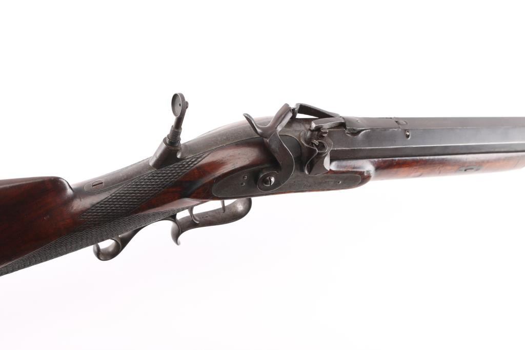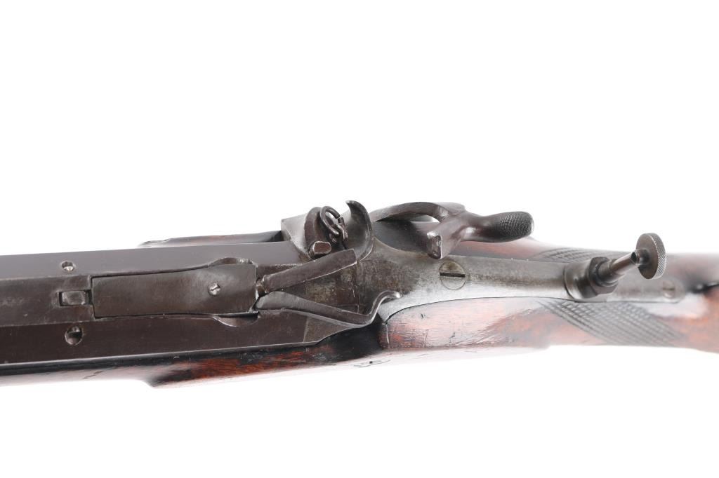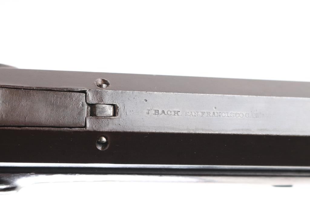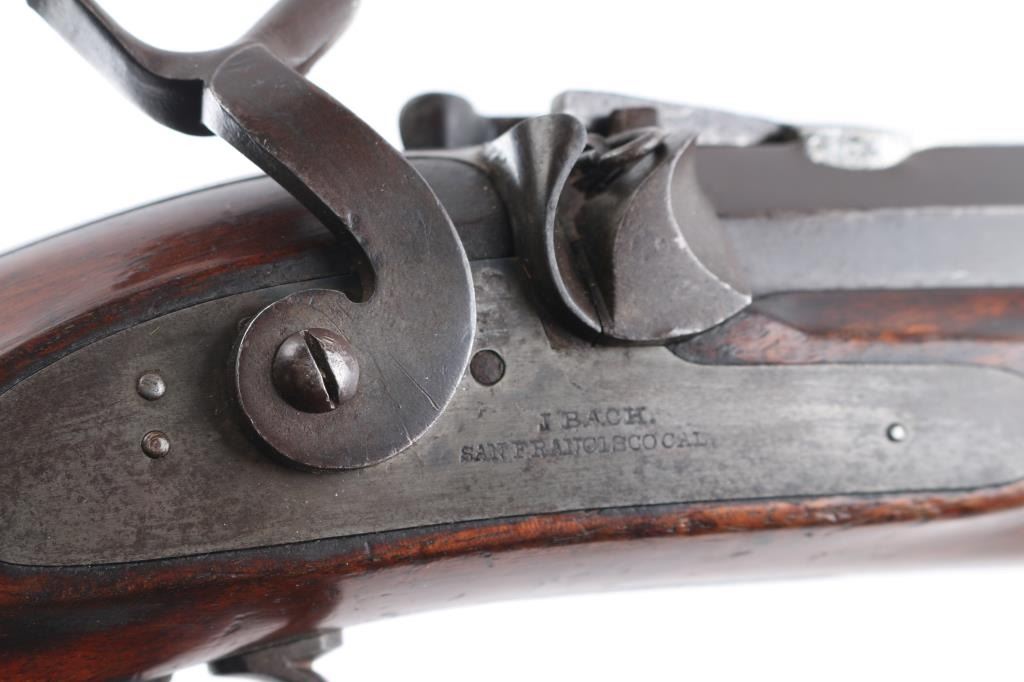 Interesting, possibly one of a kind. J. Bach, San Francisco, signed, heavy barrel percussion rifle converted to breech loading center fire similar to trapdoor. J. Bach was a well recognized San Francisco gun maker and gun shop with complete gun smithing services from mid 19th to early 20th century. The rifle is approximately 485 bore caliber with heavy octagon barrel, double set triggers, target sights, nicely checkered select grain wood stock. The overall condition is very good plus with much original finish remaining on the metal. The stocks show minor storage marks and natural aging. 48 1/2" overall, 1 1/2" across the barrel, weight about 16 1/2 lbs. The exact caliber is unknown but appears to be a 2 1/4" case to 2 1/2" max in order to fit into recessed area possibly European cartridge. Larry Shelton collection, author of "California Gunsmiths1846-1900". Condition is NRA Very Good***Antique Firearm***