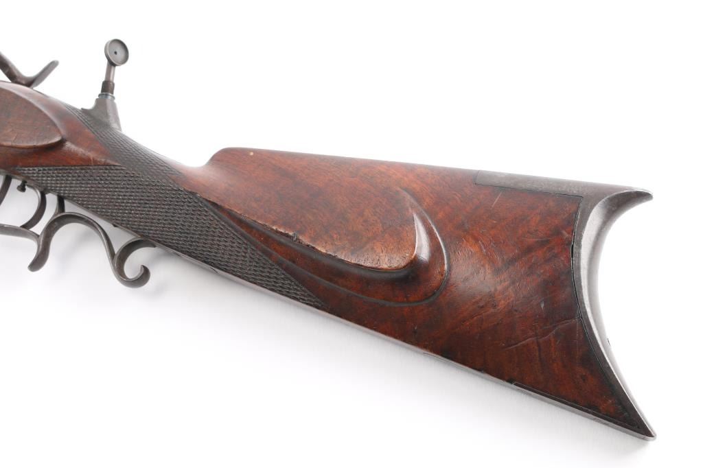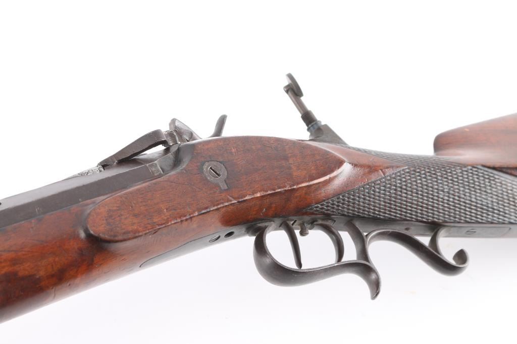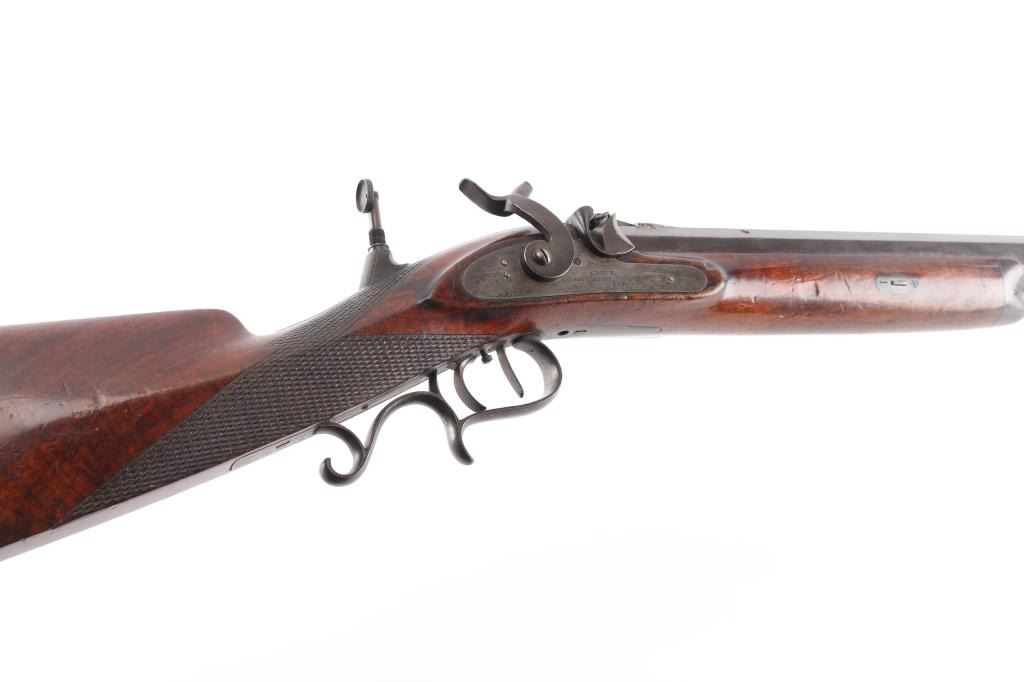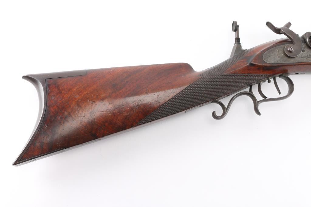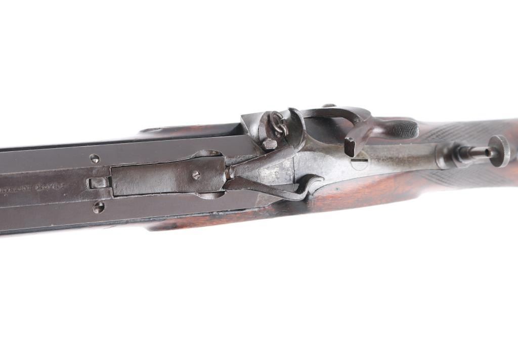 Interesting, possibly one of a kind. J. Bach, San Francisco, signed, heavy barrel percussion rifle converted to breech loading center fire similar to trapdoor. J. Bach was a well recognized San Francisco gun maker and gun shop with complete gun smithing services from mid 19th to early 20th century. The rifle is approximately 485 bore caliber with heavy octagon barrel, double set triggers, target sights, nicely checkered select grain wood stock. The overall condition is very good plus with much original finish remaining on the metal. The stocks show minor storage marks and natural aging. 48 1/2" overall, 1 1/2" across the barrel, weight about 16 1/2 lbs. The exact caliber is unknown but appears to be a 2 1/4" case to 2 1/2" max in order to fit into recessed area possibly European cartridge. Larry Shelton collection, author of "California Gunsmiths1846-1900". Condition is NRA Very Good***Antique Firearm***