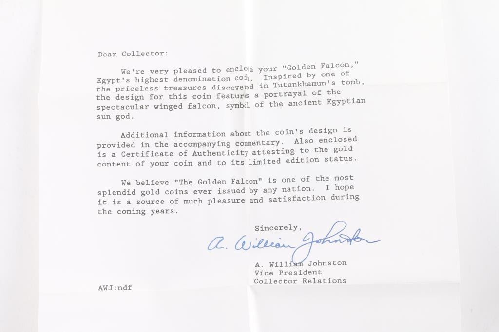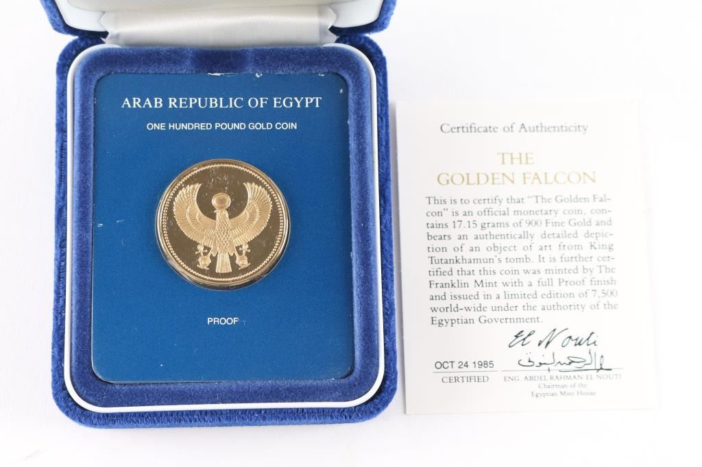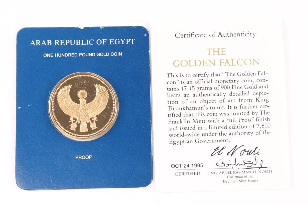 1985 Arab Republic of Egypt one hundred pound. Egypts highest denomination coin. Gold falcon (symbolizing the god Horus) pectoral with outstretched wings and the head with a sun disk, found on the Mummy of Tutankhamun. Comes in OGP w/COA.