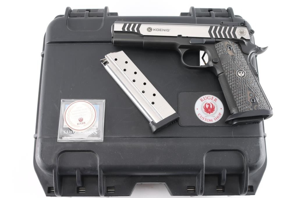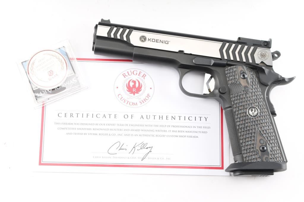 Ruger Custom Shop 1911 Platform 9mm Semi-Auto Pistol with 5" BBL and competition target features including stainless steel with black nitride finish. Koenig marked slide #CSI-00109. Fine used condition showing very little firing or use. Estate piece. Factory case, extra mag (2 total), certificate, papers and accessories. ($2619 suggested retail.)Condition is NRA Excellent*** Modern Firearm ***