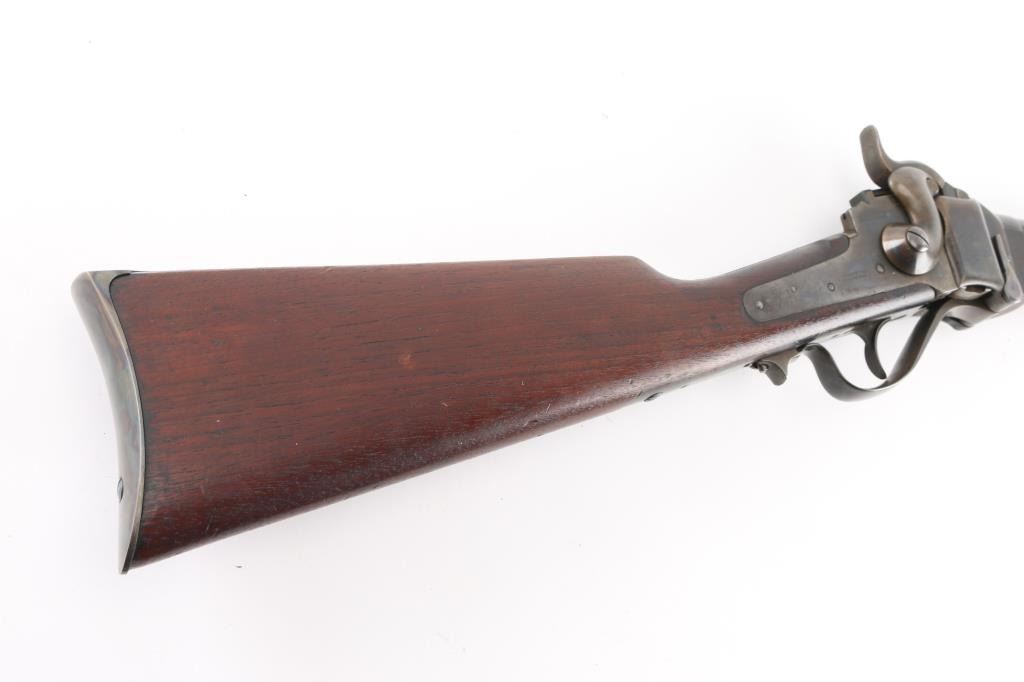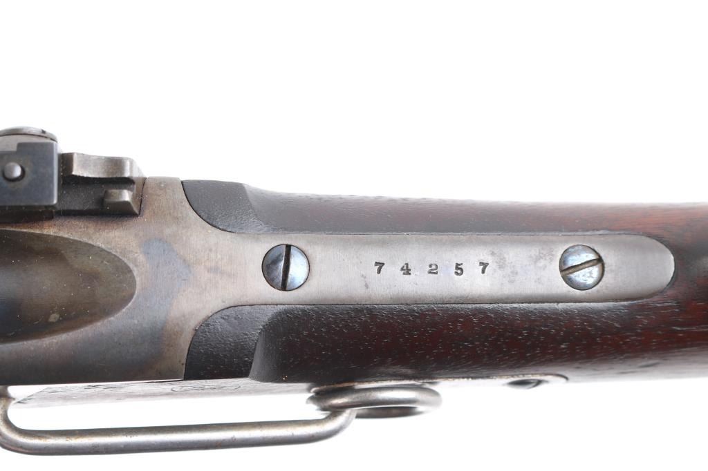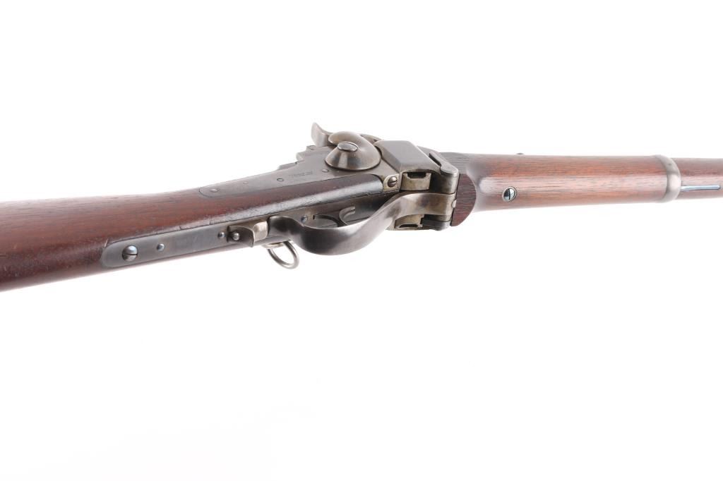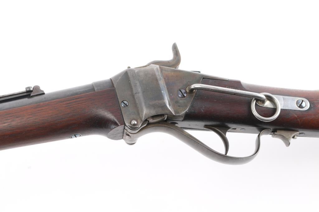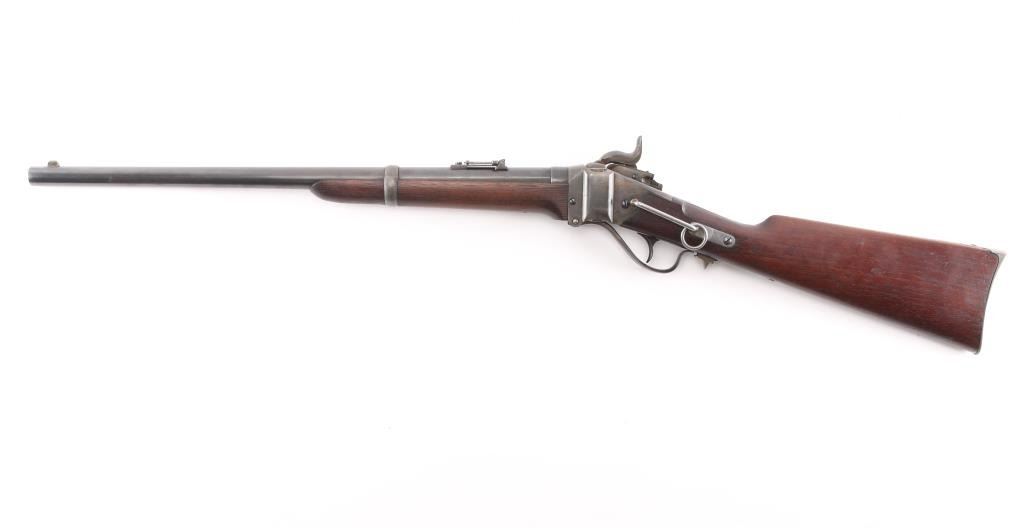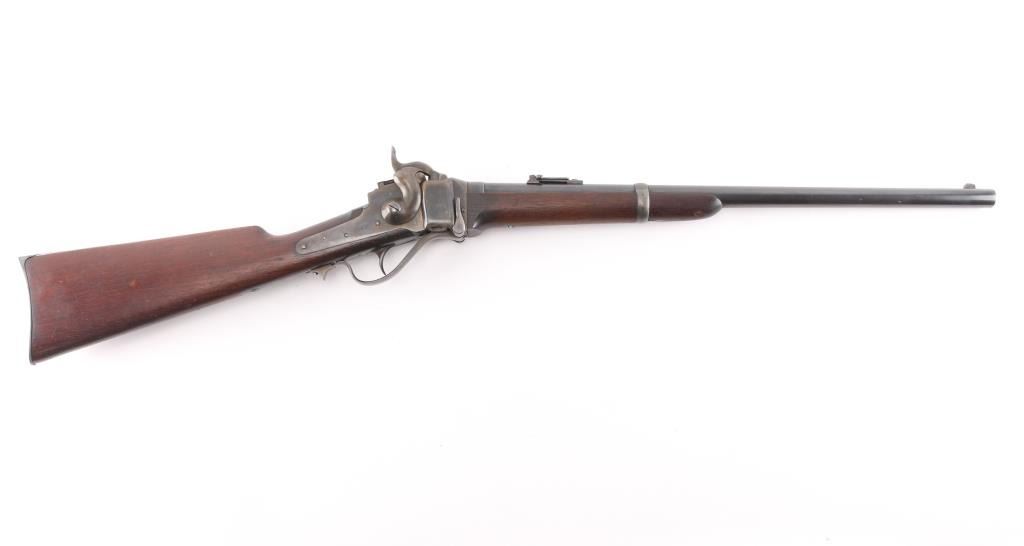 Single shot lever operated falling block rifle manufactured circa 1863, converted to use metallic cartridges circa 1867-68. Features blued finish, two piece smooth wood stock, 22" barrel, blade front & ladder rear sights, lever lock, sling bar with ring. Bore is excellent condition. 3 groove rifling indicates barrel replacement under government contract. Barrel retains full coverage blued finish. Action has some of the case hardened color. Markings on lock plate and action remain crisp as well as the serial number on the tang.. Wood is very good condition, with minor scratches, dings. There is a inspectors cartouche on the left wrist, EF in square, barrel markings are feint. Saddle ring/bar are in the white.Condition is NRA Excellent as Antique Firearm.