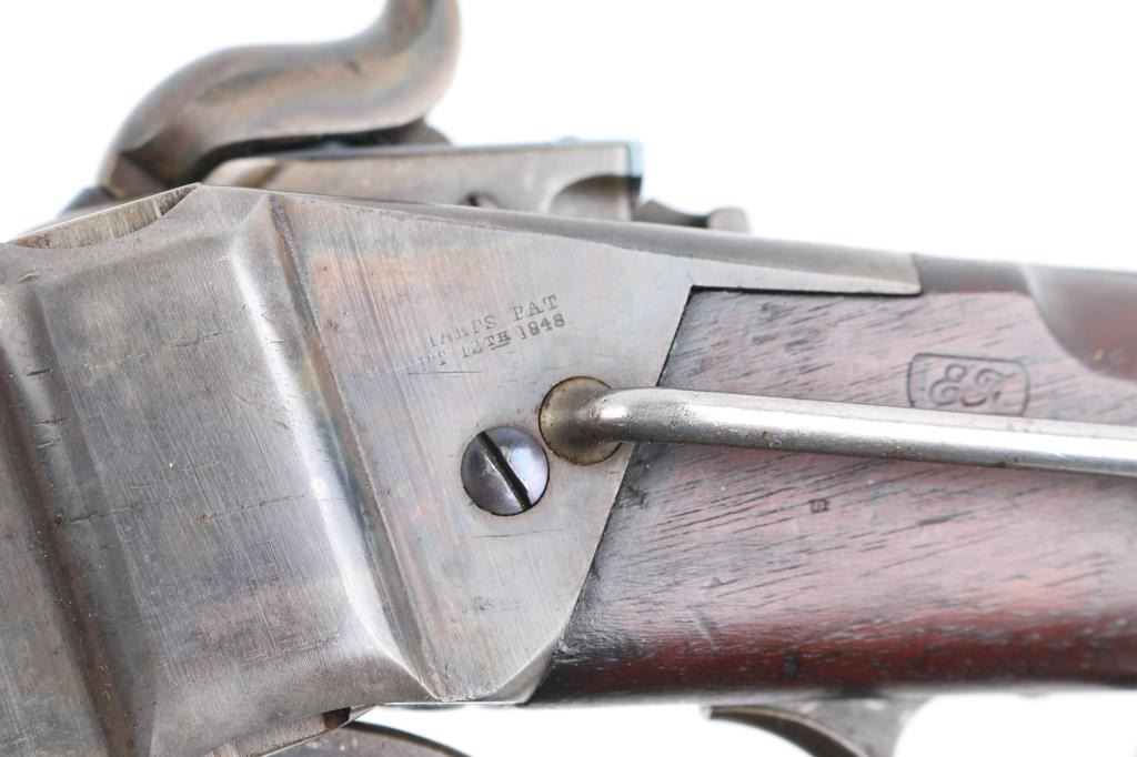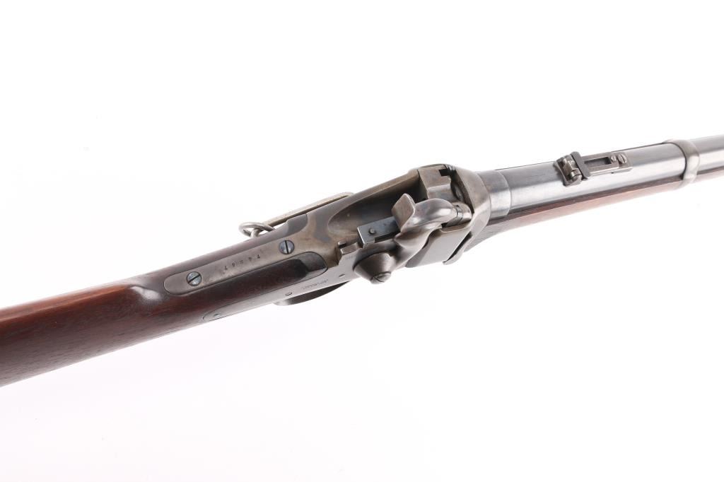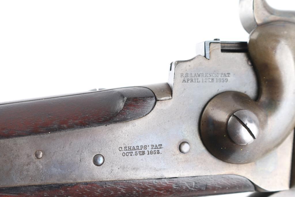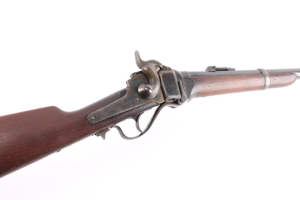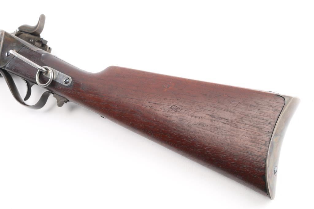 Single shot lever operated falling block rifle manufactured circa 1863, converted to use metallic cartridges circa 1867-68. Features blued finish, two piece smooth wood stock, 22" barrel, blade front & ladder rear sights, lever lock, sling bar with ring. Bore is excellent condition. 3 groove rifling indicates barrel replacement under government contract. Barrel retains full coverage blued finish. Action has some of the case hardened color. Markings on lock plate and action remain crisp as well as the serial number on the tang.. Wood is very good condition, with minor scratches, dings. There is a inspectors cartouche on the left wrist, EF in square, barrel markings are feint. Saddle ring/bar are in the white.Condition is NRA Excellent as Antique Firearm.