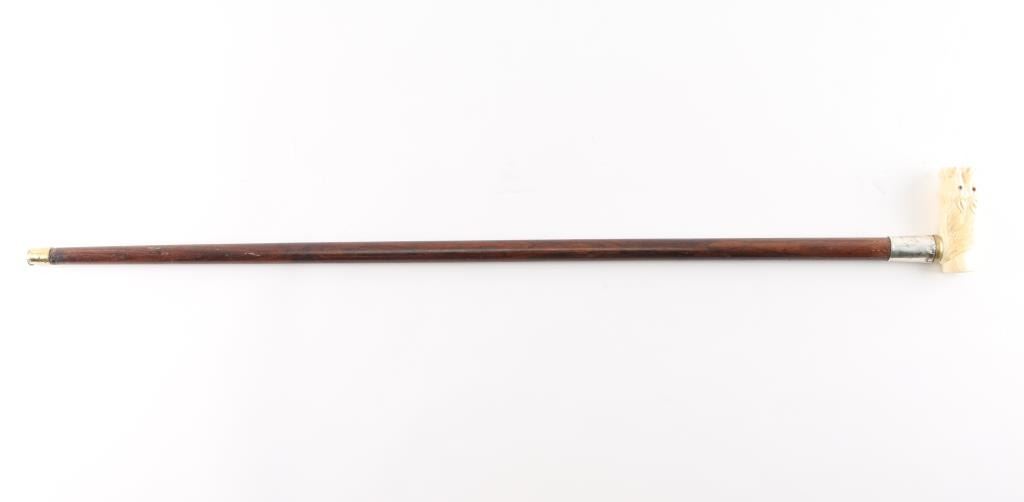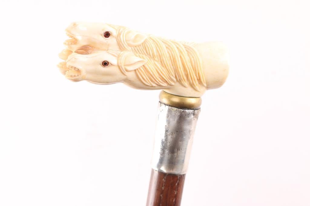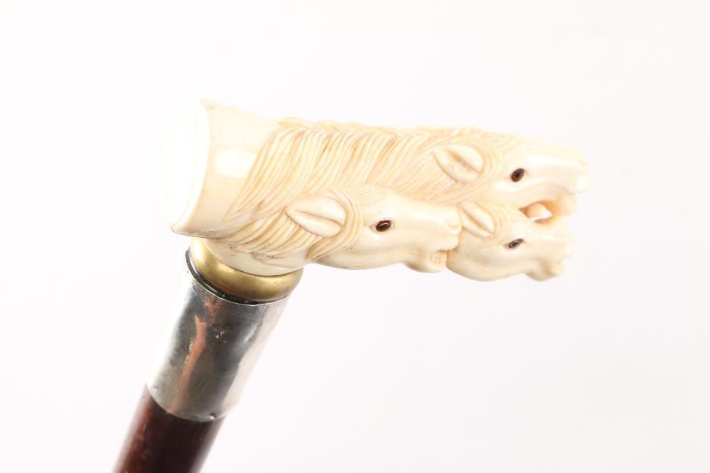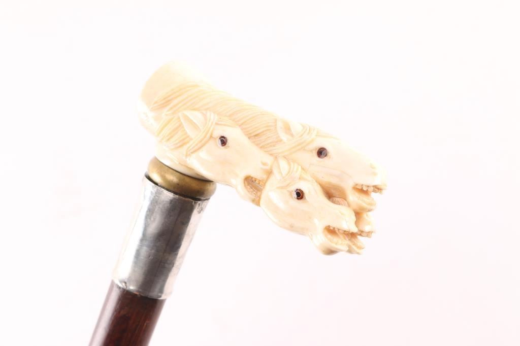 Fancy 19th to early 20th century cane with carved ivory grip showing 4 horse heads with inlaid eyes. Silver band at top of exotic wood shaft, probably rosewood. Good condition with minor imperfections, slight age cracks, normal wear and use. Exceptional carving. Measures 34 1/8" tip to end.