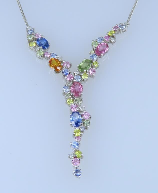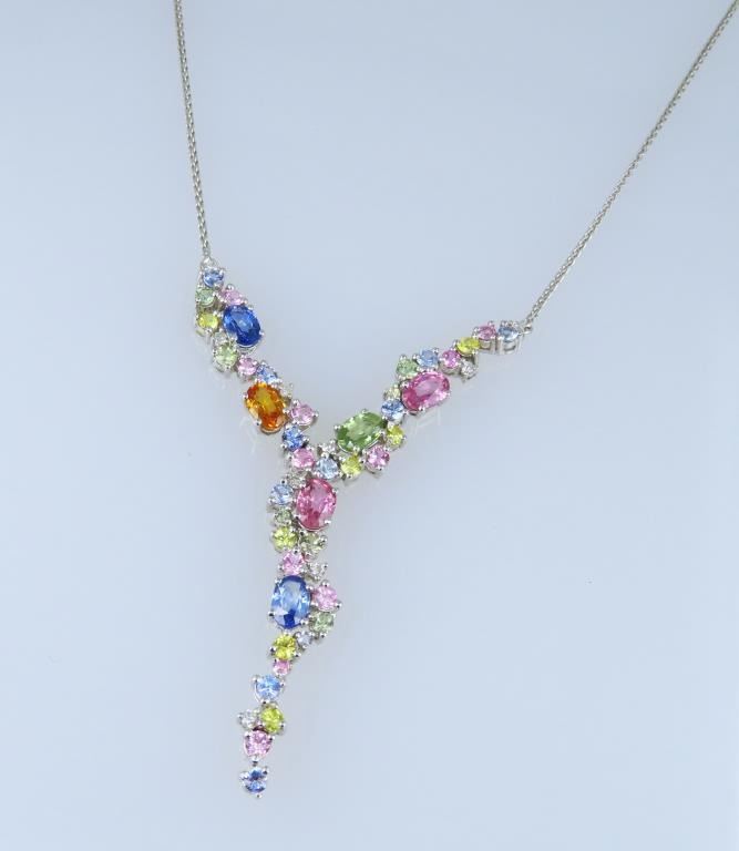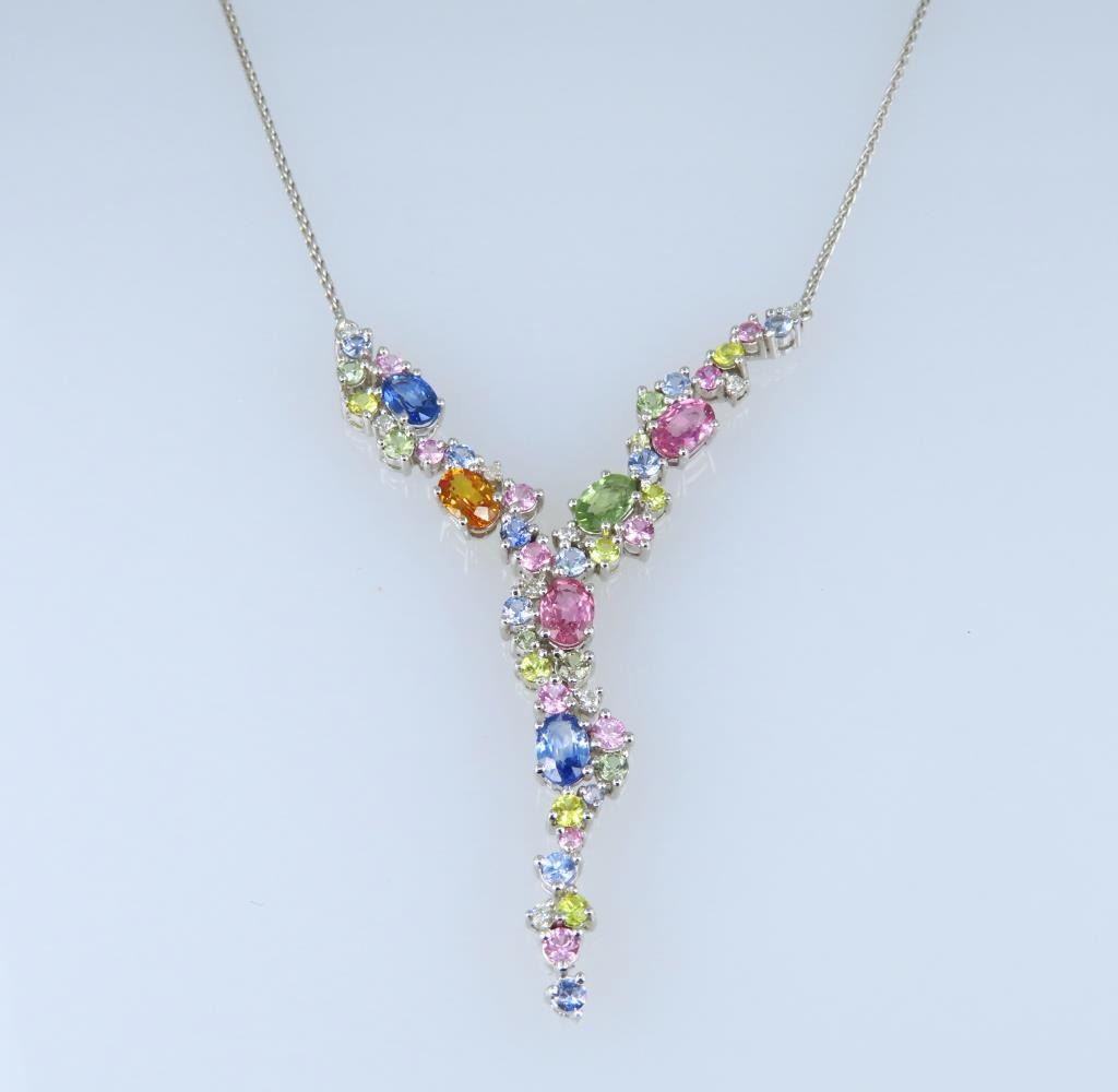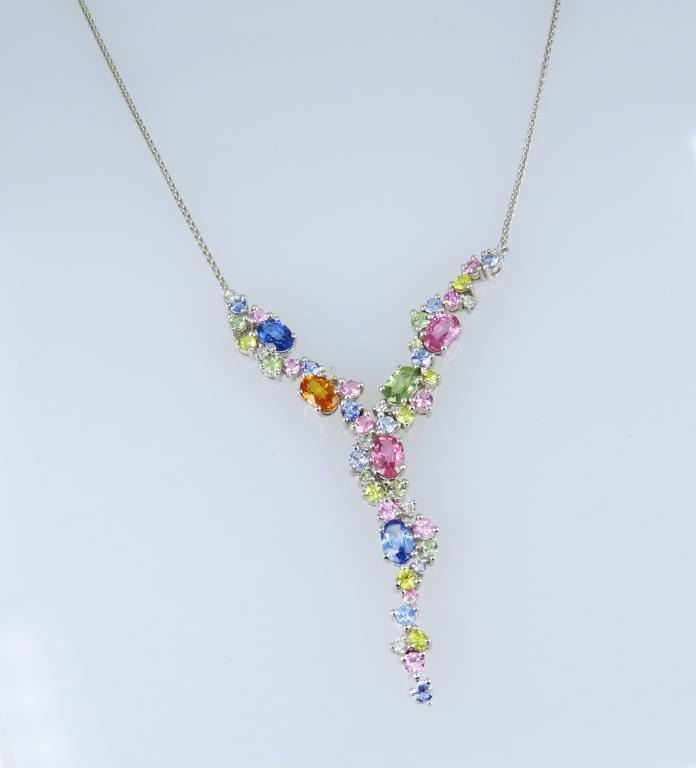 Necklace, featuring 40 natural oval and round cut Sapphires in Blue, Pink, Orange, Green and Yellow accented with 9 Diamonds with a total Gem weight of approximately 4.81 carats. Gems are set in a beautiful cascading design impeccably crafted in 14 karat white gold. Full Retail Appraisal - $10,000.00.