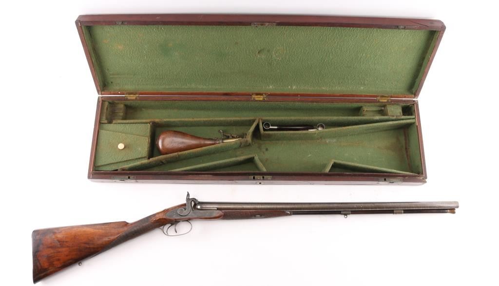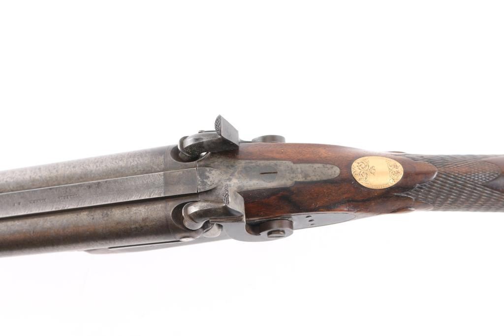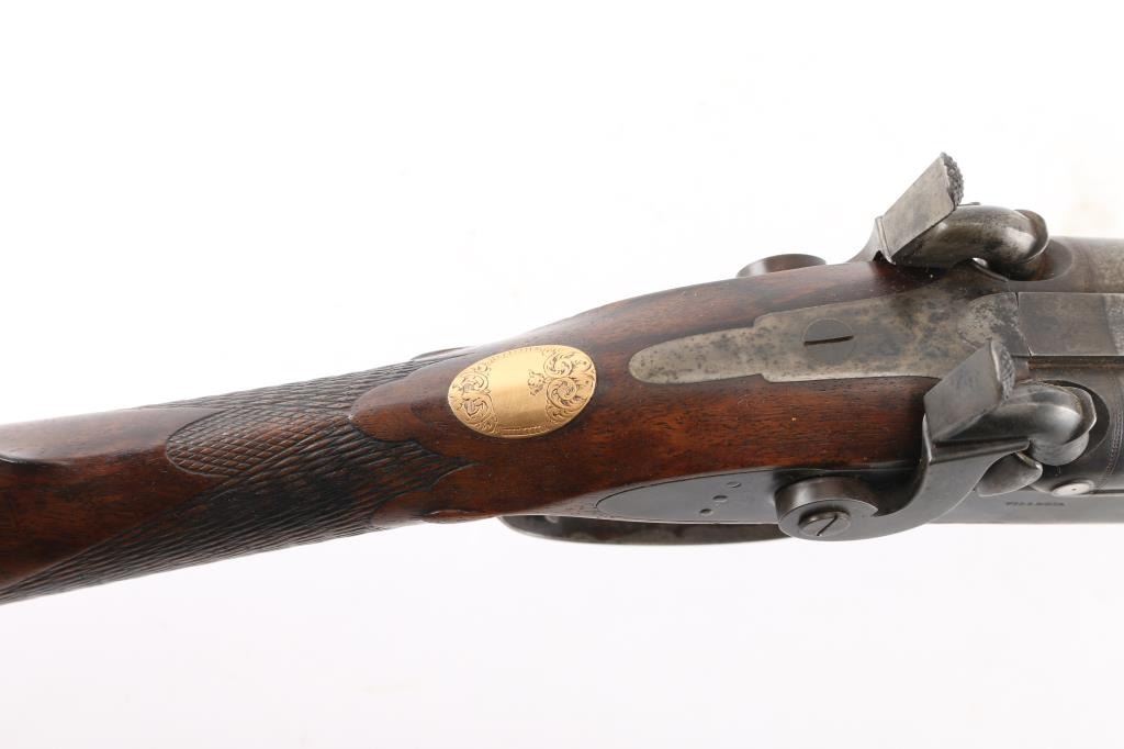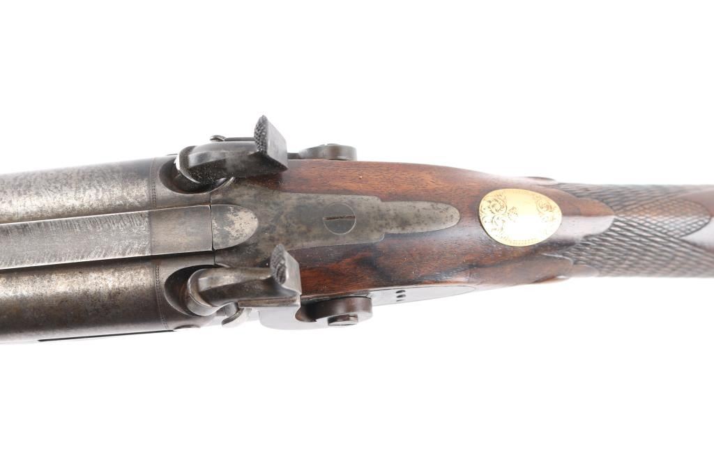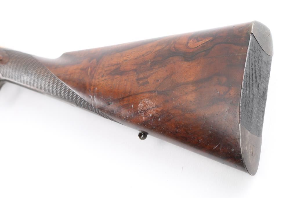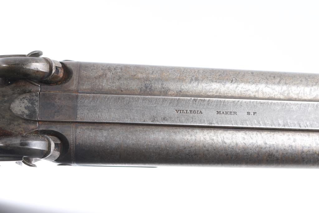 Marked "VILLEGIA MAKER S.F." (California) on the barrel and "VILLEGIA" on both locks. 26" BBLs marked with London proofs and "15" on the underside. Bore measures approximately .680" at the muzzle. Good to very good condition with about 50% brown damascus pattern on BBLs and case colors drifting to grayish blue. Fancy figured walnut checkered stock w/ checkered wood butt and steel caps. Engraved gold oversize plaque inlaid in the wrist. Good action and bore. Partition style case lined in green felt similar to English arms of same era. Shot flask and 2 powder measurers included w/ no other accessories. Interior is good w/ normal age and imperfections along w/ small lining loss and damage, exterior of case good w/ damage to ends. A good gun by a scarce maker from the estate of Larry Shelton, author of "California Gunsmiths" book.Condition is NRA Good**Antique Firearm**