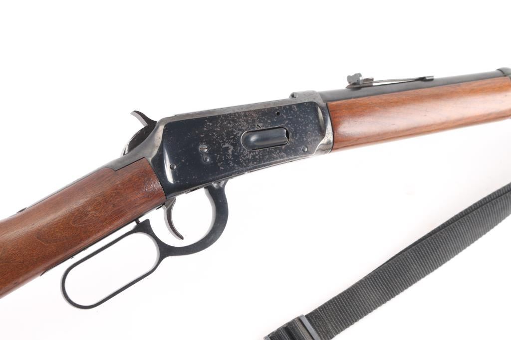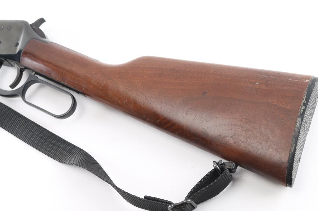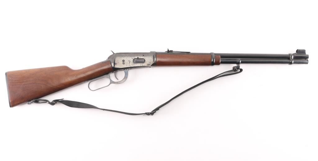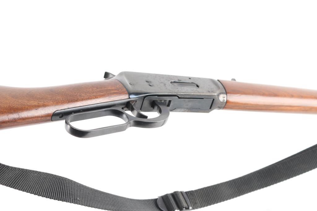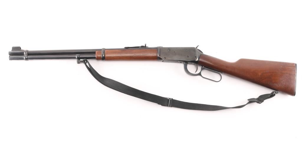 Eastern Carbine. Vintage lever action repeating rifle chambered in .30-30 Winchester. Manufactured 1972. Features a blued finish, 20" barrel, full-length tube magazine, hooded ramped, blade/bead front sight , adjustable rear buckhorn sight. Smooth trigger, serrated hammer spur, steel receiver, smooth walnut forend and straight wrist shoulder stock with factory black plastic buttplate. Left receiver drilled/tapped for sights/optics. Bore is excellent/bright, strong rifling, needs cleaning. Retains about 90% blue finish with scattered pin-prick pitting on the receiver and upper tang. Wood is very good/sound with some small scuffs/scratches and a minor chip out of the left forearm. Markings are crisp. Action is smooth. Black nylon sling attached.NRA Condition-Good. C&R Firearm.