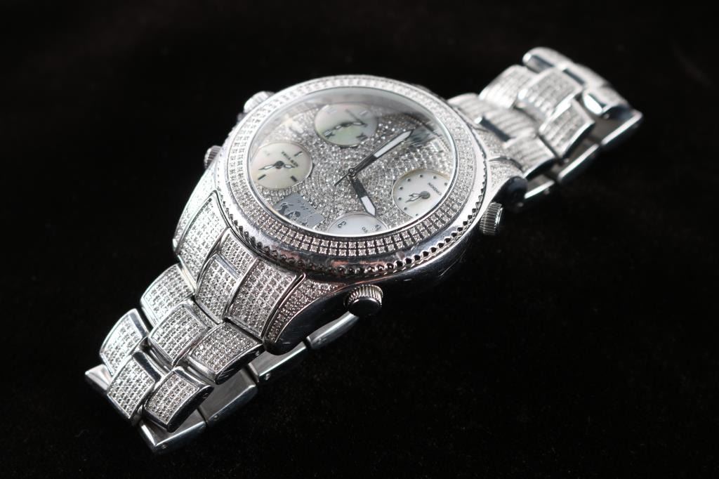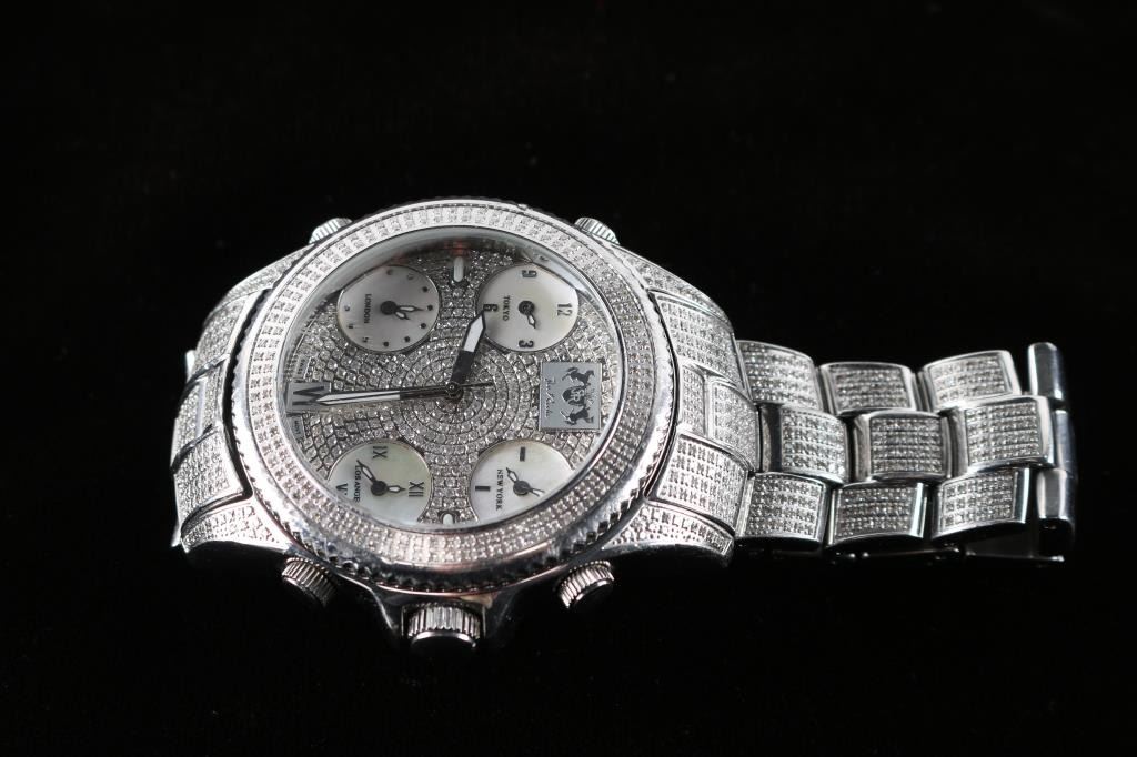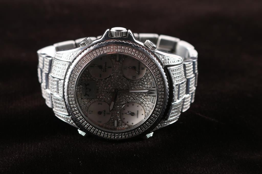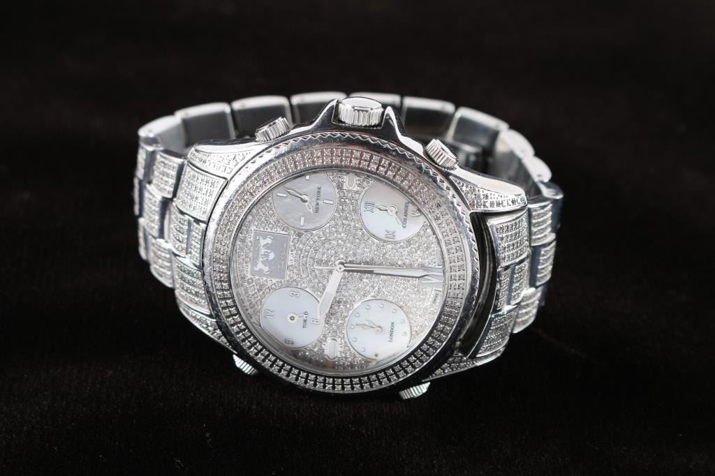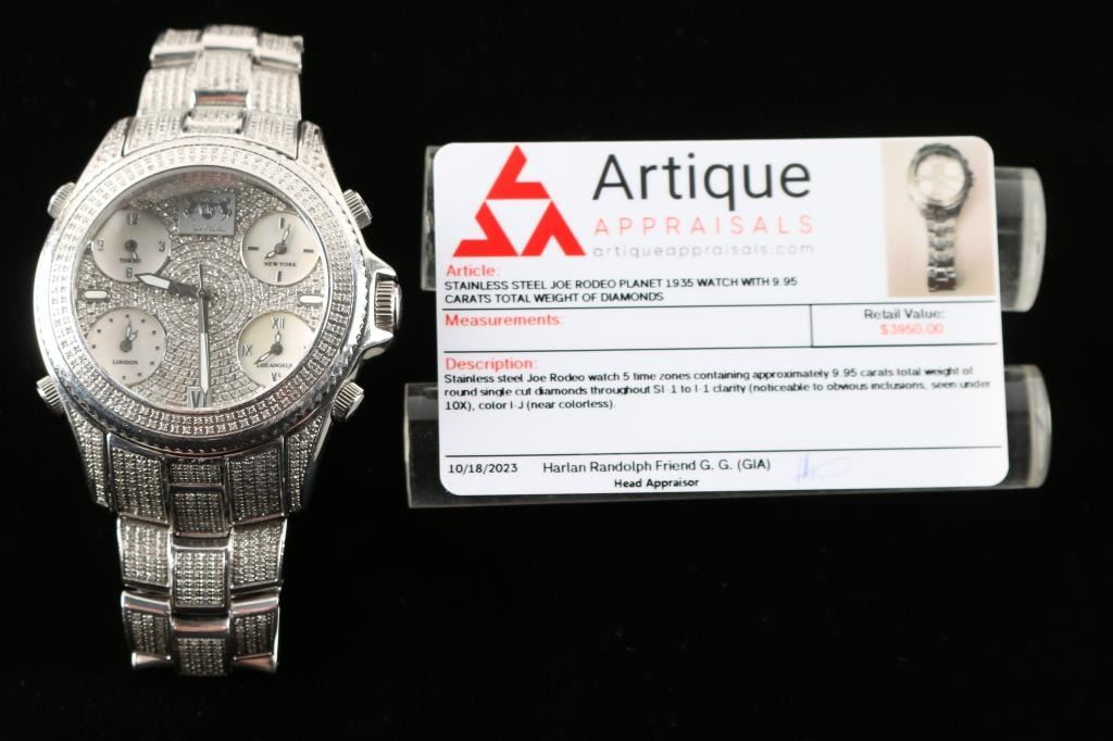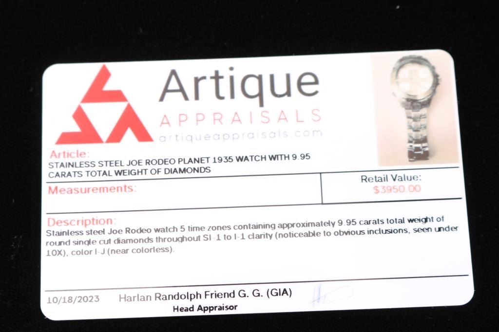 Stainless steel Joe Rodeo Planet 1935 Watch with 9.95 carats total weight of round single cut diamonds throughout. Comes with an Artique Appraisal dated 10/18/23 by Harlan Randolph Friend G.G. (GIA), with a stated retail value of $3,950.