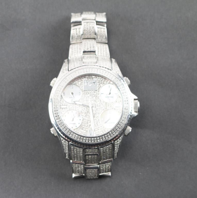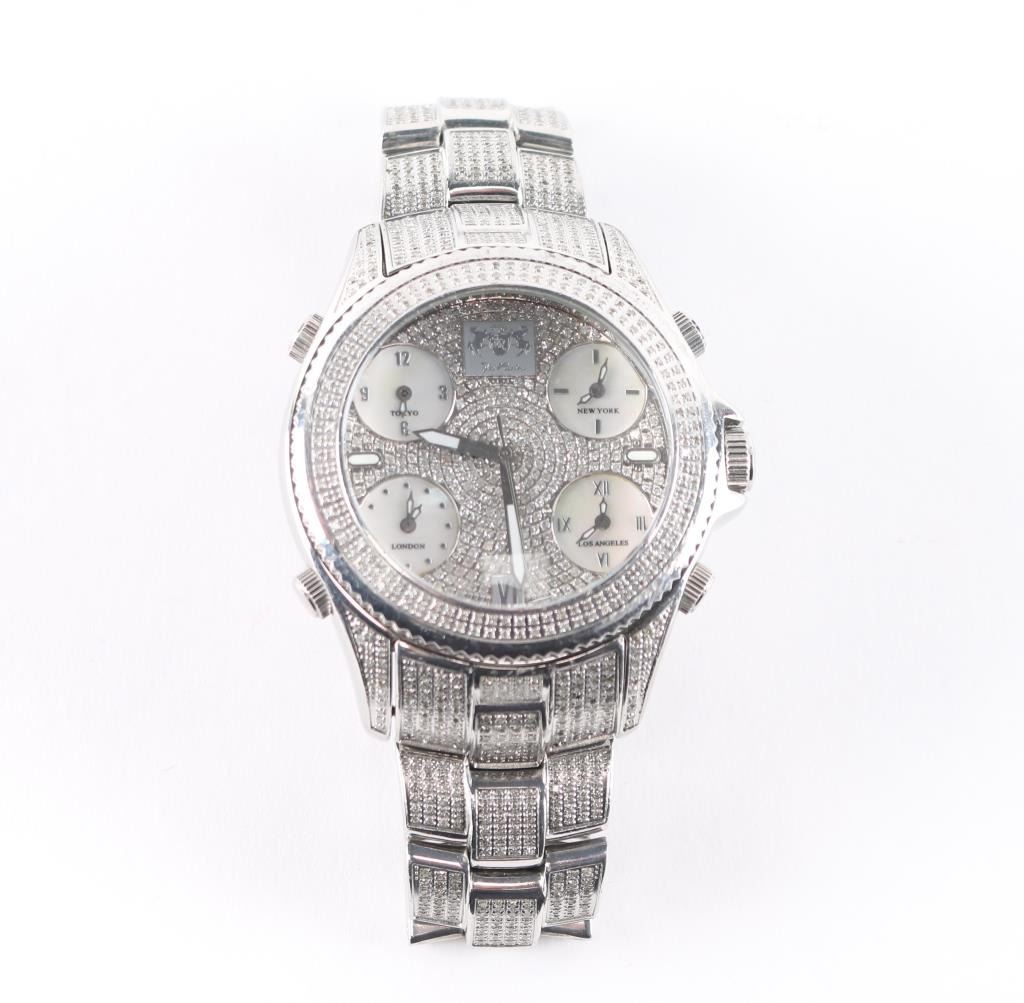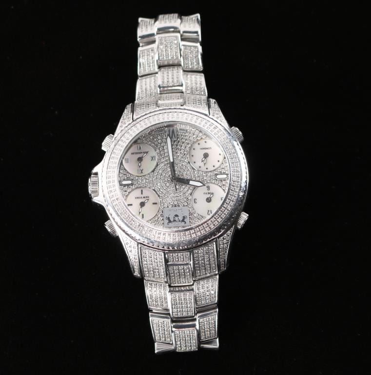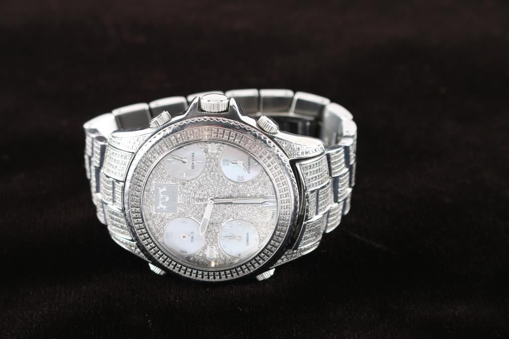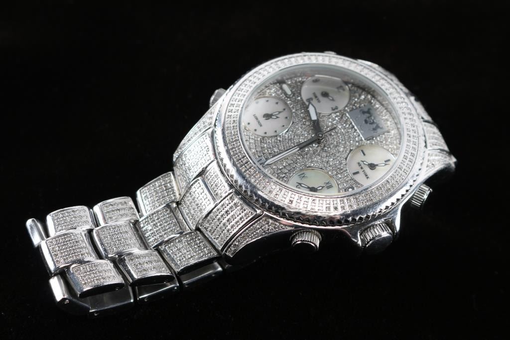 Stainless steel Joe Rodeo Planet 1935 Watch with 9.95 carats total weight of round single cut diamonds throughout. Comes with an Artique Appraisal dated 10/18/23 by Harlan Randolph Friend G.G. (GIA), with a stated retail value of $3,950.