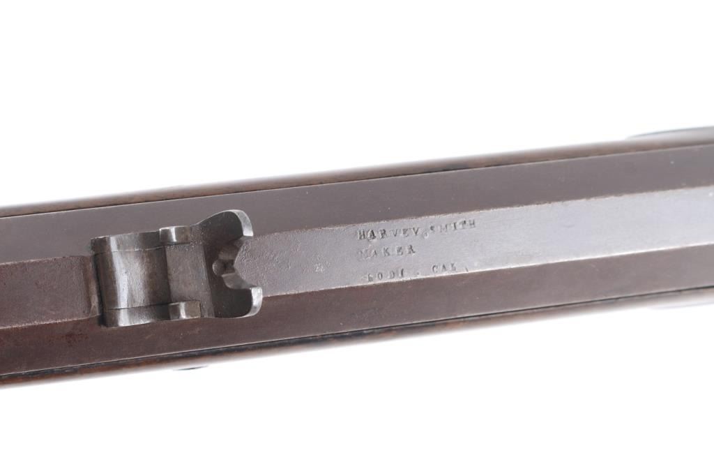 Heavy barrel California made percussion target rifle marked Harvey Smith maker, Lodi, California. Lodi, California is near Sacramento and the Gold Rush area of California. From the Larry Shelton collection, author of "California Gunsmiths." The rifle is approximately 46 caliber with 31 1/2" heavy octagon barrel and turned at the end for false mizzle with matching bullet starter and false muzzle. Engraved lock and iron mounts double set triggers, unique buckhorn rear sight marked "Lodi". Good quality grained walnut checkered stock with wide checkering at the wrist. An old rod included of right type. Action and triggers work well. An unusual rifle as to location of manufacturing. Tang sight missing. Good condition overall with normal aging and imperfections. Weighs 12.85 lbs. Note: This maker 1881-1884 worked mostly as a wagon maker but also trained as a gun smith.Condition is NRA Good***Antique Firearm***