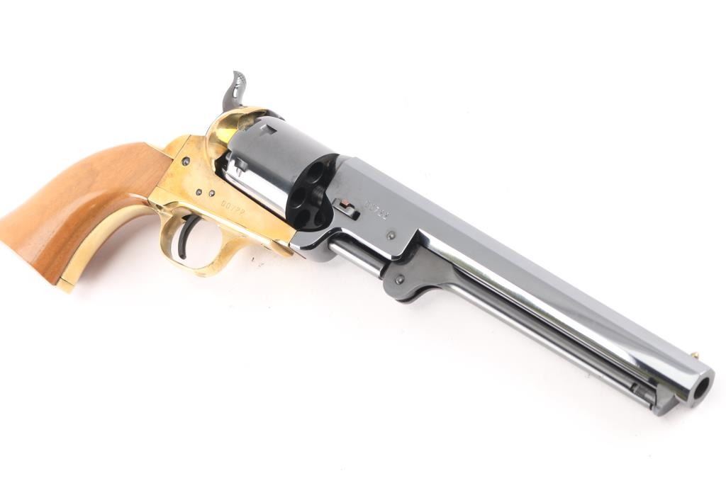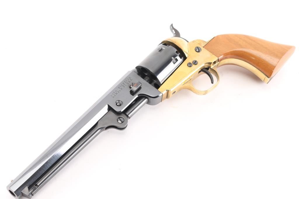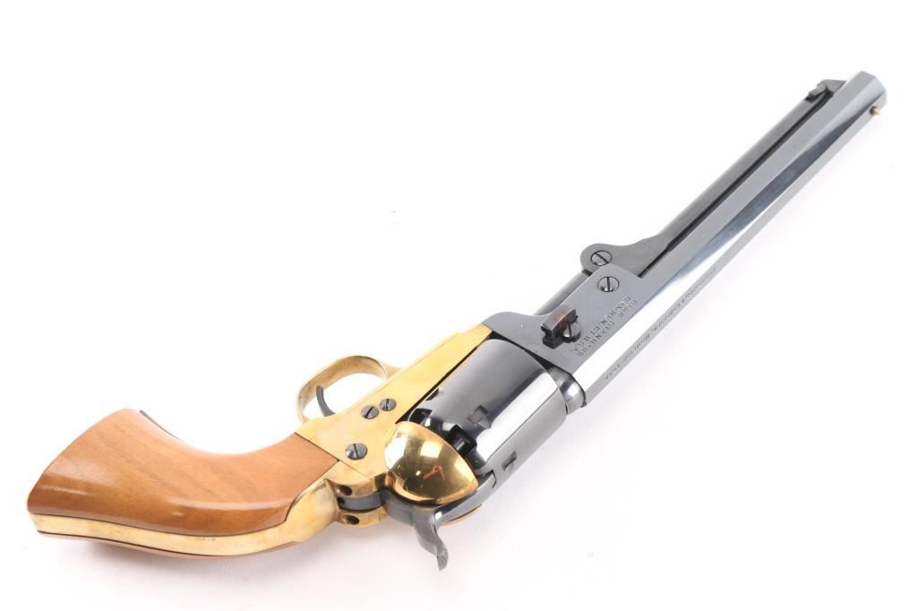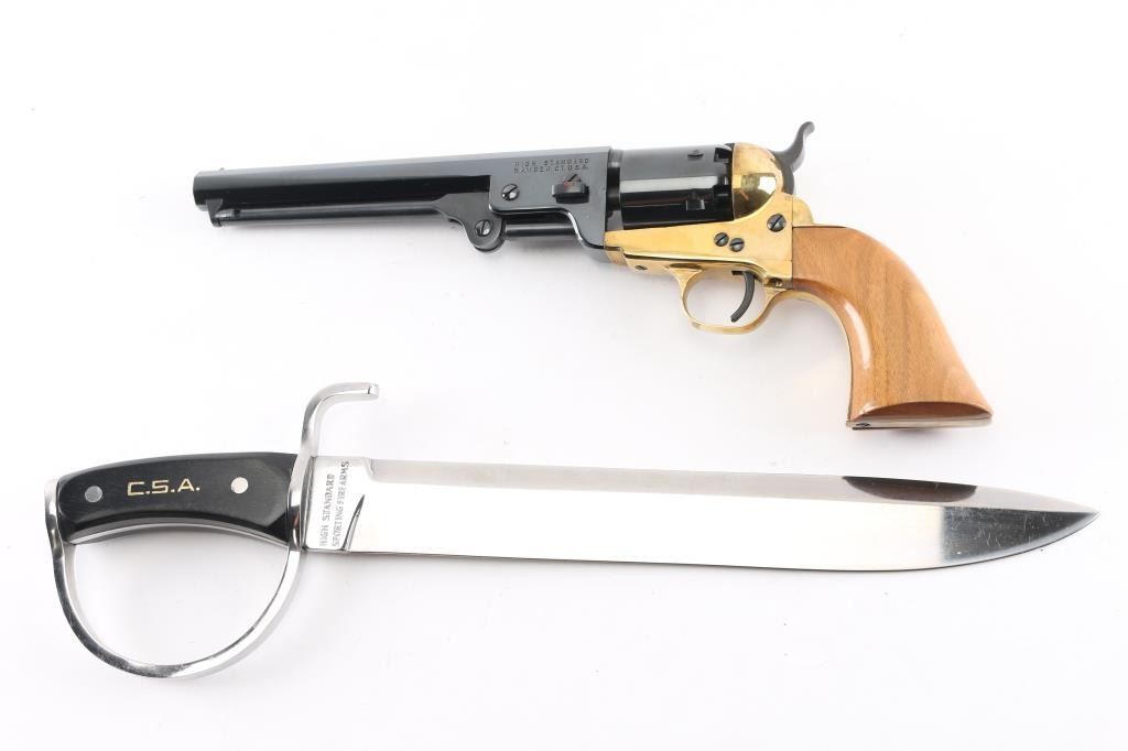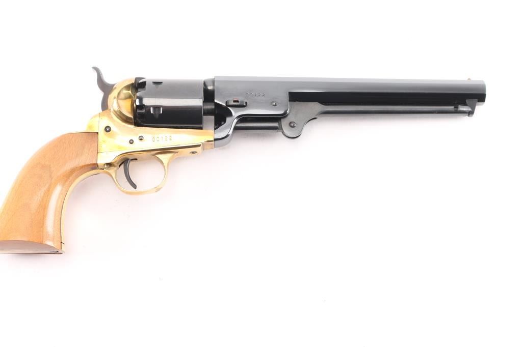 SN: 00722 “Arms of the Confederacy Series” High quality reproduction single action percussion revolver chambered for .36 caliber ammunition. Manufactured in Hamden, CT circa 1974-1976. Features a high polish blued finish, 7 1/2" octagon barrel, brass cone front sight, v notched rear sight cut into the hammer lip, smooth curved trigger, checkered hammer spur, non-fluted six shot cylinder, brass frame, triggerguard & backstrap, and one-piece smooth wood grip. Includes a factory commemorative case with fitted interior containing a serial number matched D-guard bowie knife, commemorative coin, keys and documents. Revolver retains nearly all of its original blued finish showing only minor handling marks and a very faint drag line on the cylinder. The action is sound, the bore is pristine and the wood grip is excellent.Condition is NRA Excellent.***Antique Firearm***