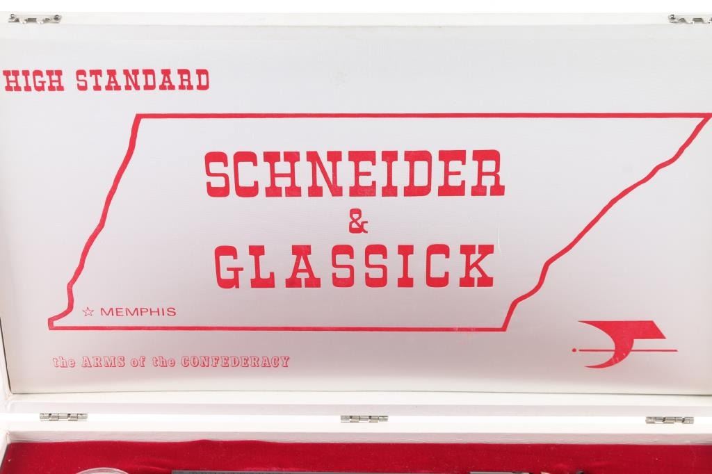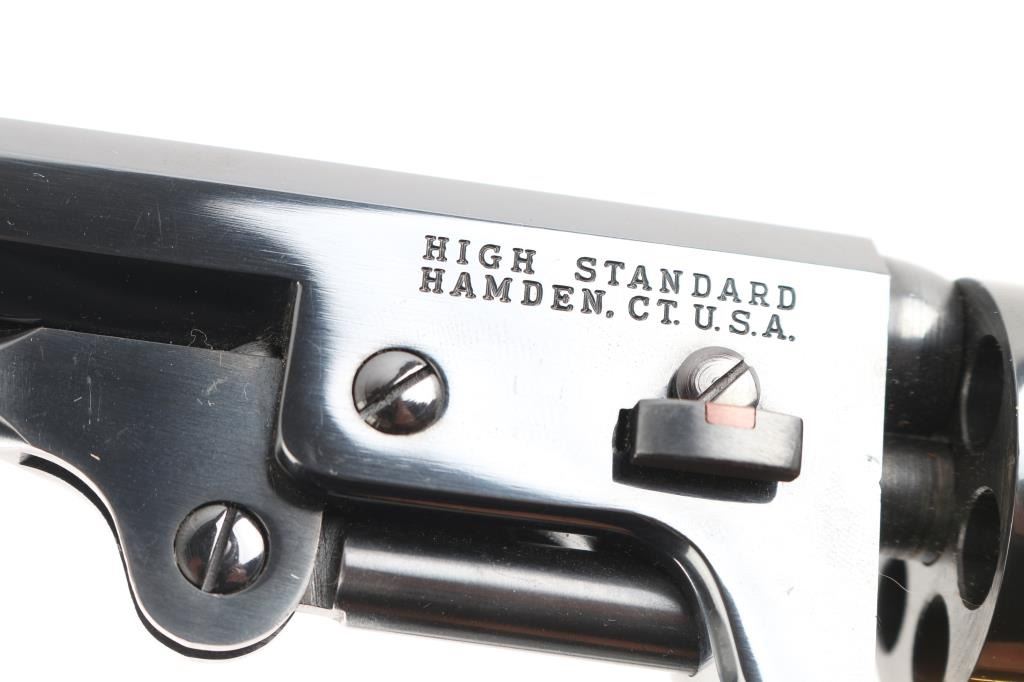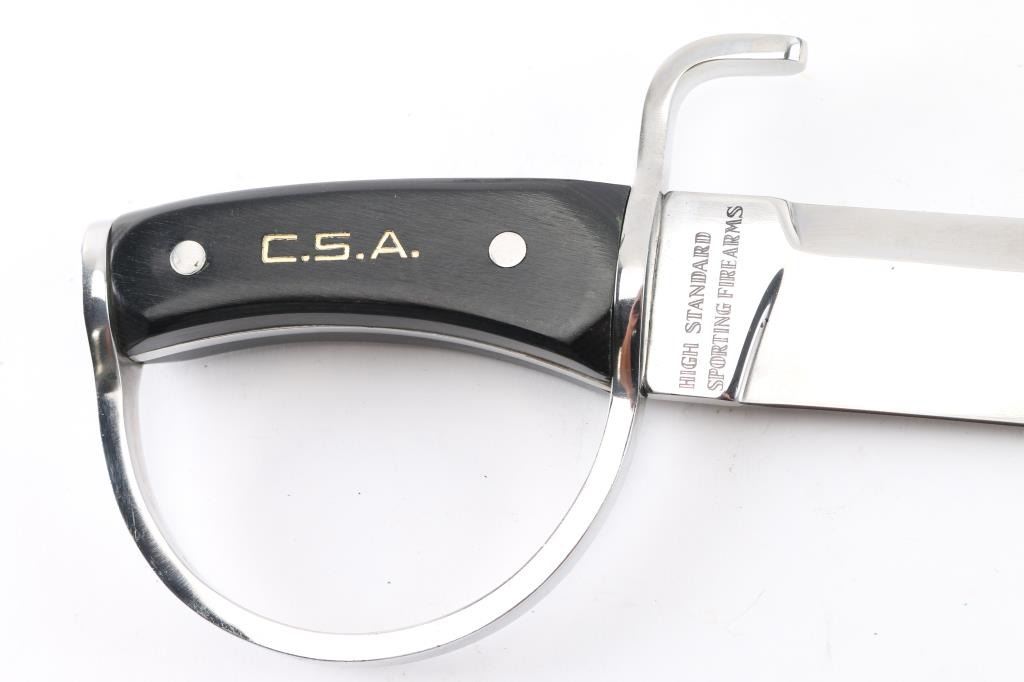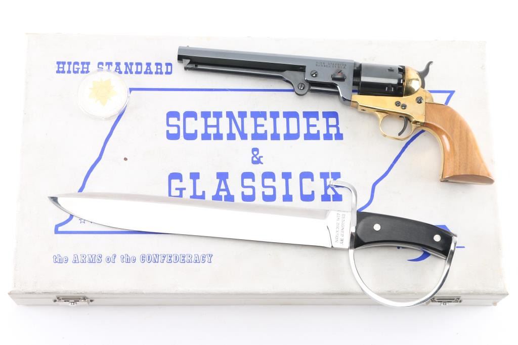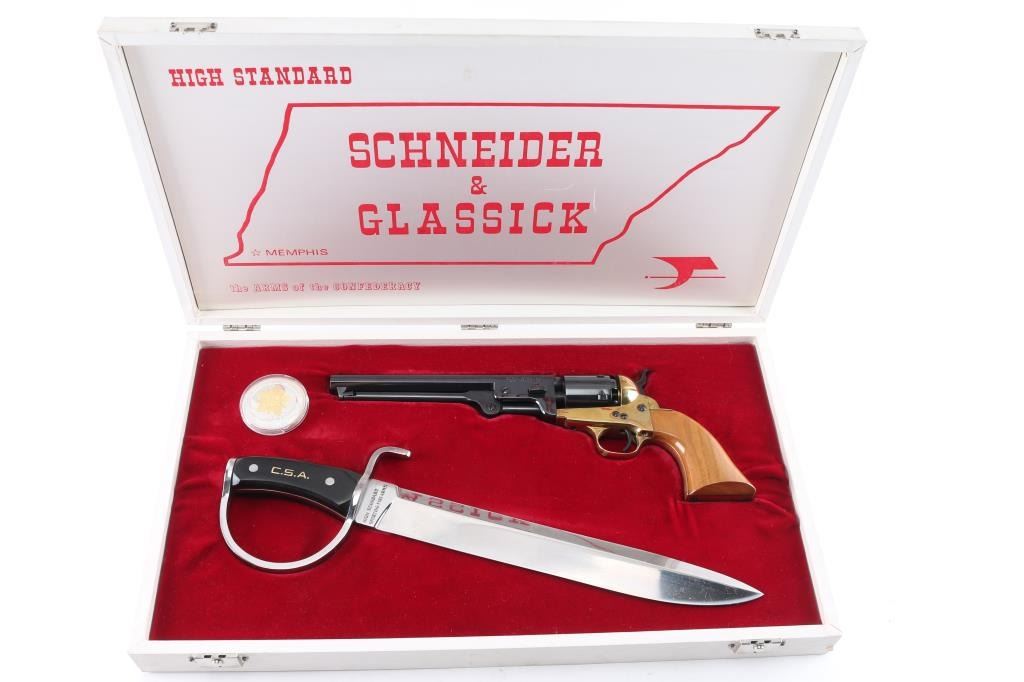 SN: 00722 “Arms of the Confederacy Series” High quality reproduction single action percussion revolver chambered for .36 caliber ammunition. Manufactured in Hamden, CT circa 1974-1976. Features a high polish blued finish, 7 1/2" octagon barrel, brass cone front sight, v notched rear sight cut into the hammer lip, smooth curved trigger, checkered hammer spur, non-fluted six shot cylinder, brass frame, triggerguard & backstrap, and one-piece smooth wood grip. Includes a factory commemorative case with fitted interior containing a serial number matched D-guard bowie knife, commemorative coin, keys and documents. Revolver retains nearly all of its original blued finish showing only minor handling marks and a very faint drag line on the cylinder. The action is sound, the bore is pristine and the wood grip is excellent.Condition is NRA Excellent.***Antique Firearm***