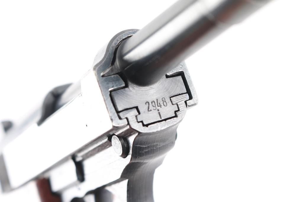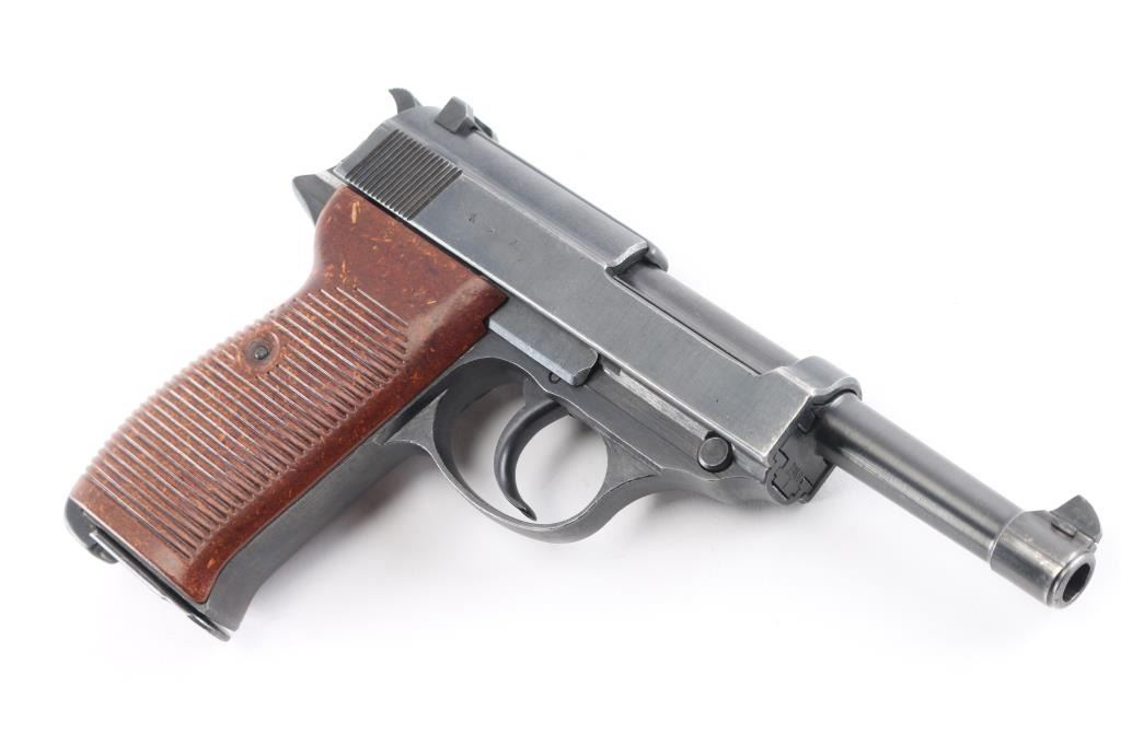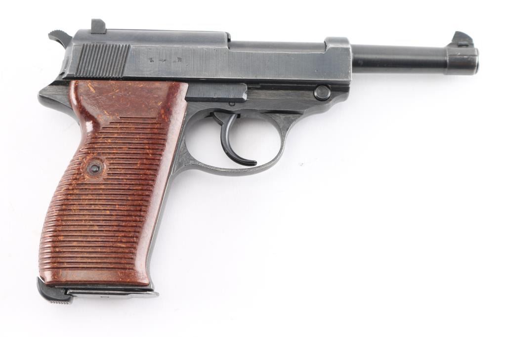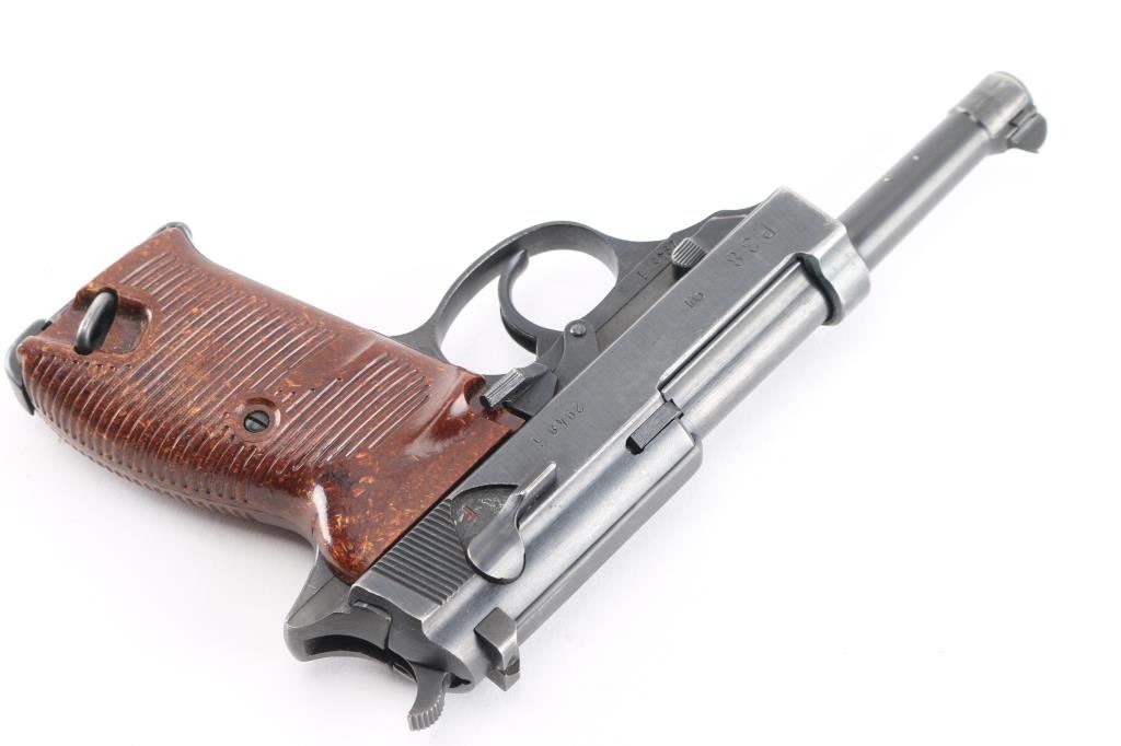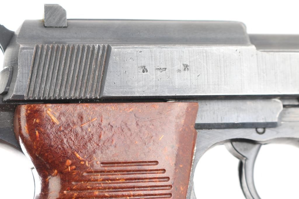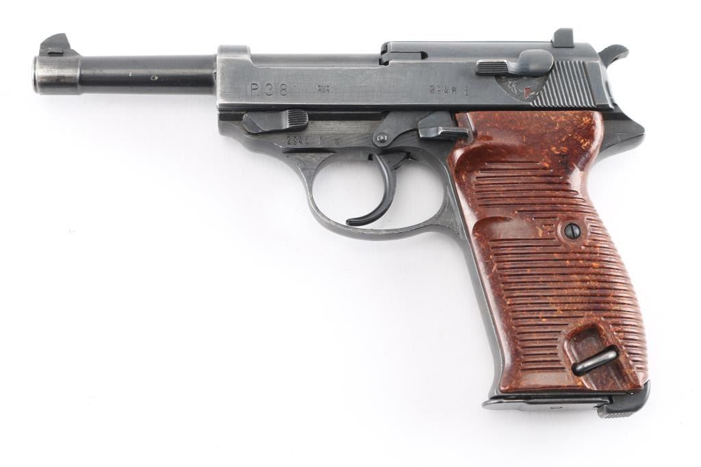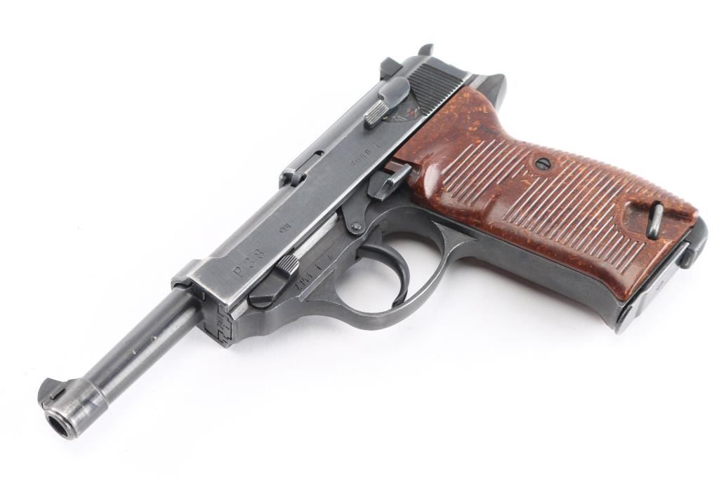 Semi-Automatic. 8 rd Magazine. Third Reich era military issued sidearm. 4.9" barrel. Short recoil, hinged locking piece assisted breechblock. Produced from June 1942 to April 1945 at the Grottau, Czechoslovakia factory. Matching serial numbers including the locking block. Correct Spreewerk waffenamts Eagle/88. Bore is excellent/bright with strong rifling. Bakelite grips very good. Blued finish is about 97% with some minor scratches/edge wear. Original magazine stamped "P.38" with waffenamt Eagle/135, issued with Mauser pistols from byf42 till byf43 c-block (late 42-March 1943) No import marks, bring-back. A nice one!NRA Condition-Very Good. C&R Firearm.