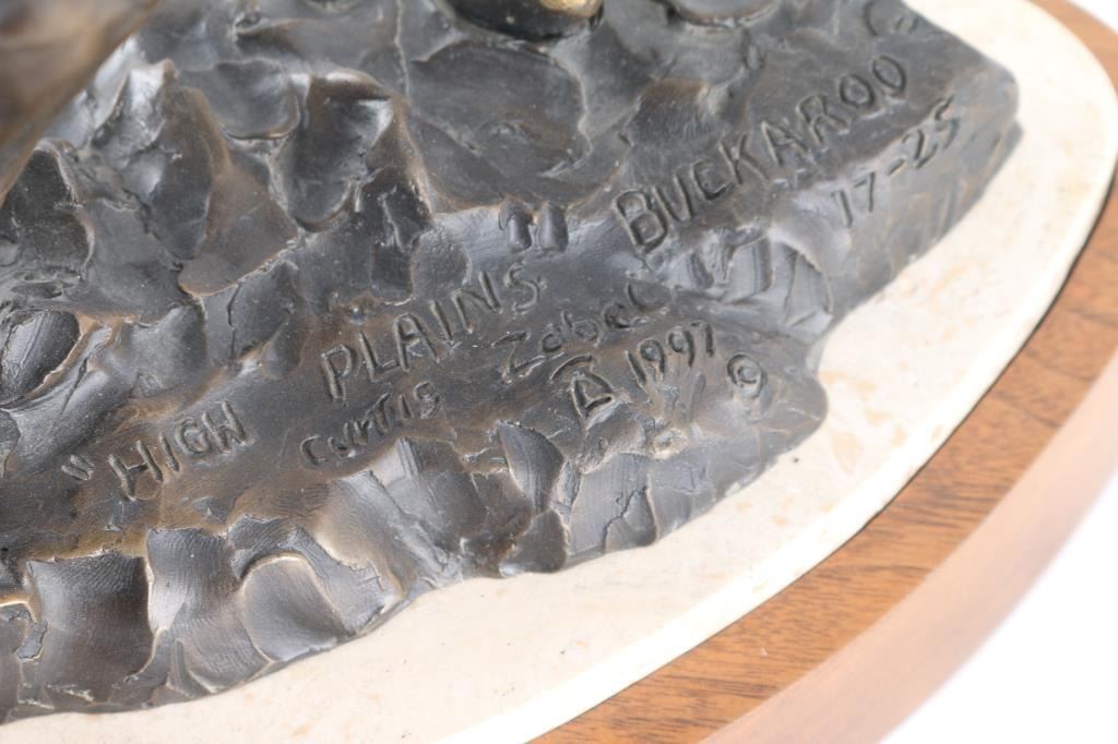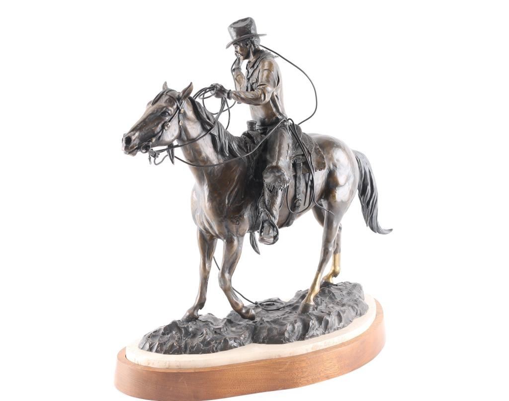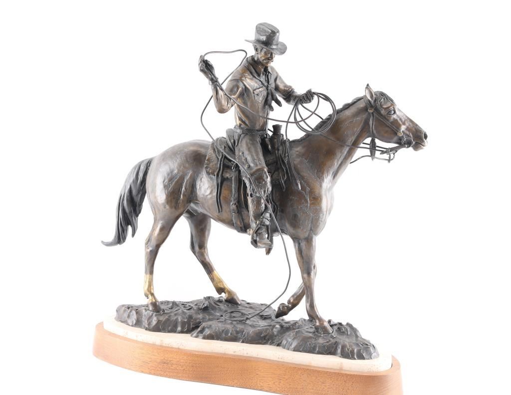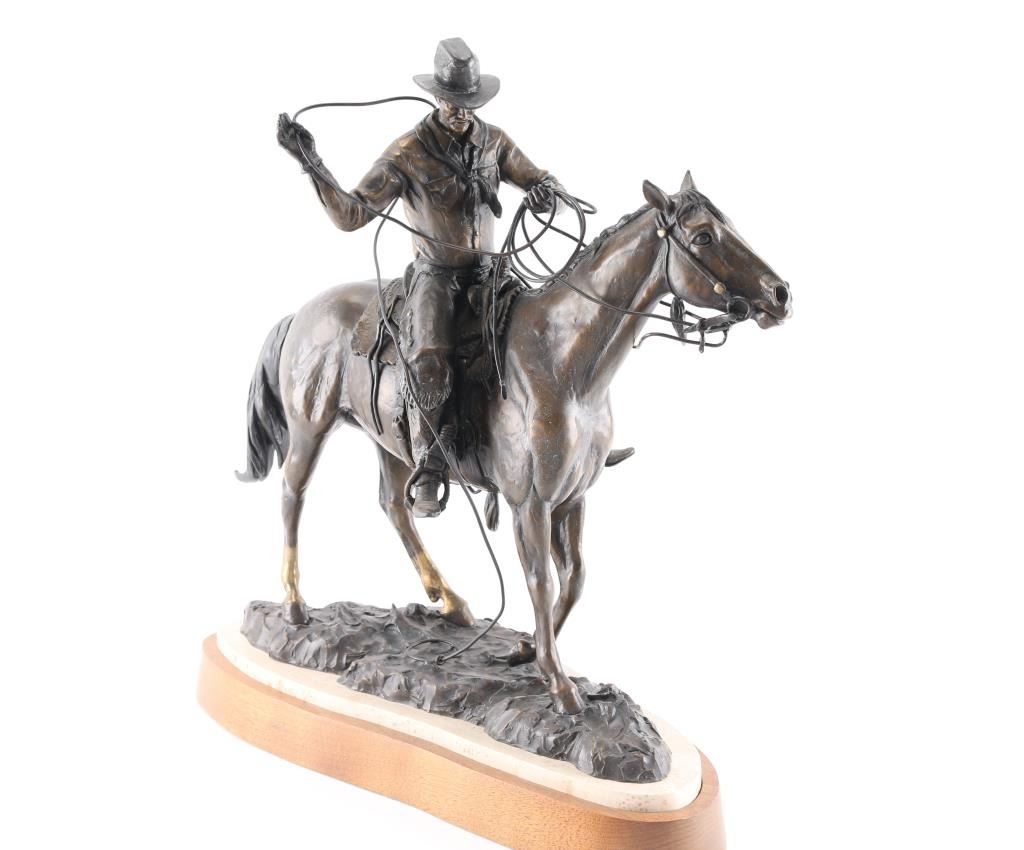 Bronze statue by Curtis Zabel of a cowboy on horseback with lasso. Marked 1997, 17-25. Measures 22"H x 21"W x 8"D. Curtis Zabel (Born 1935) is active/lives in Colorado, Kansas. Curtis Zabel is known for Cowboys and wildlife painting and sculpture.***Buyer must arrange shipping***