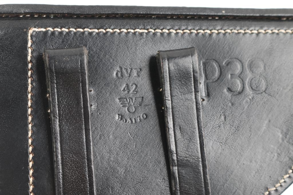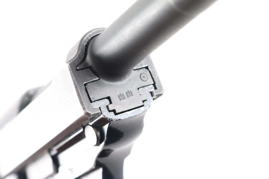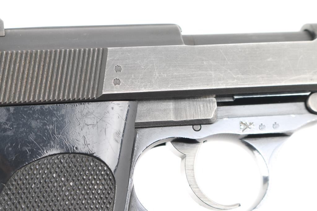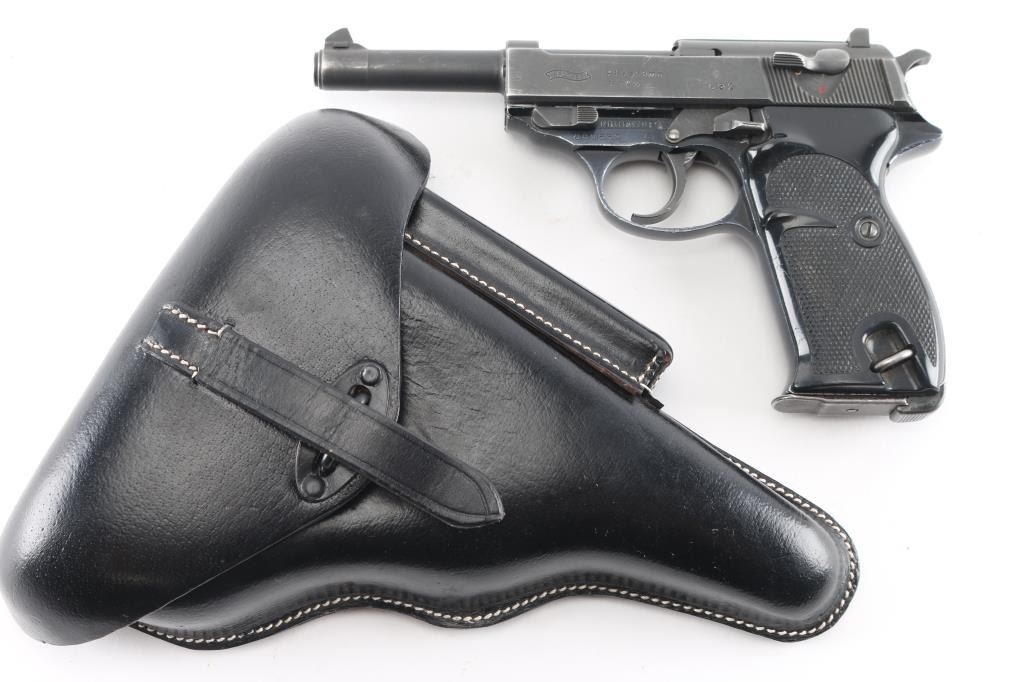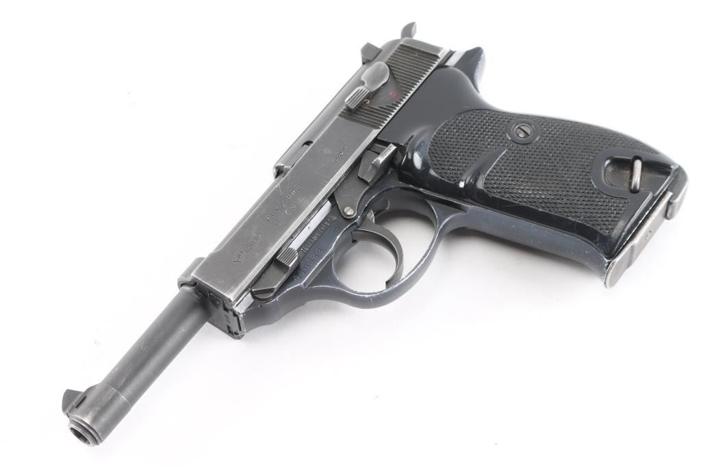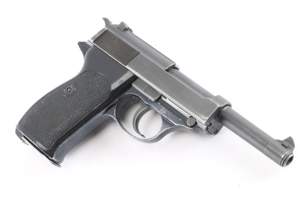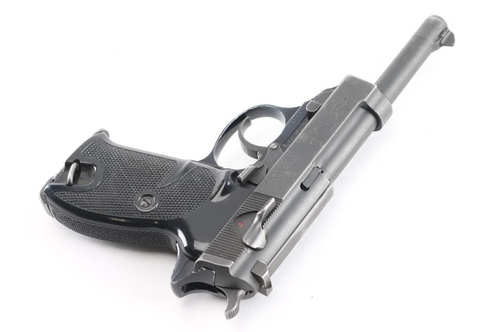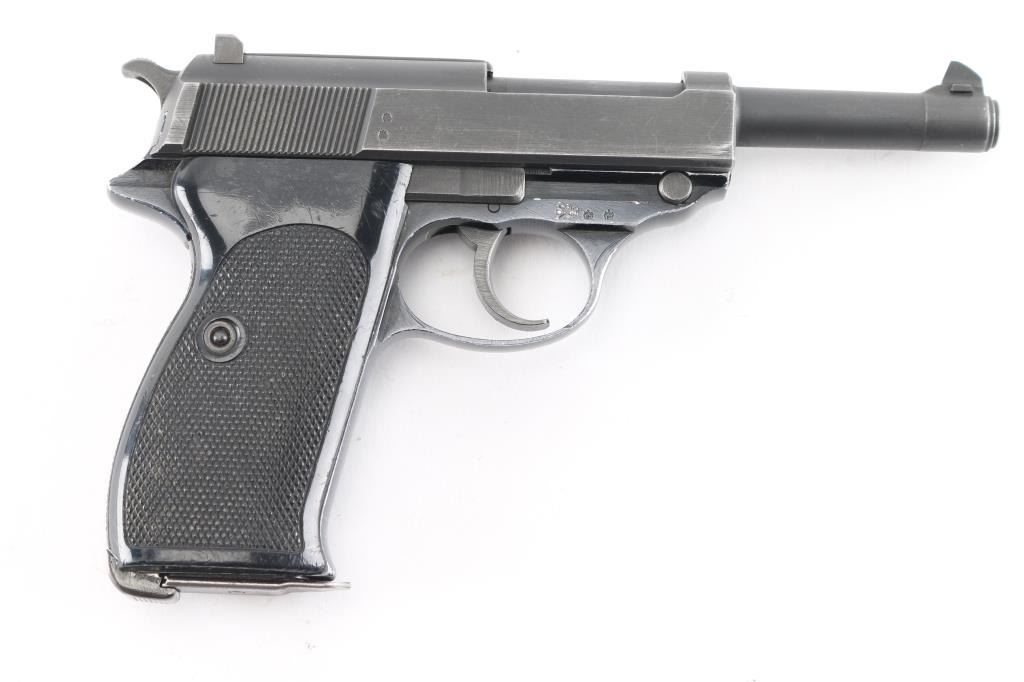 Post-WWII German military double-action semi-automatic service pistol chambered in 9x19mm. Manufactured in Germany circa 1974 and imported by Interarms of Alexandria, VA with import stamp on the frame. Features a matte black finish, 5" barrel, dovetailed blade front sight, fixed rear sight with ‘u’ notch, smooth curved trigger, serrated hammer spur, slide mounted thumb safety/decocker, heel magazine release, factory “P.38” marked 8 round magazine, black finished aluminum frame with lanyard loop, and checkered black plastic wrap-around grips. Includes a later black leather holster marked “dvr/42/[eagle]/WaA170” & “P38”. Matching serial numbers are found on the frame, slide & barrel. Pistol retains approximately 85% of its black finishes showing holster & high point edge wear with scattered scratches. The action is sound, the bore is excellent and the plastic grips are very good with some wear.Condition is NRA Very Good.***Modern Firearm***