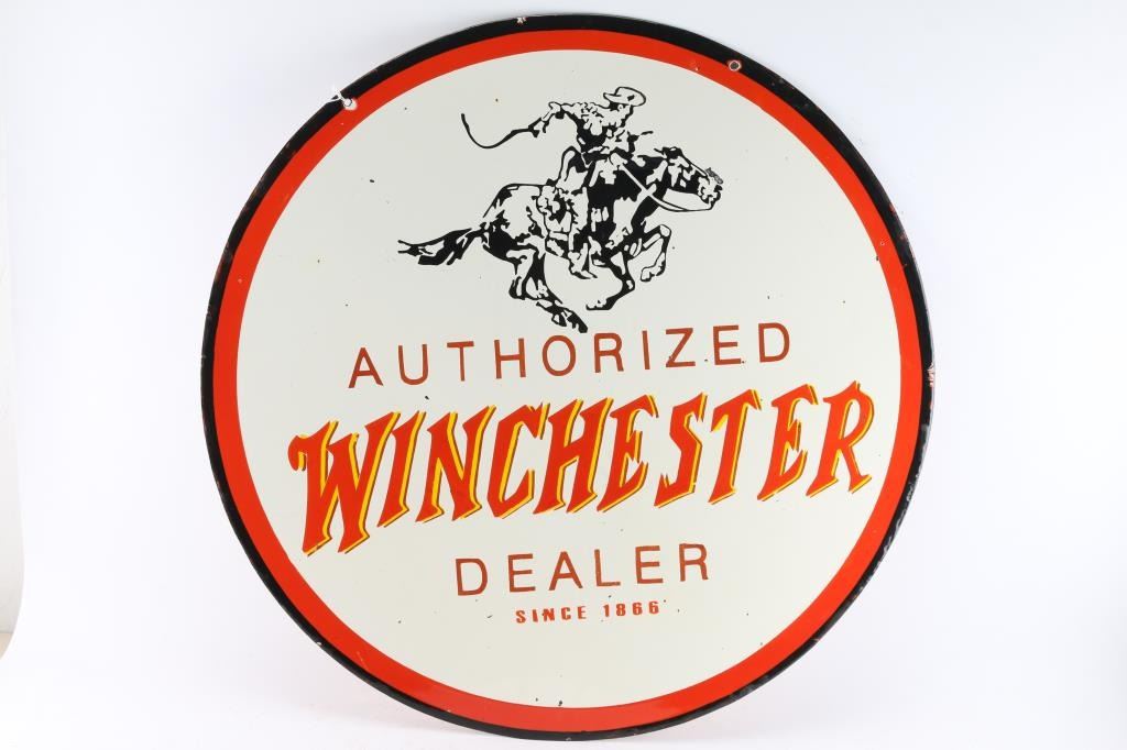 Reads "Authorized Winchester Dealer Since 1866". Measures 30" circumference. In good condition with very minor chips in paint.