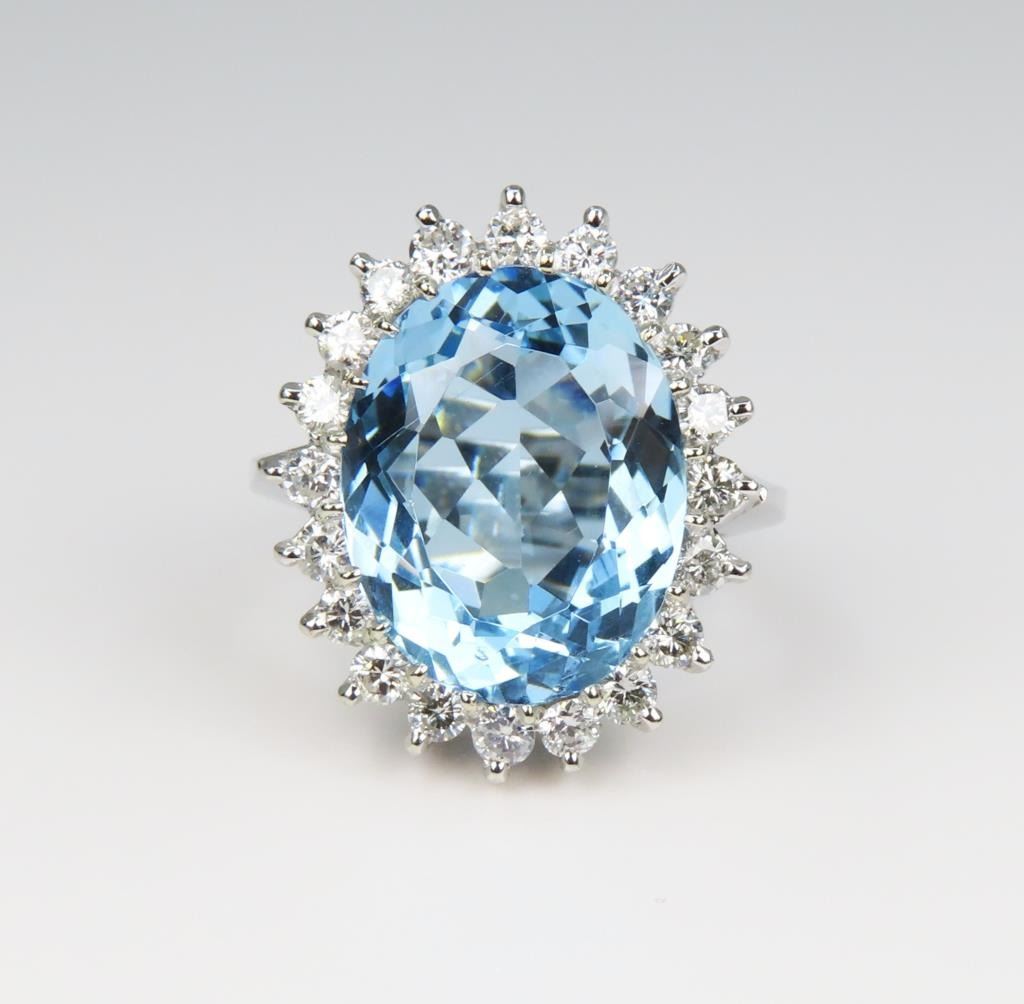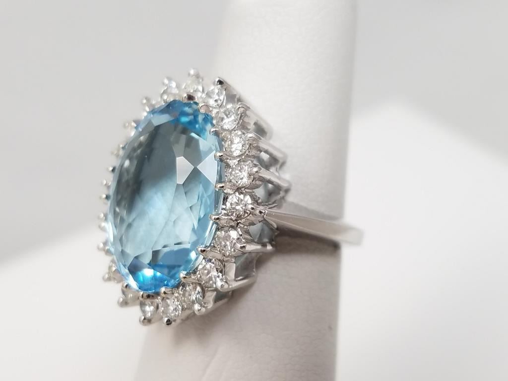 Ring, featuring a natural, extra strong Blue Aquamarine weighing approx. 7.57 carats framed by 20 round Diamonds weighing approx. 1.00 carats with F-G colors and VS-I clarity, set in a classic, custom crafted Princess Diana style mounting, ring size 5. Full Retail Appraisal - $9,800.00.