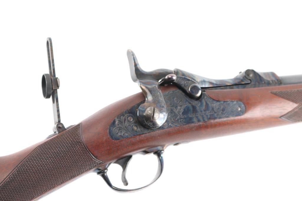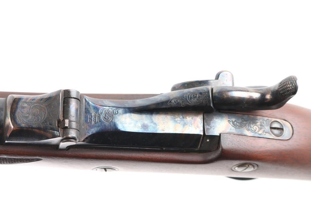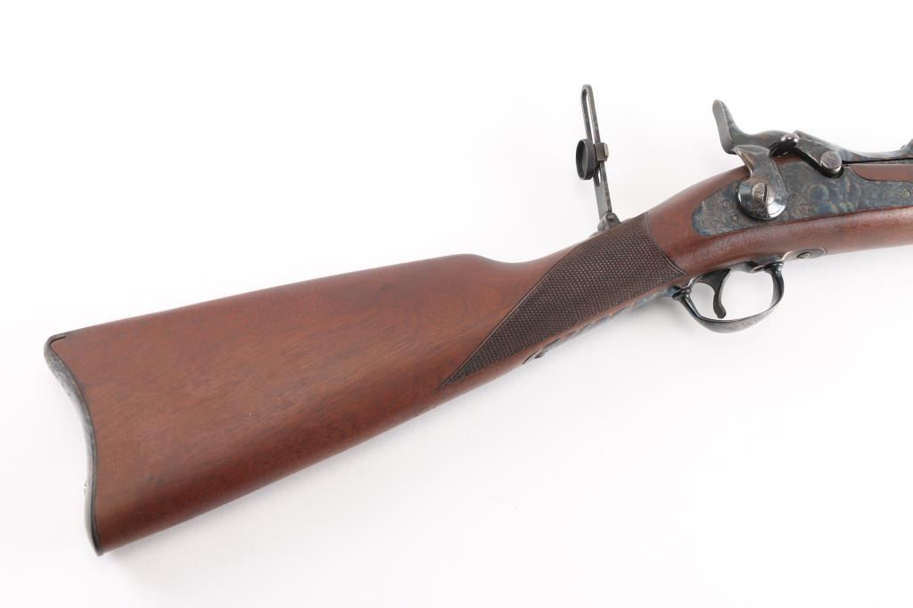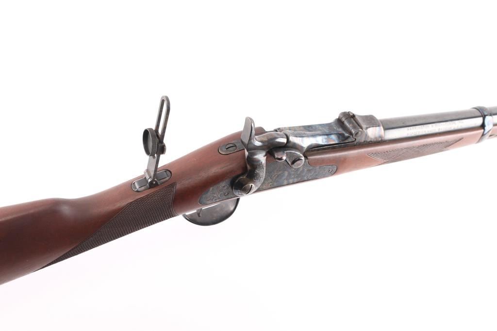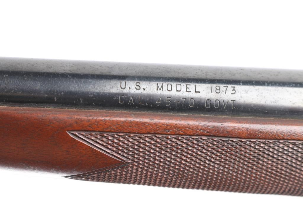 .45-70 Govt SN: 3885. Reproduction of the Springfield 1873 Officers Model trapdoor rifle chambered in .45-70 Government. Features a blued/case hardened finish, 26" round barrel, dovetailed blade front sight with brass bead, tang mounted adjustable flip rear aperture sight, blonde wood cleaning rod, serrated trigger, scroll engraved action, hammer and lock plate, checkered hammer spur, pewter forend cap and checkered walnut stock with case colored metal buttplate. Has correct markings on lock plate, buttplate tang has "U.S." and the underside of the buttstock has the "P" in circle cartouche. Rifle exhibits vivid case colors and approximately 99% of the blued finish on the barrel. Action is sound, bore is excellent/bright and wood stock is excellent. Manufactured in early to mid 1970s.NRA Condition-Excellent. Modern Firearm.