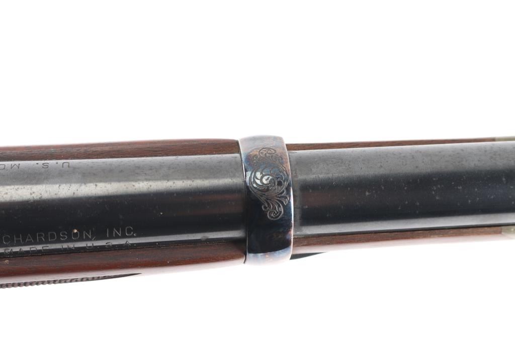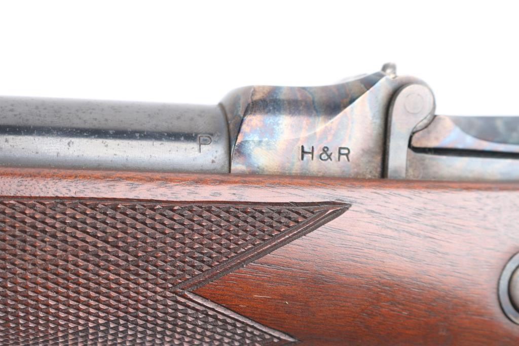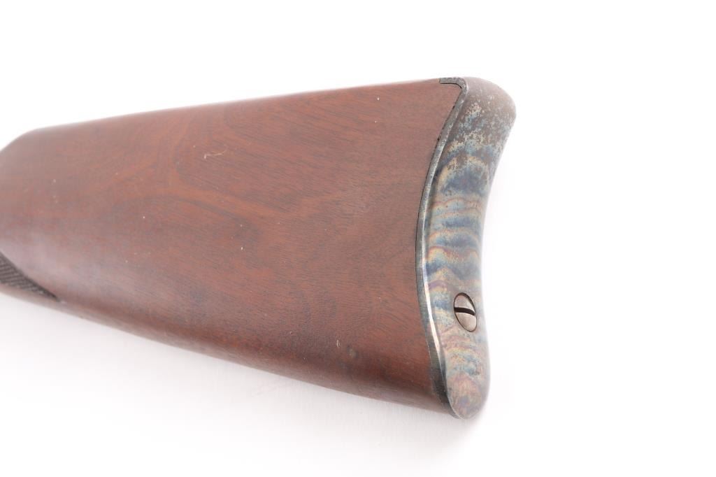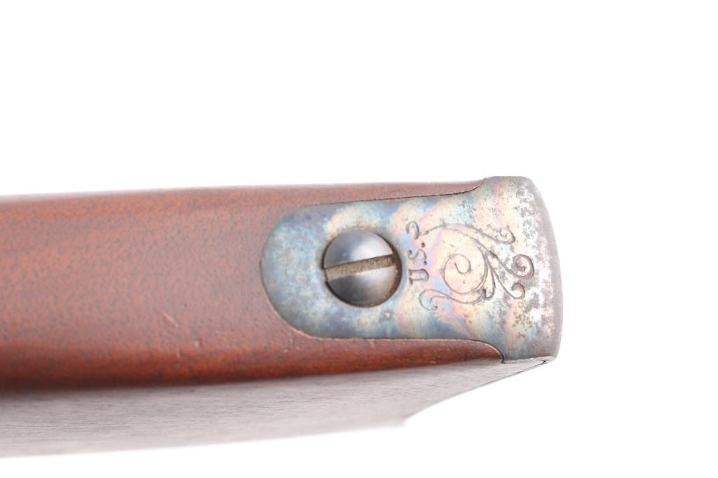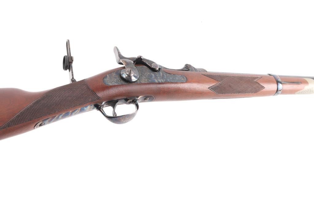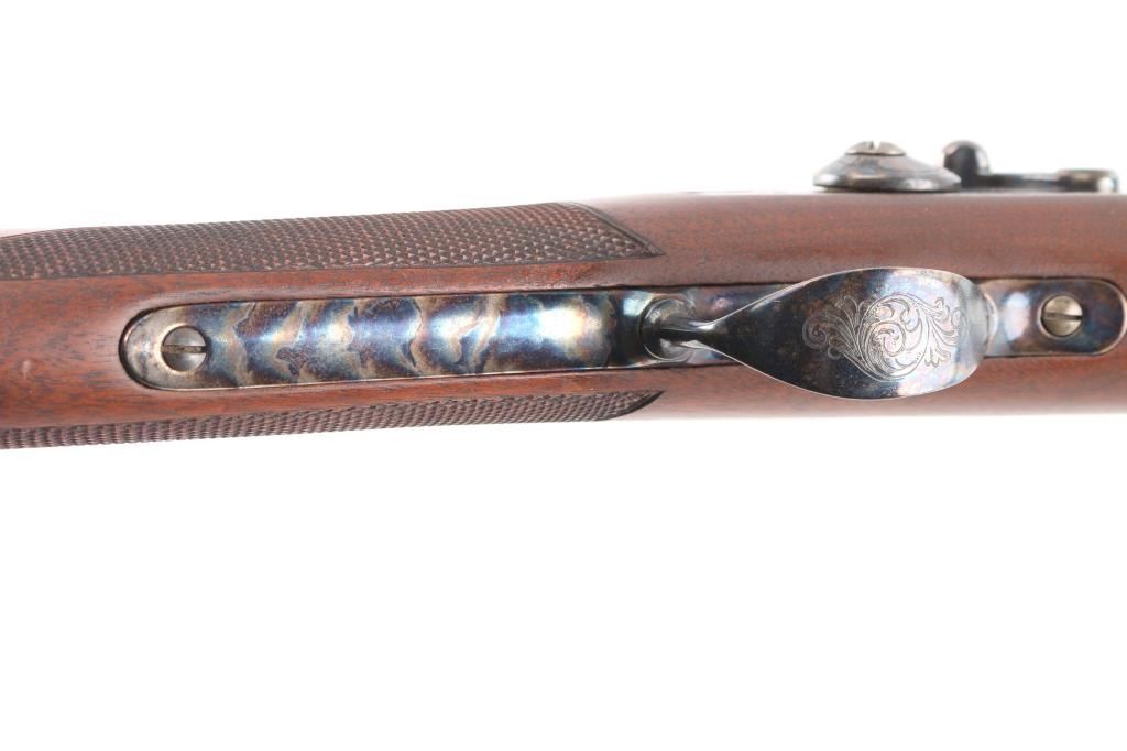 .45-70 Govt SN: 3885. Reproduction of the Springfield 1873 Officers Model trapdoor rifle chambered in .45-70 Government. Features a blued/case hardened finish, 26" round barrel, dovetailed blade front sight with brass bead, tang mounted adjustable flip rear aperture sight, blonde wood cleaning rod, serrated trigger, scroll engraved action, hammer and lock plate, checkered hammer spur, pewter forend cap and checkered walnut stock with case colored metal buttplate. Has correct markings on lock plate, buttplate tang has "U.S." and the underside of the buttstock has the "P" in circle cartouche. Rifle exhibits vivid case colors and approximately 99% of the blued finish on the barrel. Action is sound, bore is excellent/bright and wood stock is excellent. Manufactured in early to mid 1970s.NRA Condition-Excellent. Modern Firearm.