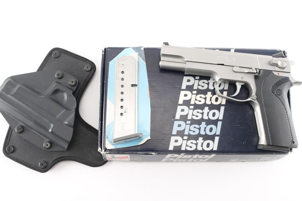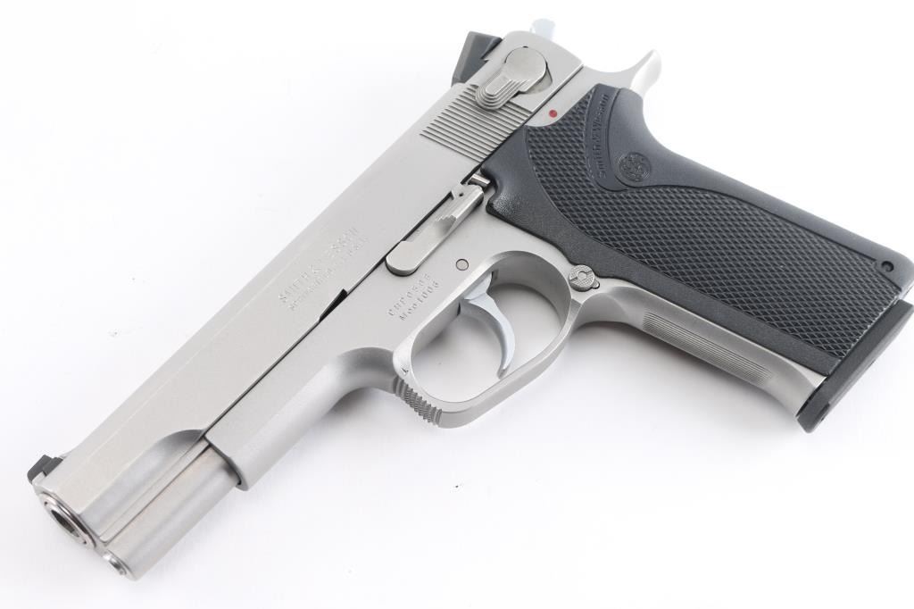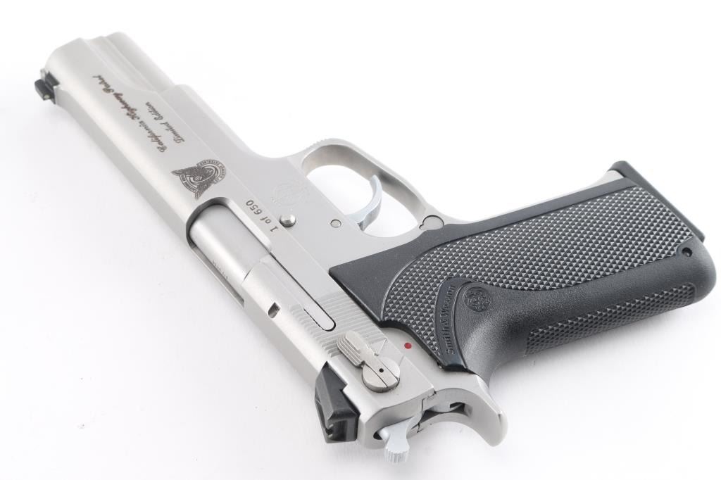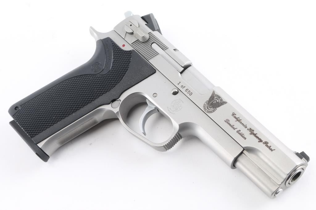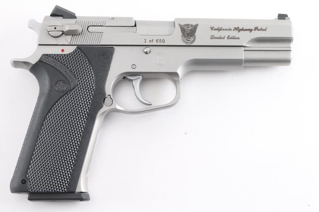 "California Highway Patrol Limited Edition" 1 of 650. The Model 1006 is a special edition pistol that was made to commemorate the California Highway Patrol (CHP). It was produced in 1990 and is a rare variation. The left side of the slide is marked “SMITH & WESSON / SPRINGFIELD, MA U.S.A.”. The right side of the slide is marked “1 of 650” followed by a symbol with a winged motorcycle wheel with banners above and below that read “CALIFORNIA HIGHWAY PATROL”, the left top forward portion of the trigger guard is marked with an upside-down “T” and the right side of the frame has an S&W logo. Recoil operated double-action/single-action semi-automatic 5" barrel, 3-dot dovetailed sights, ambidextrous decocker/safety, matte stainless steel finish, The grips are a one piece checkered black Delrin stock that wraps around the back strap of the frame; the fore strap is serrated. Overall Excellent condition. Comes in blue factory box with matching label, with two spare 9 rd magazines, (3) total. Also included is a Alien Gear right handed modular holster.NRA Condition-Excellent. Modern Firearm.