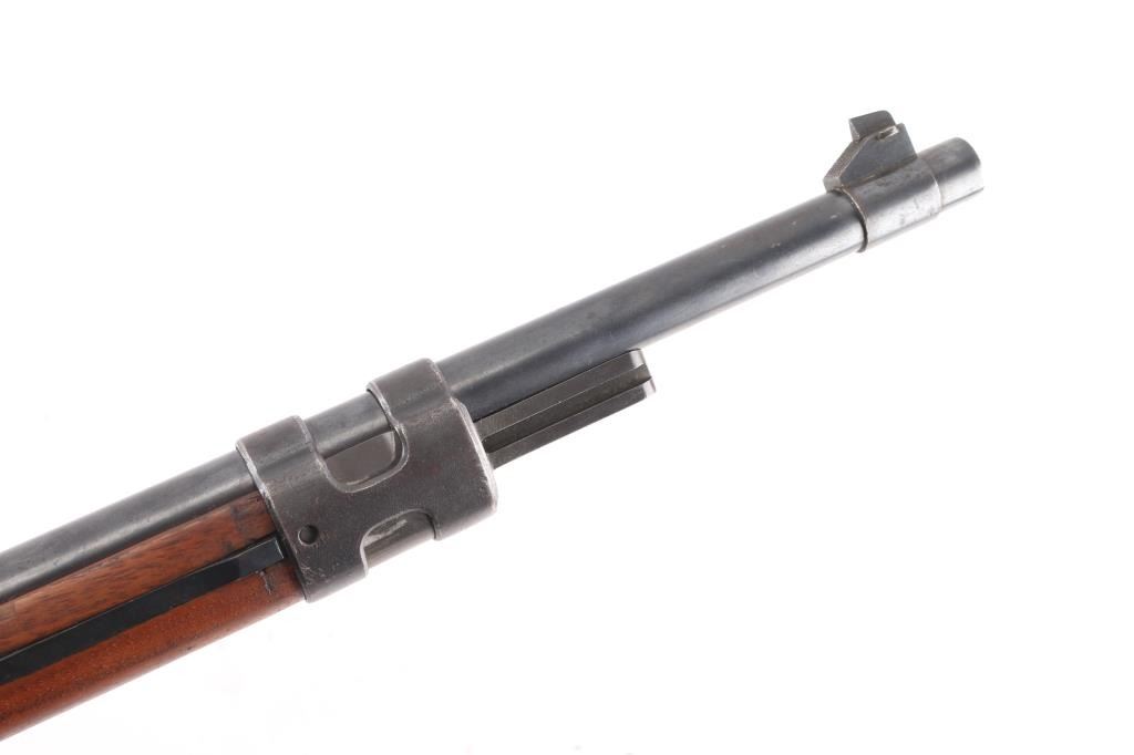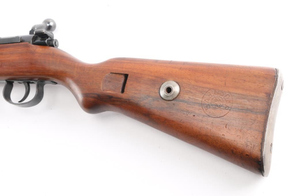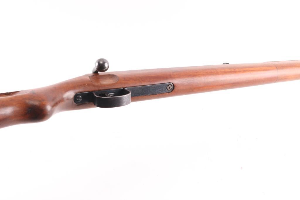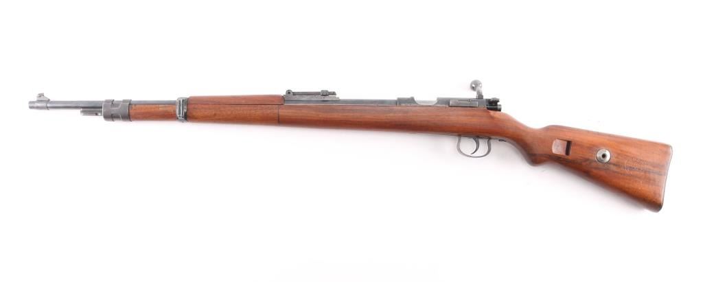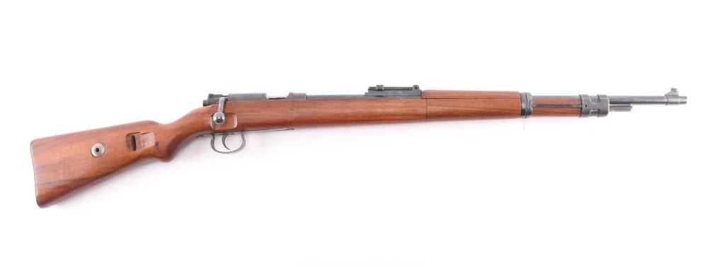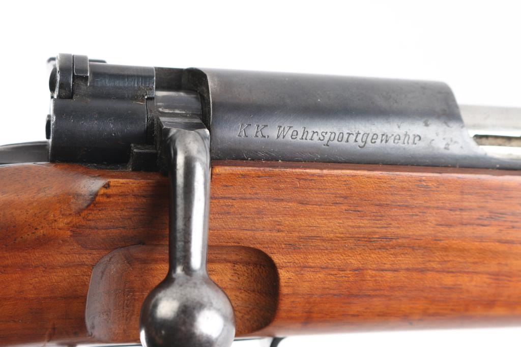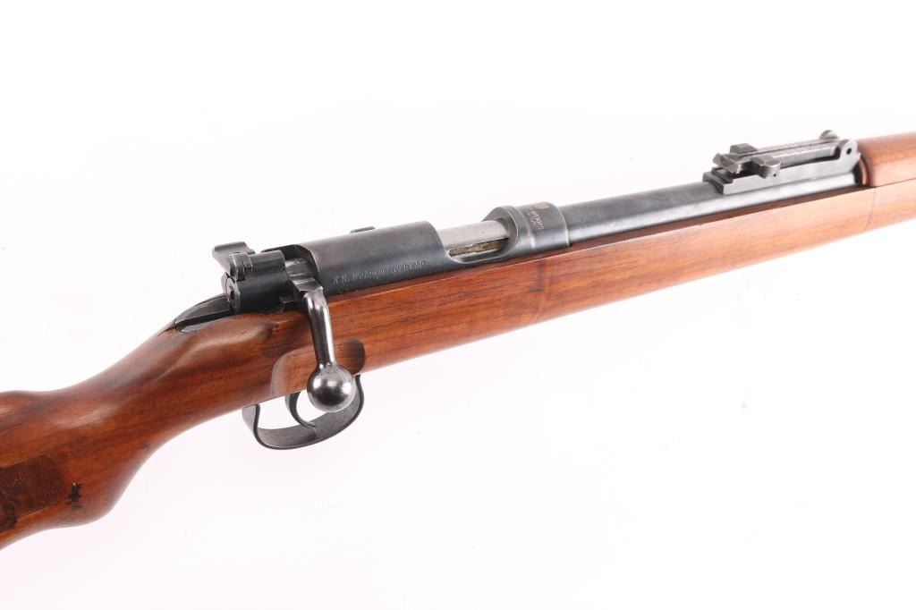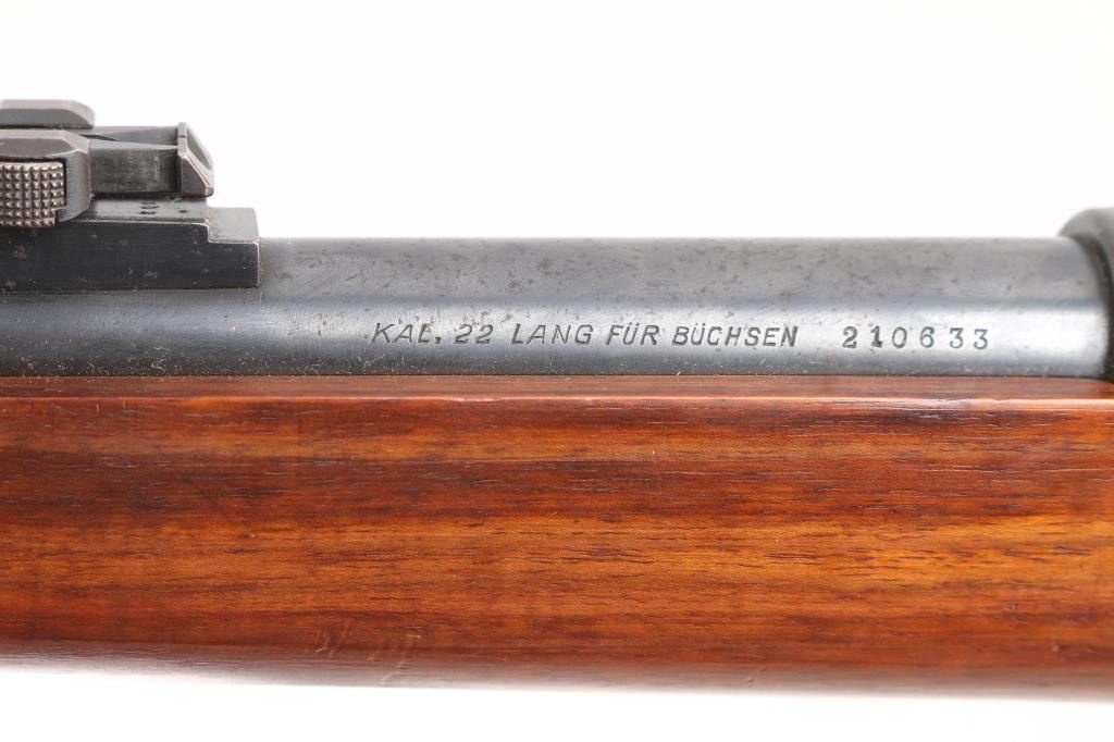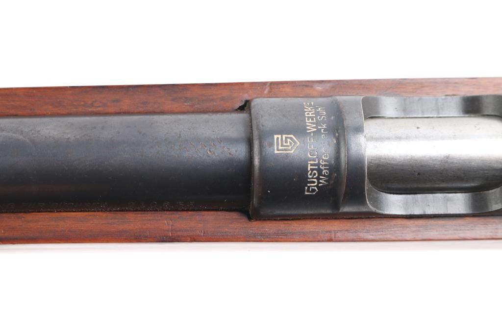 SN: 210633. This is a very good example of an prewar WWII German Nazi Party .22 caliber single shot training rifle. These rifles were a standard prewar training rifle that was pressed into service by Germany during the prewar days to provide a low cost training rifle to all military forces. They were specifically intended to duplicate the feel, weight and functioning of the standard K98 rifle. The top of the receiver ring is marked with the stylized "G" logo over "GUSTLOFF-WERKE / Waffenwerk-Suhl" with the right rear side marked " KK. Wehrsportgewehr". The left rear side of the barrel is marked "KAL 22 LANGE FUR BUCHSEN", followed by the serial number. It has the military style inverted "V" front sight and tangent rear sight, graduated from 25-200 feet. The stock is European walnut with two barrel bands, front is the "H" style, hand guard, bayonet lug, sling swivels, and steel butt plate, bolt take-down disc. No cleaning rod. Action is smooth, bore is excellent/ bright, Blue is about 90% with minor scratches, handling wear on the bolt knob, wood is very good overall, a few minor scratches and the forward portion of the handguard duffel cut & spliced with another stock. Front barrel band mismatched, no cleaning rod. Left side of the butt stock has the SA d.NSDAP cartouche in circle,SA- the Sturmabteilung; SA; literally "Storm Division" or Storm Troopers) was the original paramilitary wing of the Nazi Party., NSDAP-National Socialist German Workers Party. (The Nazi Party.)NRA Condition - Very Good C&R firearm.