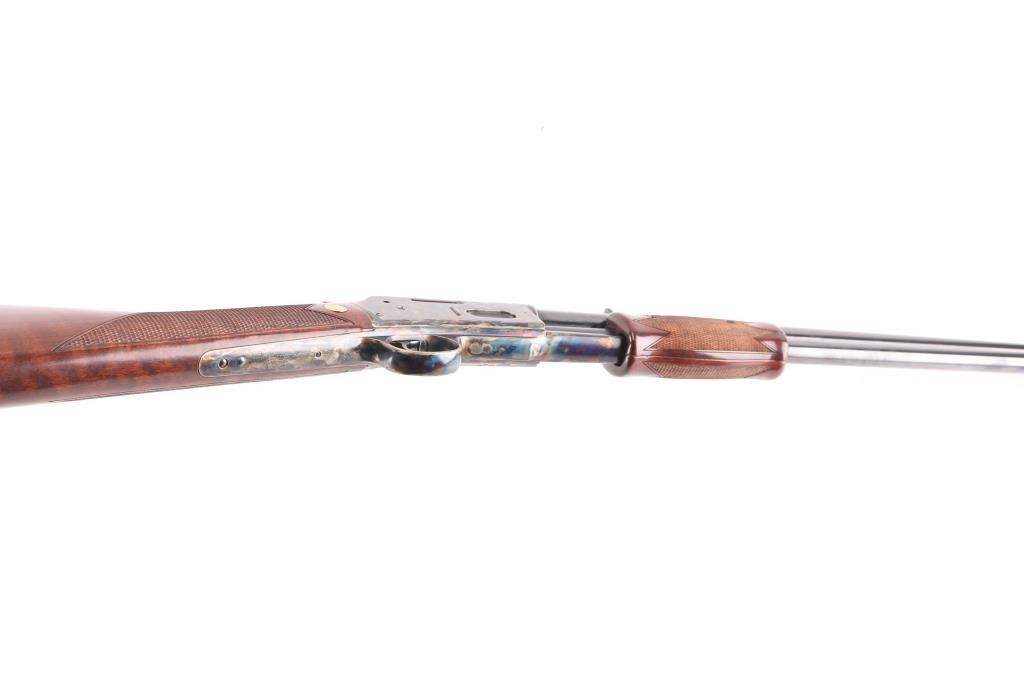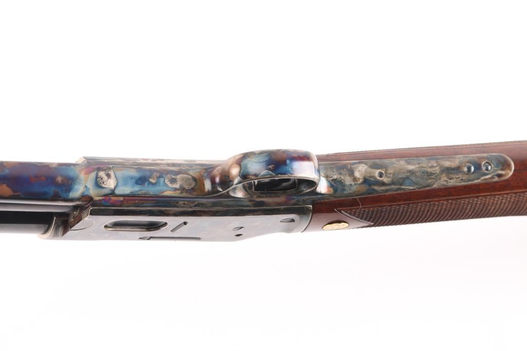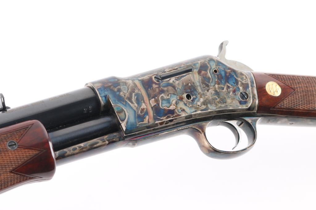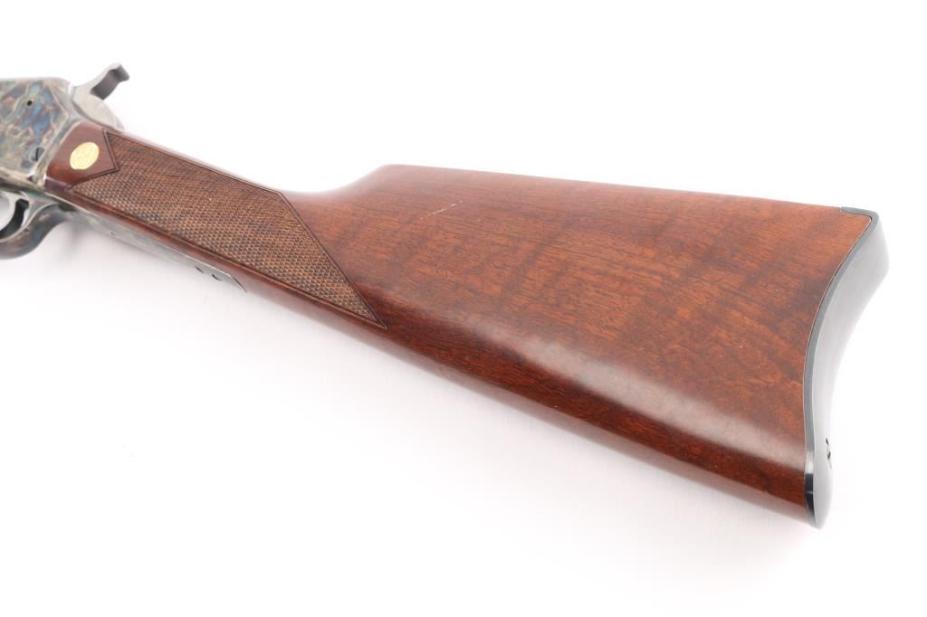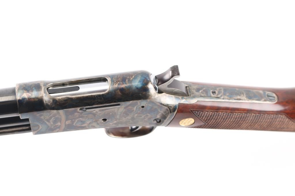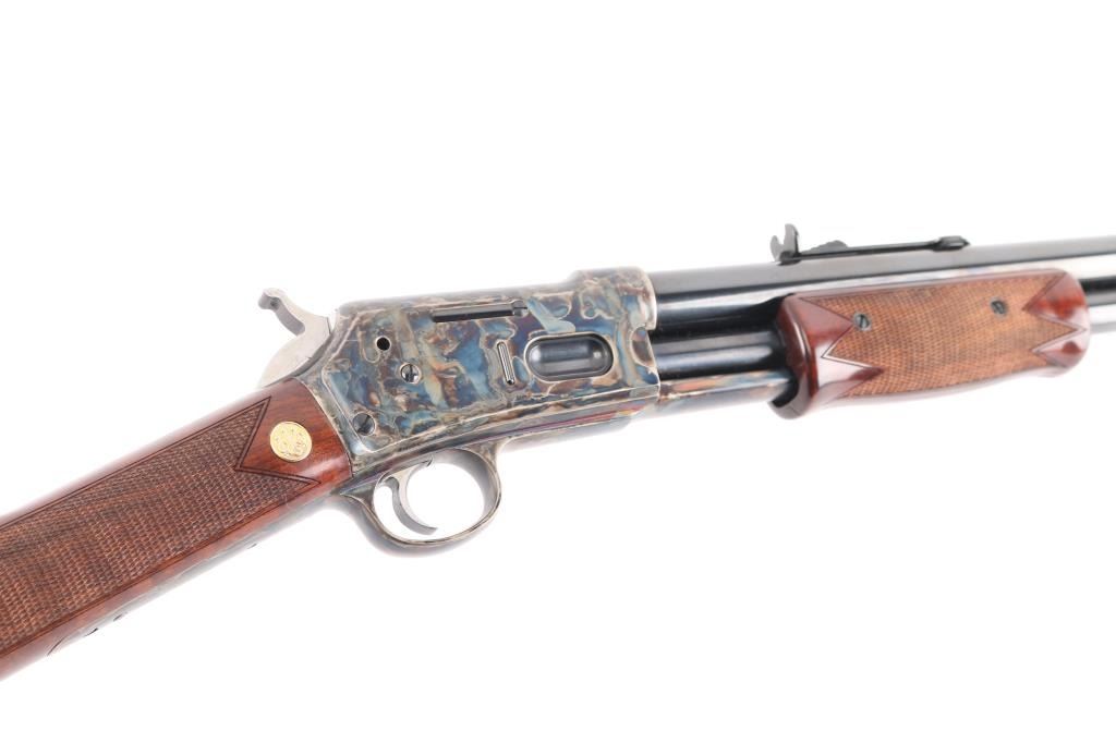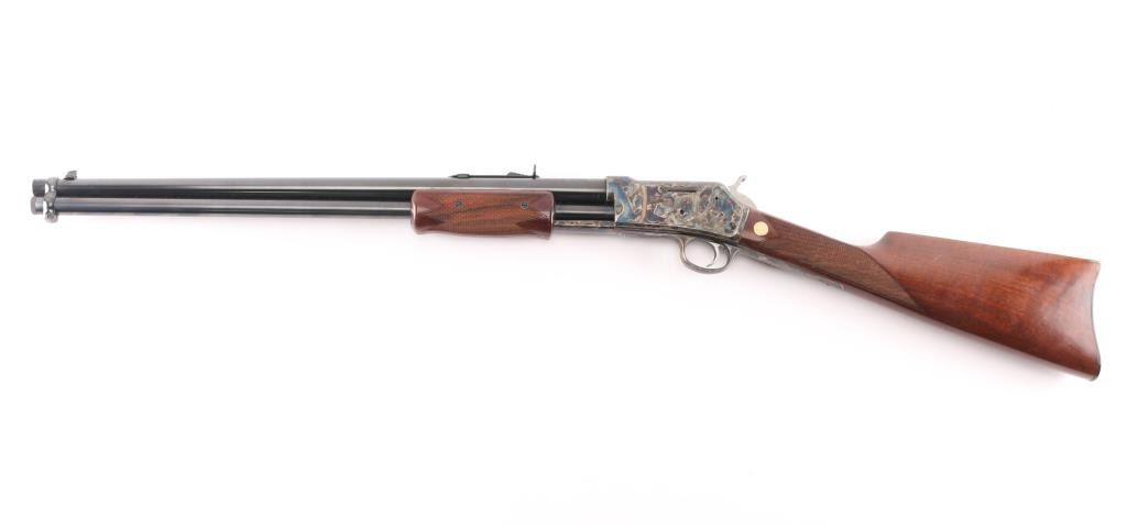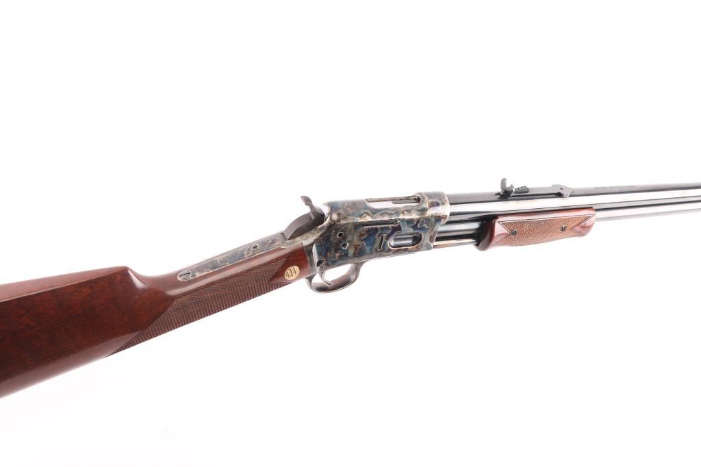 Beretta USA Corp. Gold Rush rifle manufactured by Uberti and imported by Beretta during the period between 2006 and 2008. Patterned after the Colt Lightning rifle, the Gold Rush differs mainly in its modernized feeding system. Produced in 2006 and still looks new. Slide action, 20 barrelwith blade front, semi-buckhorn rear sights, full length tube magazine. 13 rd capacity, high polish blue finish with case colored receiver and triggerguard. High gloss, checkered wood stock and pump grip, gold toned Beretta medallions inletted in the wrist. Hammer has polished sides. Bore is excellent/bright, slide action is crisp/tight, wood and metal finishes are excellent. Rifle has seen very little if any use. Getting hard to find.NRA Condition-Excellent. Modern Firearm.