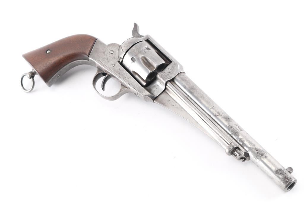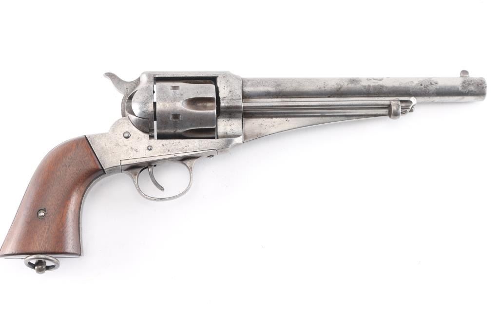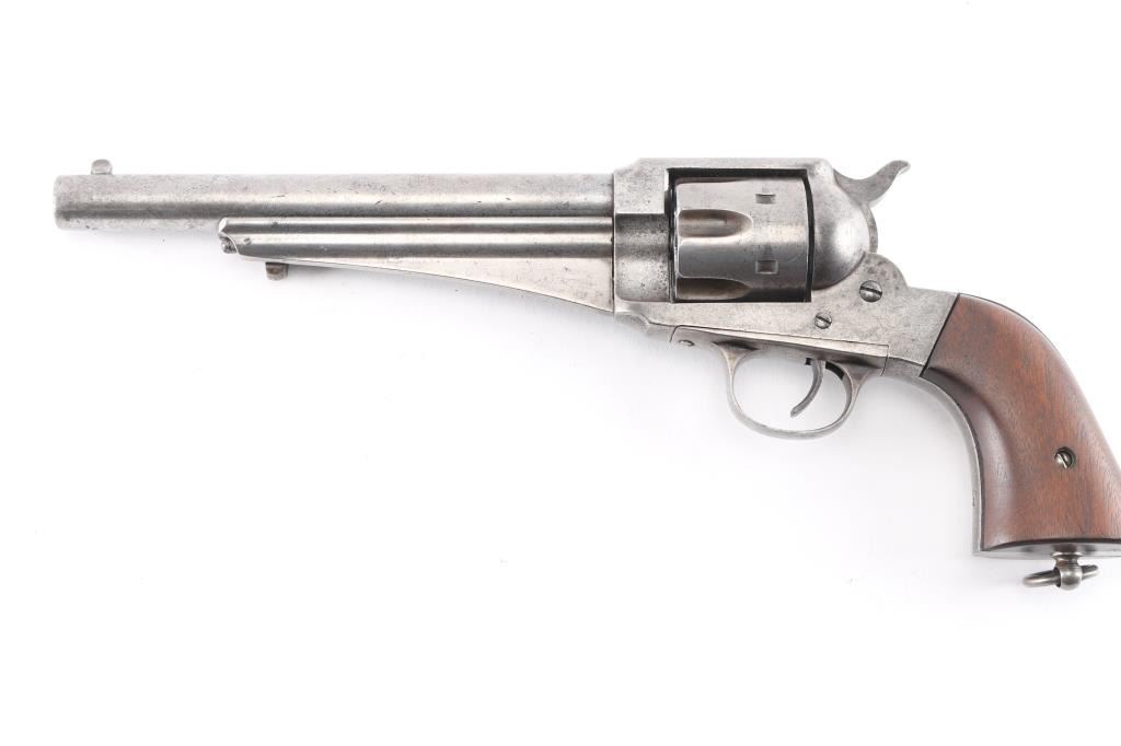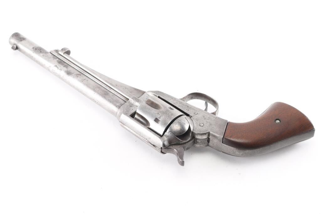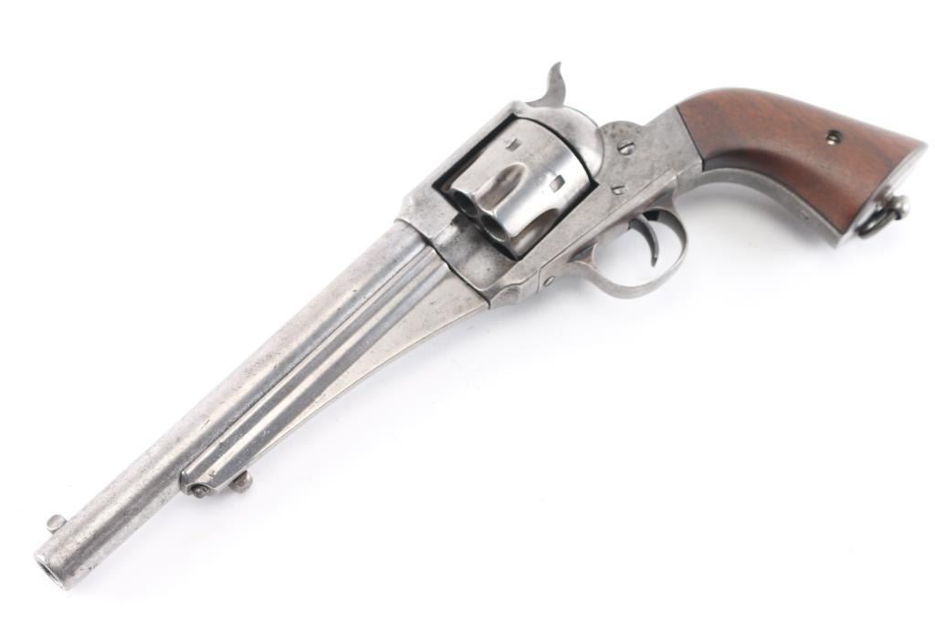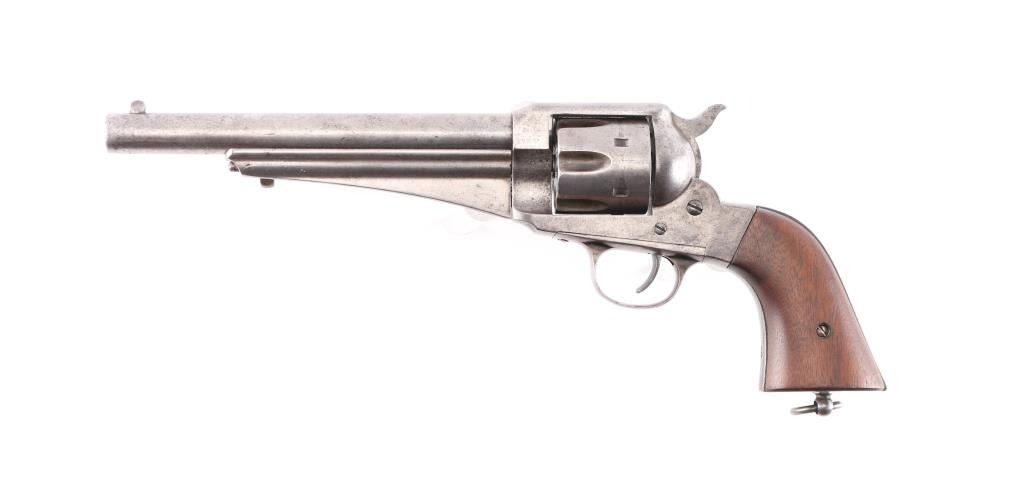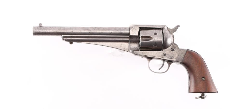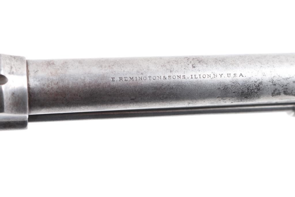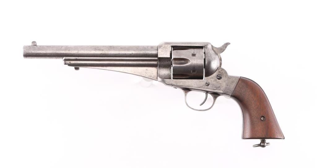 Antique single action revolver chambered in .44-40 Winchester, manufactured circa 1875-1889. Features a 7 1/2" round barrel, ejector rod with large webbed housing, pinched post front sight, u notched rear sight, fluted six-shot cylinder, smooth wide trigger, hammer with knurled spur & integral firing pin, monolithic frame/grip frame with lanyard ring on the butt and two-piece smooth wood grips. Bore retains traces of rifling, shows scattered light pitting. Revolver is in the white with some light brown patina with scattered areas of light pin-prick pitting, a couple of areas of deeper pitting on the upper right barrel. Markings are " E. Remington & Sons Ilion N.Y. U.S.A." on top of the barrel and "286" under the left grip. Grips are very good, good fit to frame. Action is smooth with good lock-up. The pinched front sight was used approximately from 1878-79.NRA Condition-Very Good. Antique Firearm.
