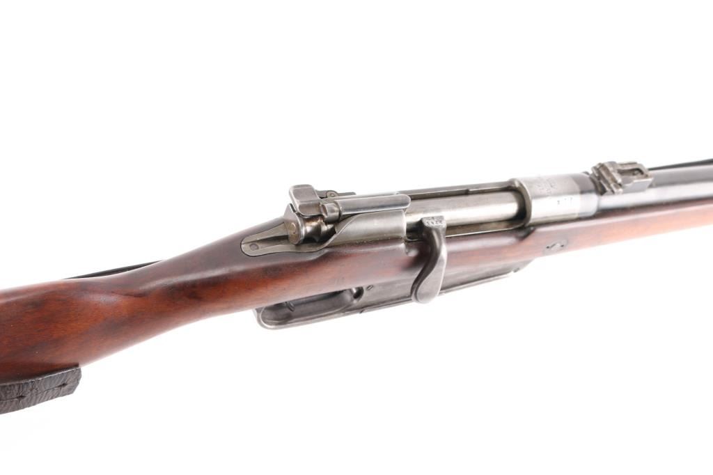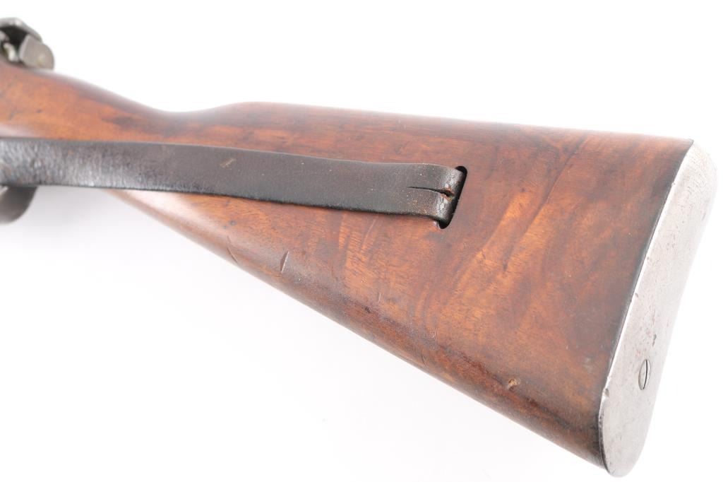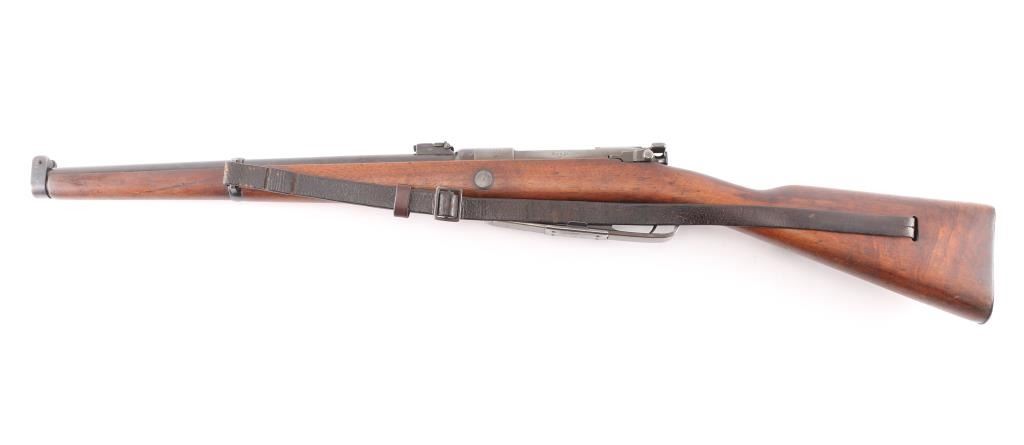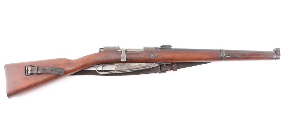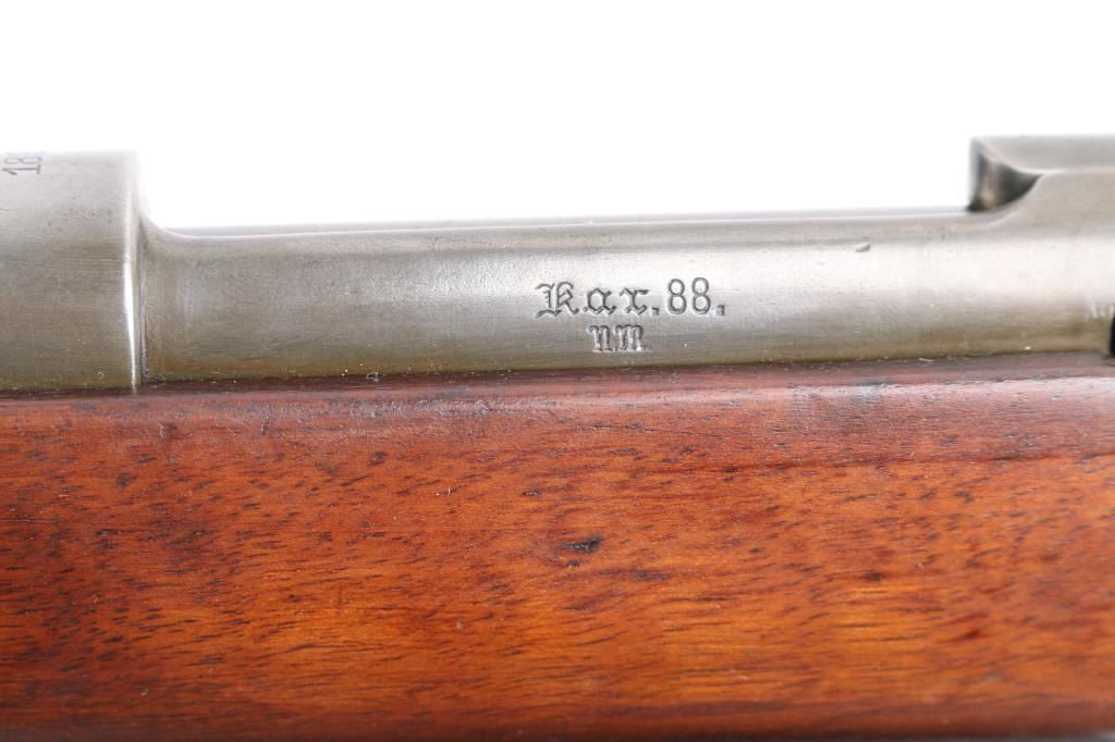 Rare German Pre-WWI KAR 88 Cavalry Carbine by ERFURT - Dated 1891.Unit stamped on nose cap "B.6. CH. 4108". B. Ch. Means Bayerische ChevauLegers : Bavarian Light Horse. Bavarian 6th Chevaleuger Regiment, weapon 1408. This Cavalry Carbine was made at the Arsenal outside Berlin ERFURT and is dated 1891. The Barrel, Receiver, Trigger Guard, bolt, safety lever and nose guard are marked with matching serial numbers. The carbine has an 18" barrel, knurled bent spoon bolt handle. 5 rd box magazine. Receiver rail marked " Kar 88 N.M." (Erfurt), rear sight marked "7.9". It bears an S marked over the chamber to indicate modification for the S-PATRONE cartridge introduced in 1903. This short carbine was intended for use by cavalry units. The bore is very good/bright, strong rifling, with some light frosting in the grooves, smooth action, all markings are clear, wood is excellent, finish is about 60% with handling wear on the magazine, receiver and bolt handle. Original period sling attached. A great unit marked Cavalry Carbine.NRA Condition-Fine. Antique Firearm.