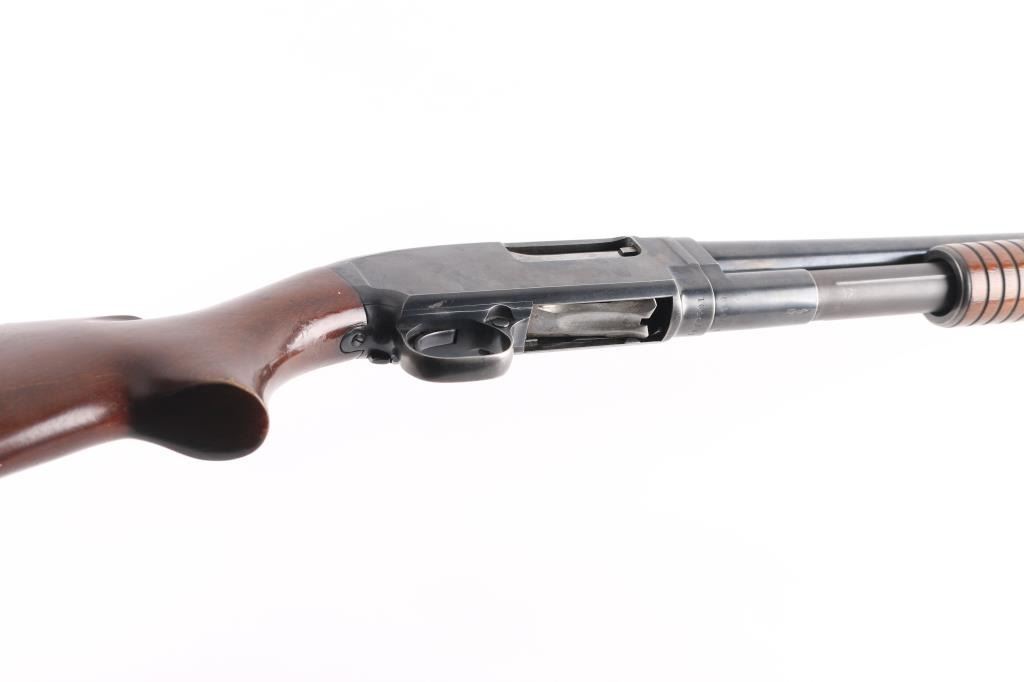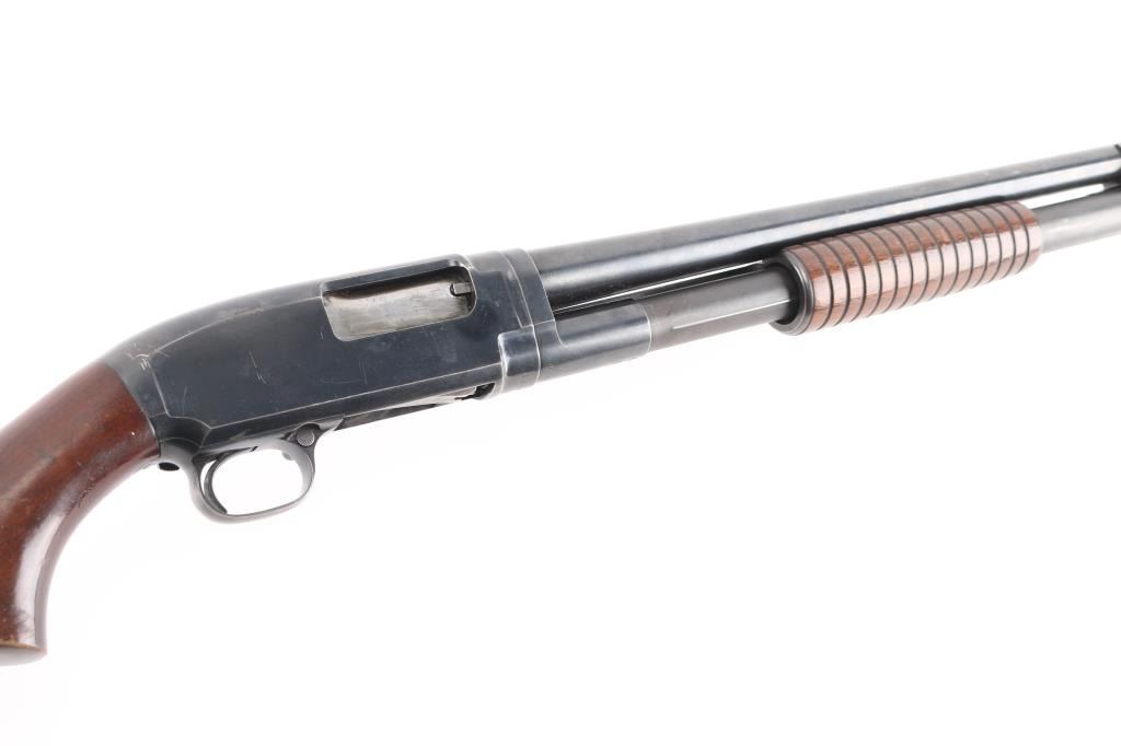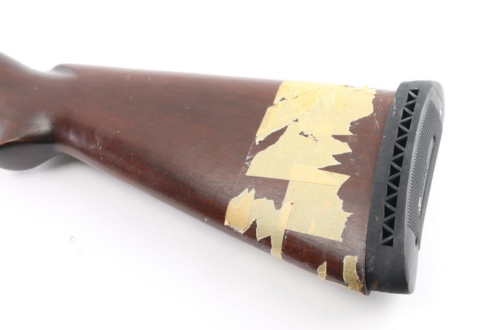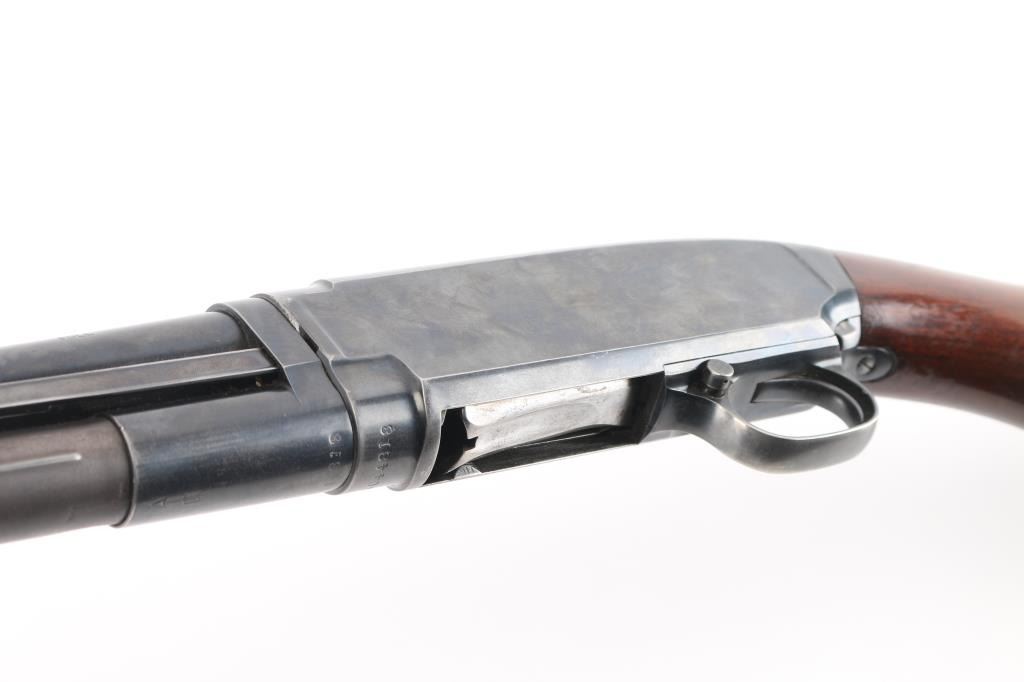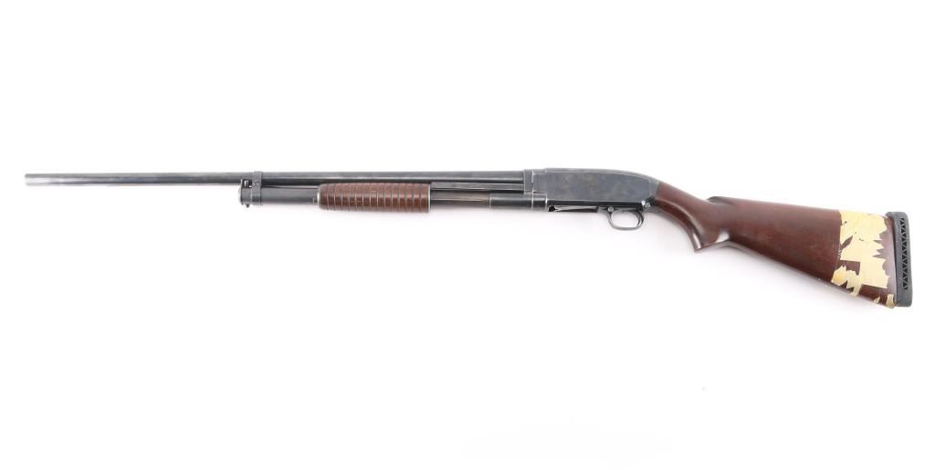 American made pump action shotgun for 16 gauge shotshells in 2 3/4" chamber, circa 1946. Features a 28" blued barrel with an aluminum front bead sight, smooth trigger, large checkered push button safety. Two piece wood stocks with grooved slide handle and walnut butt stock with offset black vented rubber recoil pad. Numbers match on barrel and receiver. Retains approximately 75% of its finish with handling/friction wear on the mag tube and edges. Wood is good sound with minor scratches/dings there is some old, dried out masking tape wrapped around the lower buttstock, should keep up well with some Goo-Gone. Bore is very good and bright. Action is tight. LOP is 14 1/2". Fixed choke is marked FULL on the barrel.NRA Condition-Good. C&R firearm.